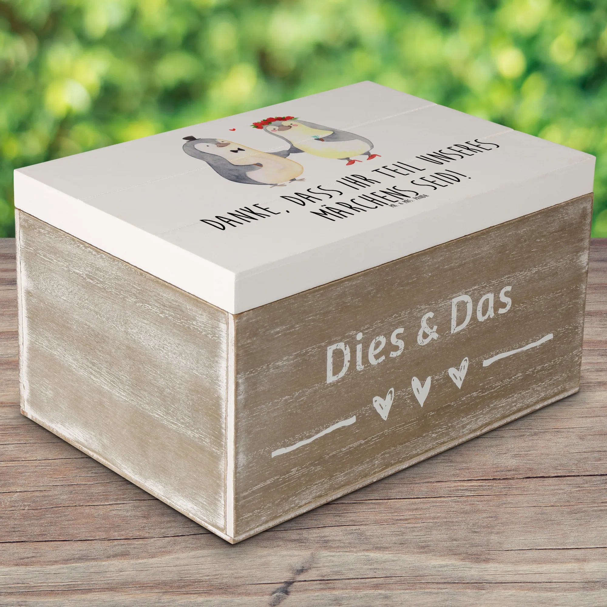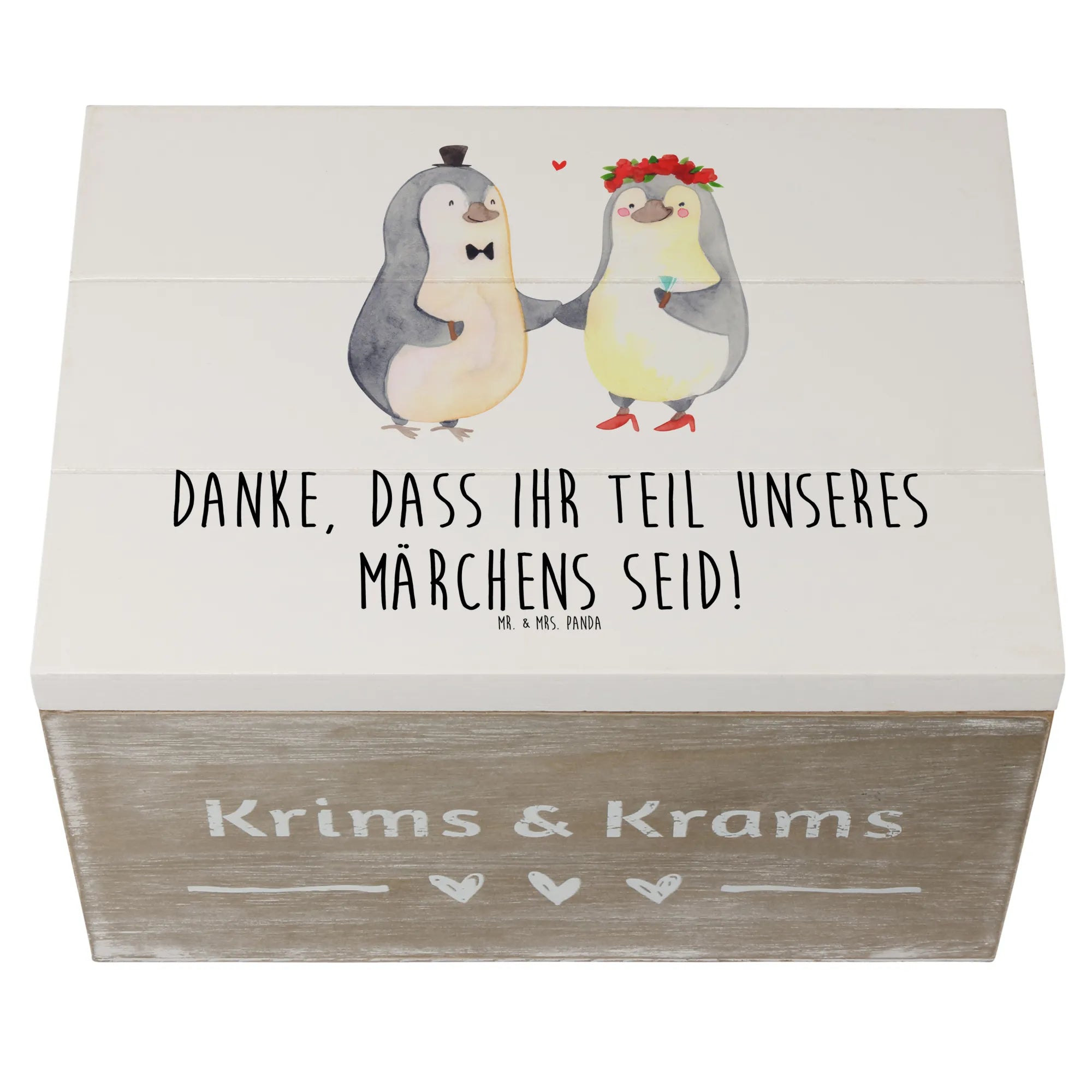Entdecke unsere wunderschöne Holzkiste mit dem bezaubernden Motiv "Gastgeschenke" aus der einzigartigen Hochzeitskollektion von Mr. & Mrs. Panda! Diese Erinnerungskiste ist nicht nur ein praktischer Aufbewahrungsort für all die wundervollen Schätze, die du an deinem besonderen Tag sammeln möchtest, sondern auch ein perfekt durchdachtes Geschenk für deine Hochzeitsgäste. Mit dem liebevollen Spruch "Danke, dass ihr Teil unseres Märchens seid!" vermittelt diese Kiste Dankbarkeit und Freude, die man mit seinen Liebsten teilen möchte.