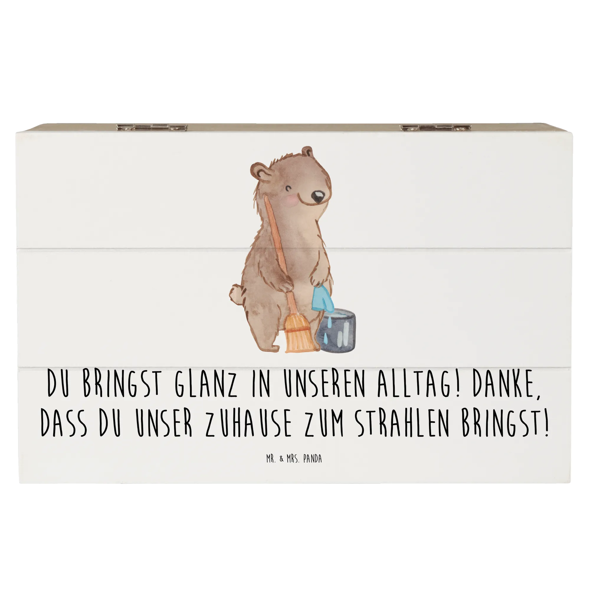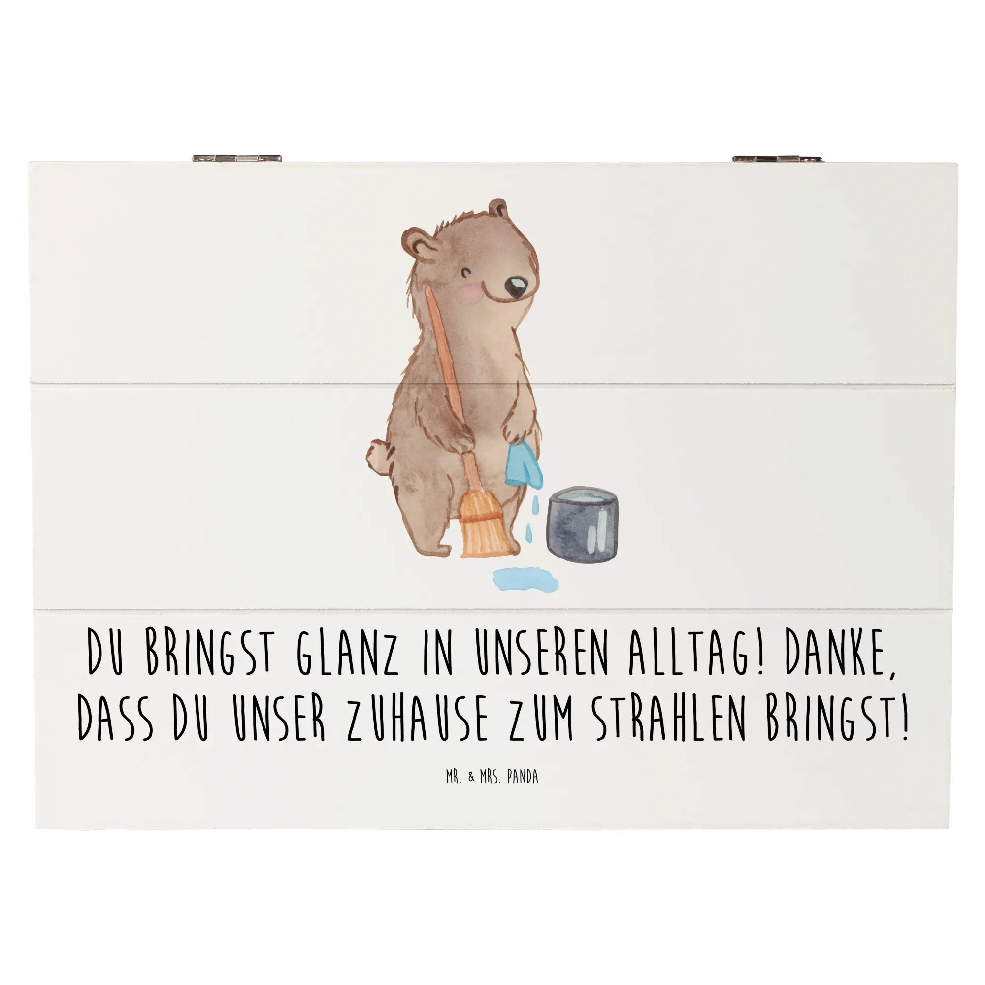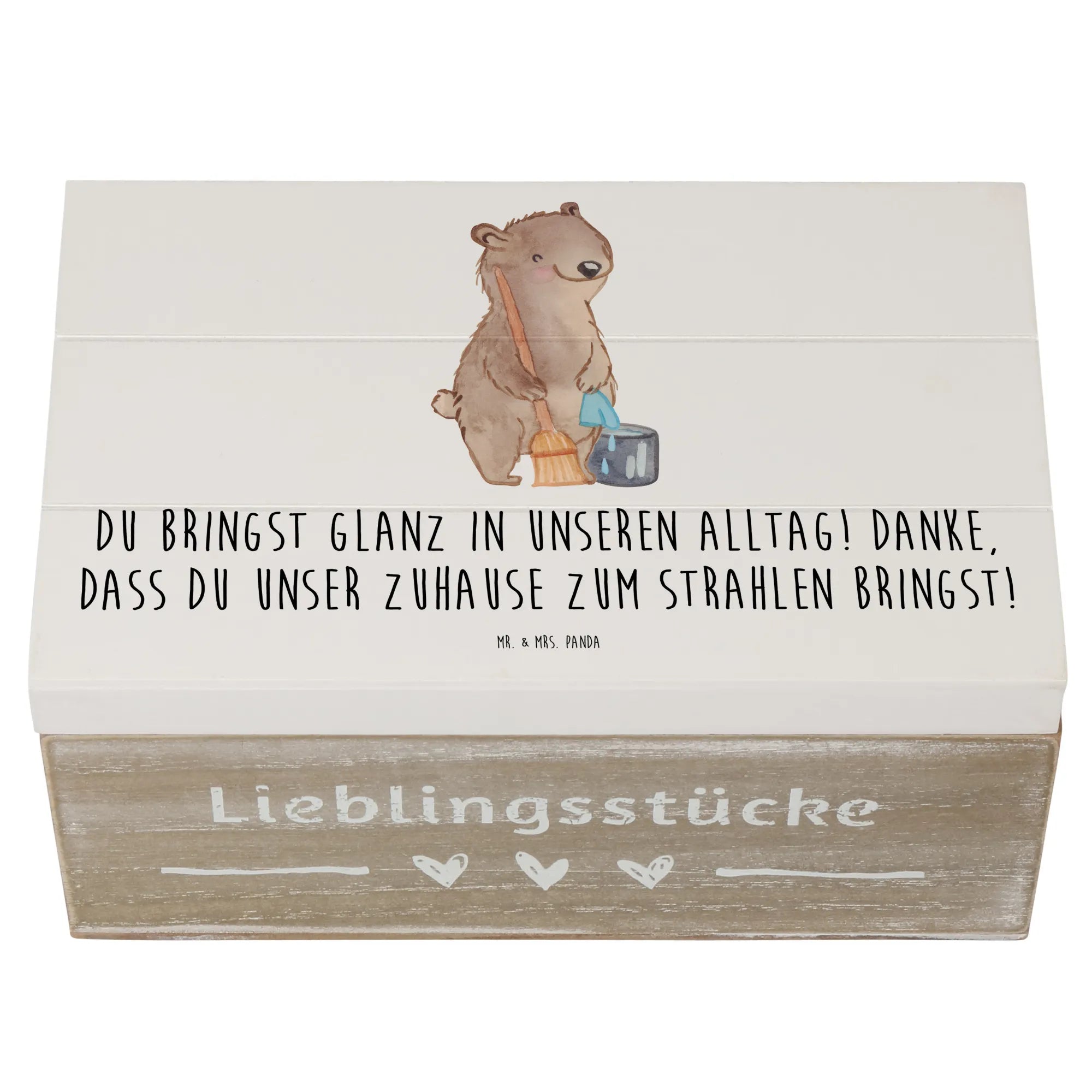 Die wunderschöne Holzkiste von Mr. & Mrs. Panda ist das perfekte Geschenk für jeden Anlass, bei dem du Dankbarkeit zeigen möchtest. Mit ihrem bezaubernden Motiv der Putzfrau und dem liebevollen Spruch "Du bringst Glanz in unseren Alltag! Danke, dass du unser Zuhause zum Strahlen bringst!" ist diese Kiste nicht nur eine praktische Aufbewahrungslösung, sondern auch ein liebevolles Dankeschön an Menschen, die einen besonderen Platz in deinem Leben einnehmen.