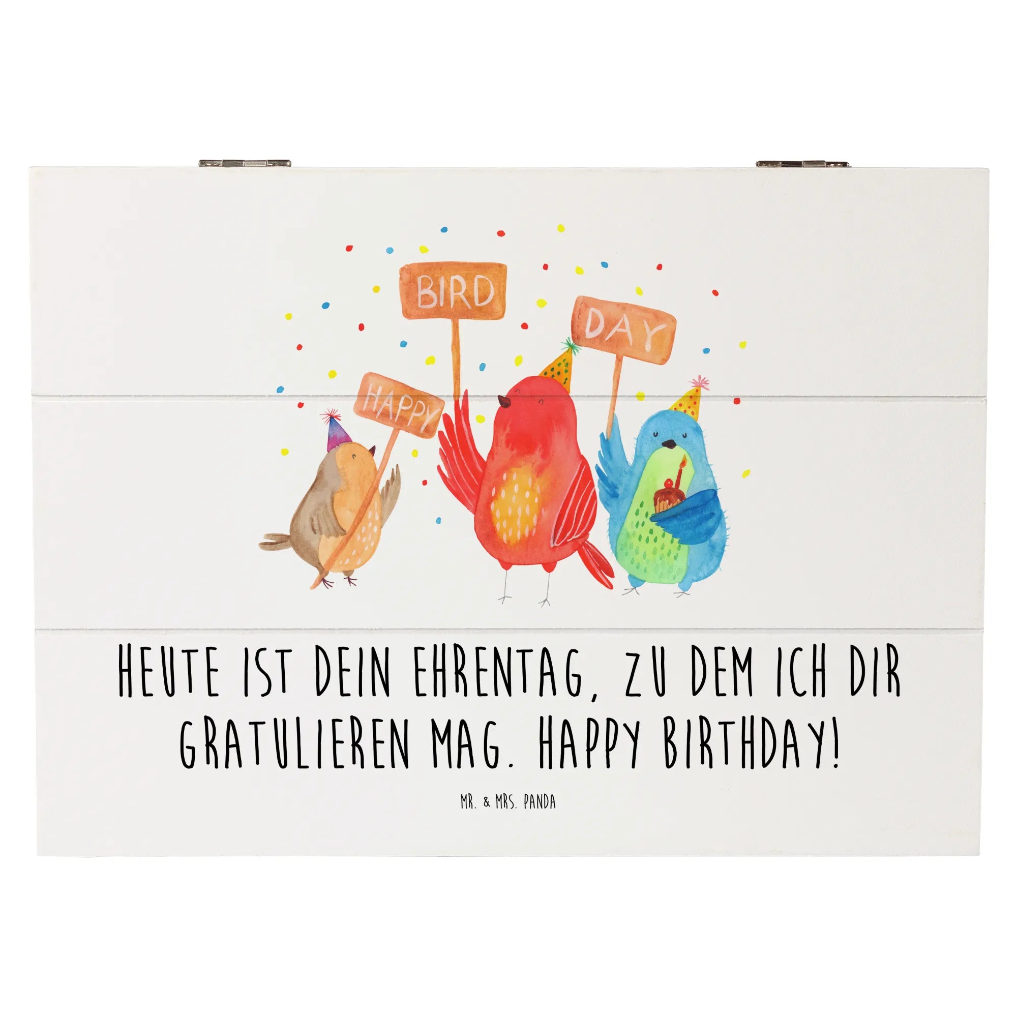 Die Holzkiste "Happy Birdday" von Mr. & Mrs. Panda ist das perfekte Geschenk für jeden Geburtstag. 🎉 Mit ihren fröhlichen, handgezeichneten Motiven, ziert sie stolz jede Feier. Unsere kleinen Vögel mit Partyhütchen sind echte Feierbiester, die die Geburtstagsstimmung zum Leben erwecken.