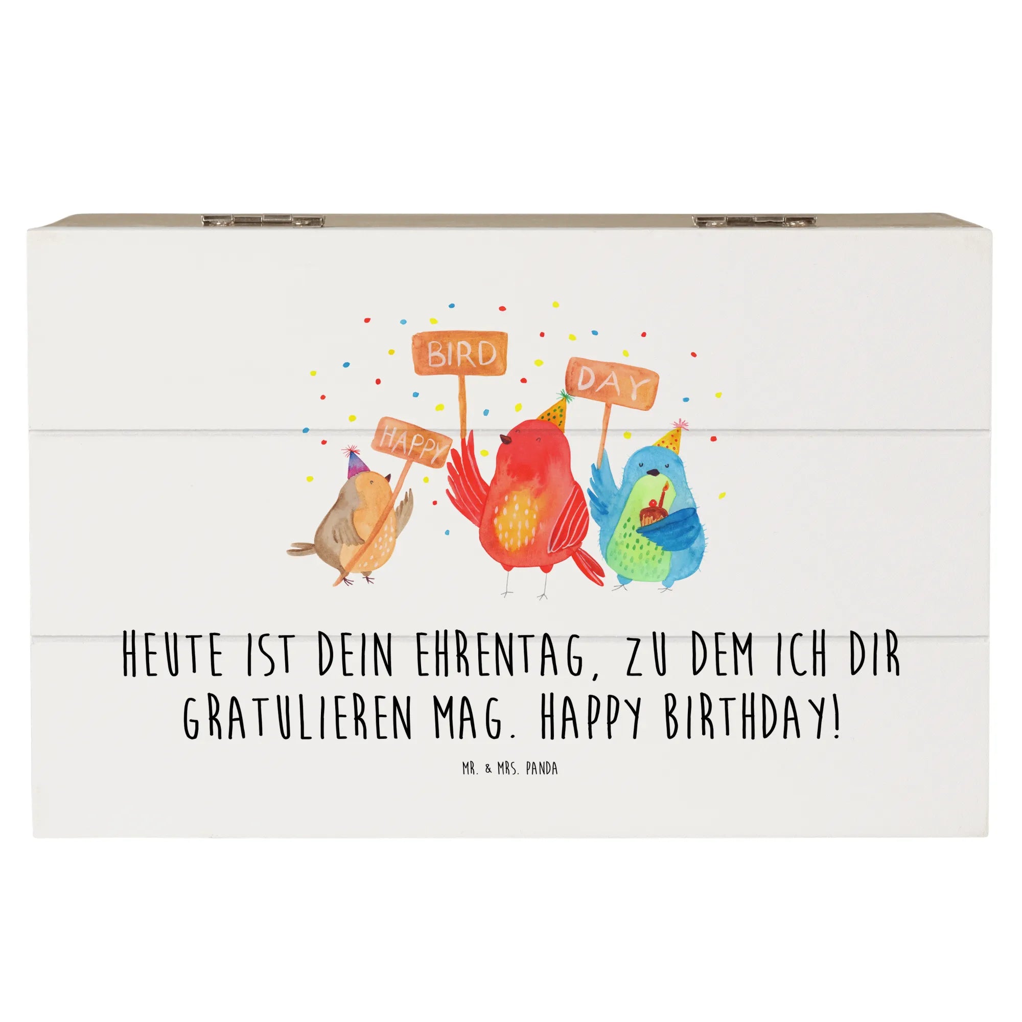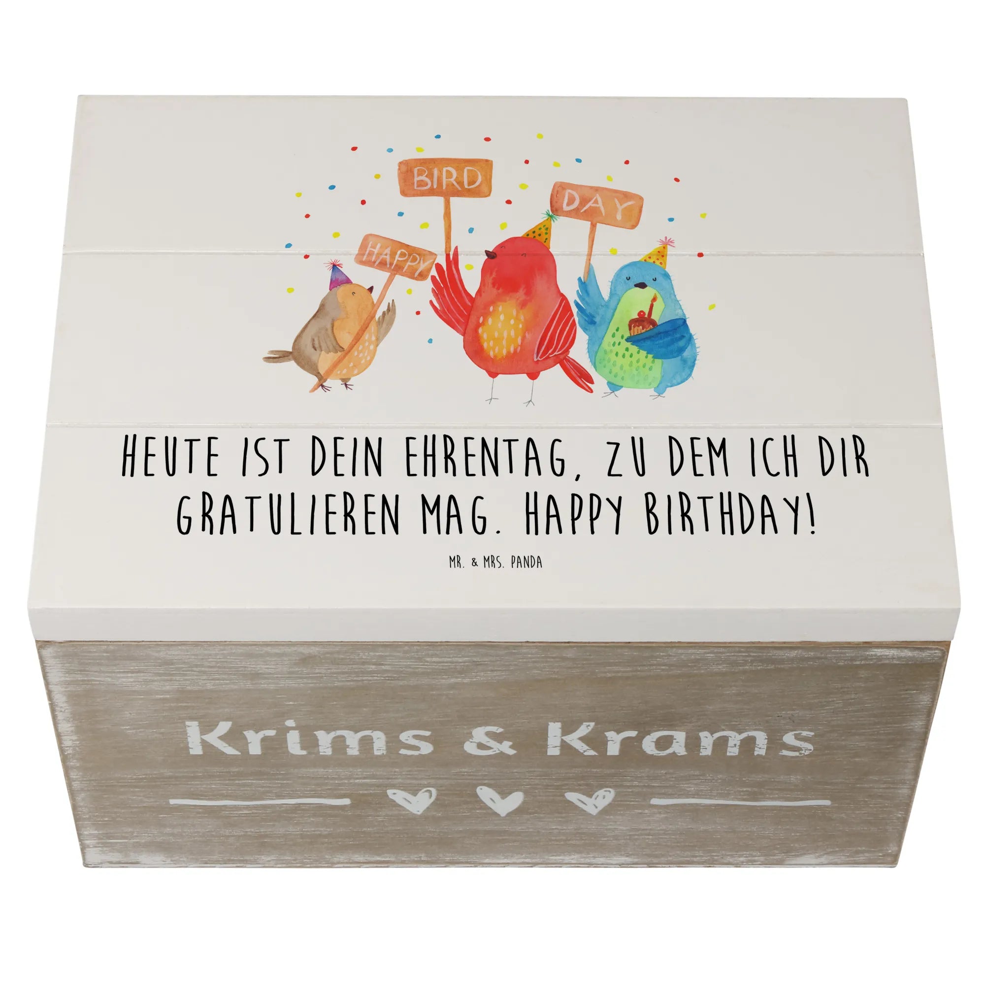 Entdecke die wundervolle Holzkiste mit dem süßen Motiv "Happy Birdday" von Mr. & Mrs. Panda!