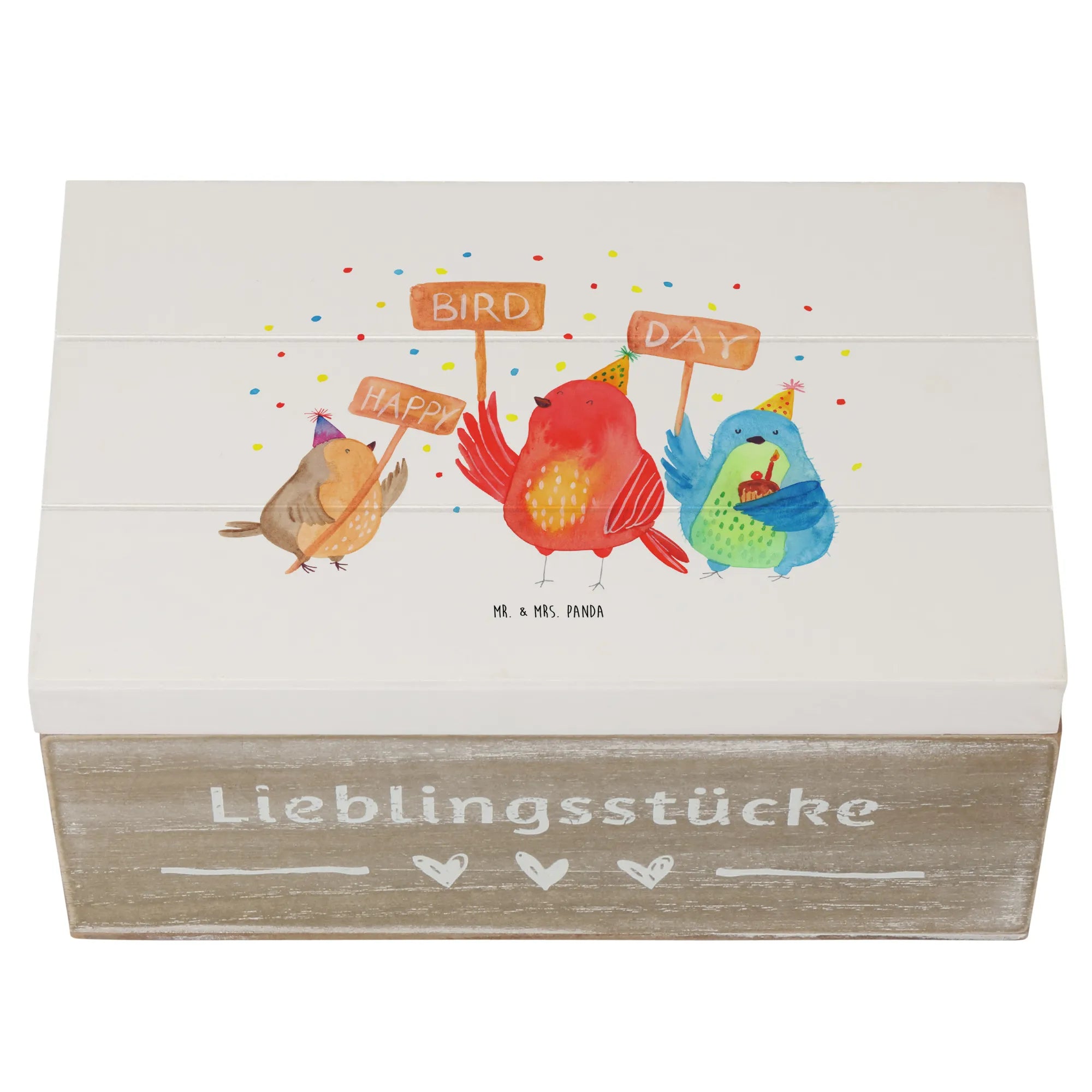 Entdecke die zauberhafte Holzkiste "Happy Birdday" von Mr. & Mrs. Panda – das perfekte Geschenk für jeden Geburtstagskind! Diese liebevoll gestaltete Kiste ist nicht nur ein Aufbewahrungsort für all deine wertvollen Schätze, sondern auch eine Erinnerungsbox, die mit einem fröhlichen Motiv von drei kleinen Vögeln, die begeistert eine Geburtstagsparty feiern, gestaltet ist. Die Vögel tragen bunte Partyhütchen und umgeben sich mit Konfetti, was die lebendige Atmosphäre eines unvergesslichen Geburtstags widerspiegelt.