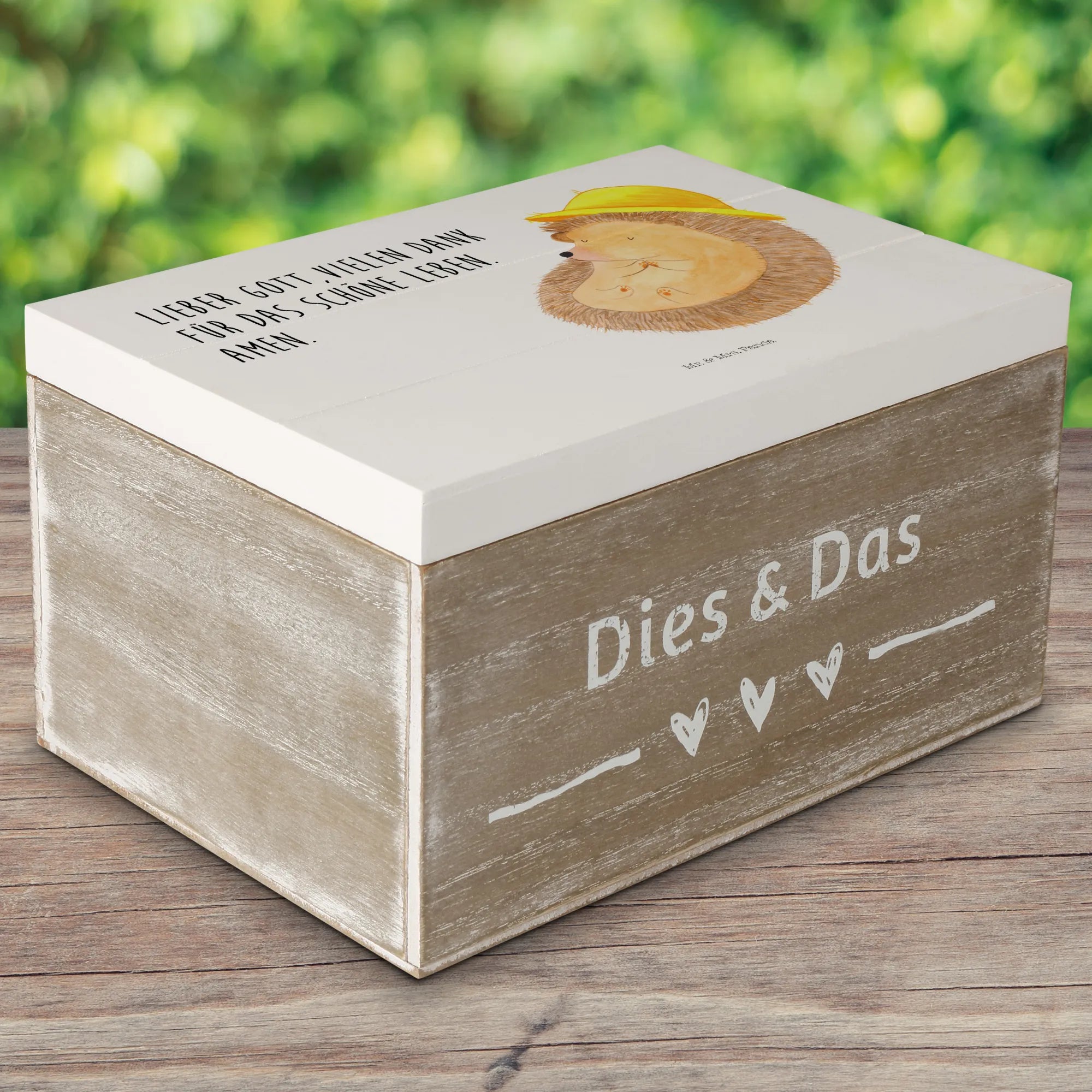 Das bezaubernde Motiv eines kleinen Igels, der seine Händen zum Gebet faltet, erinnert uns daran, wie wichtig Dankbarkeit im Leben ist. Der Slogan "Lieber Gott, vielen Dank für das schöne Leben. Amen." verleiht der Kiste eine besondere Note.