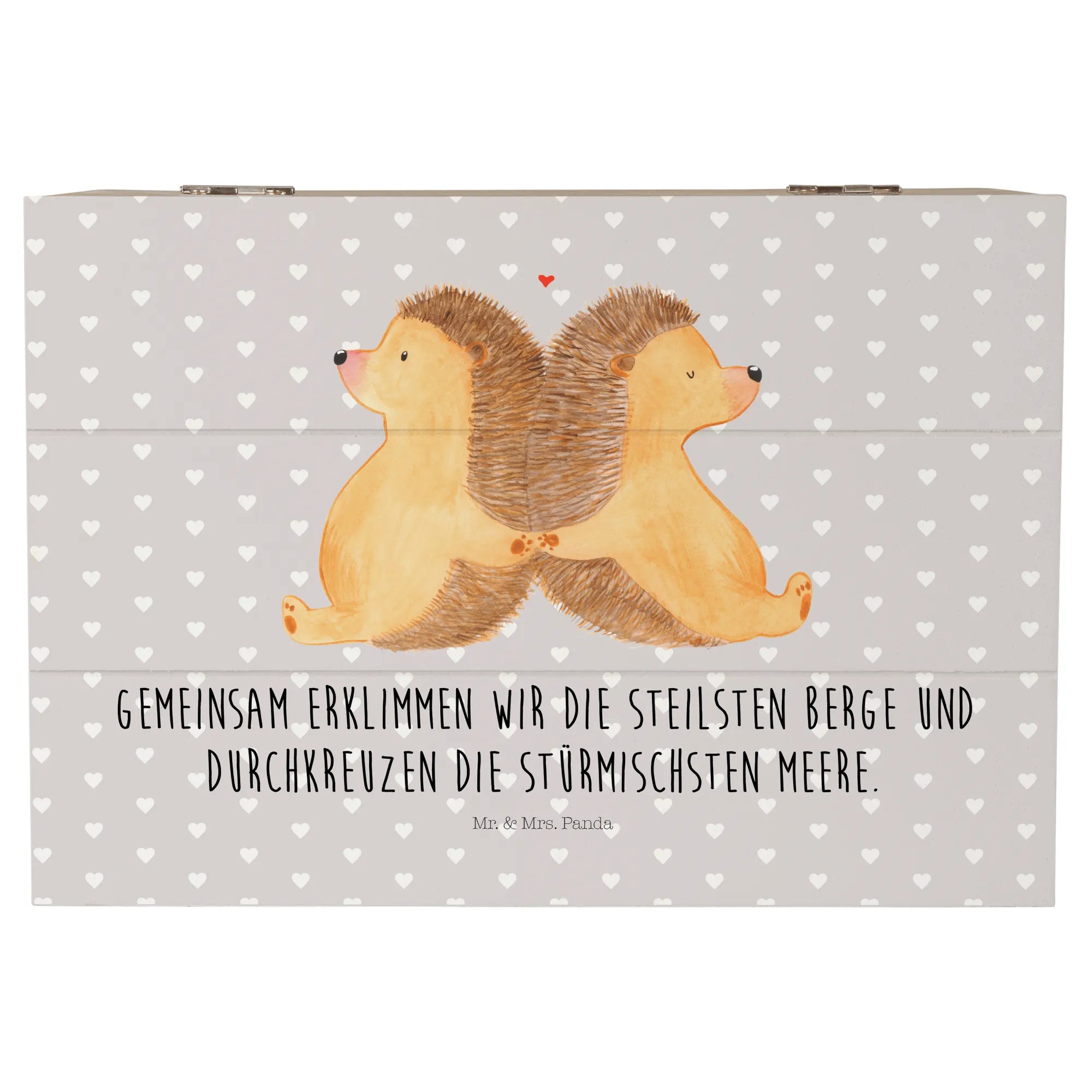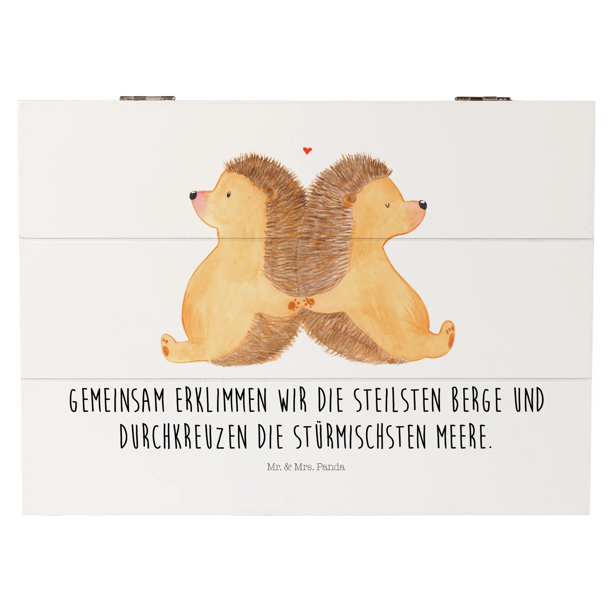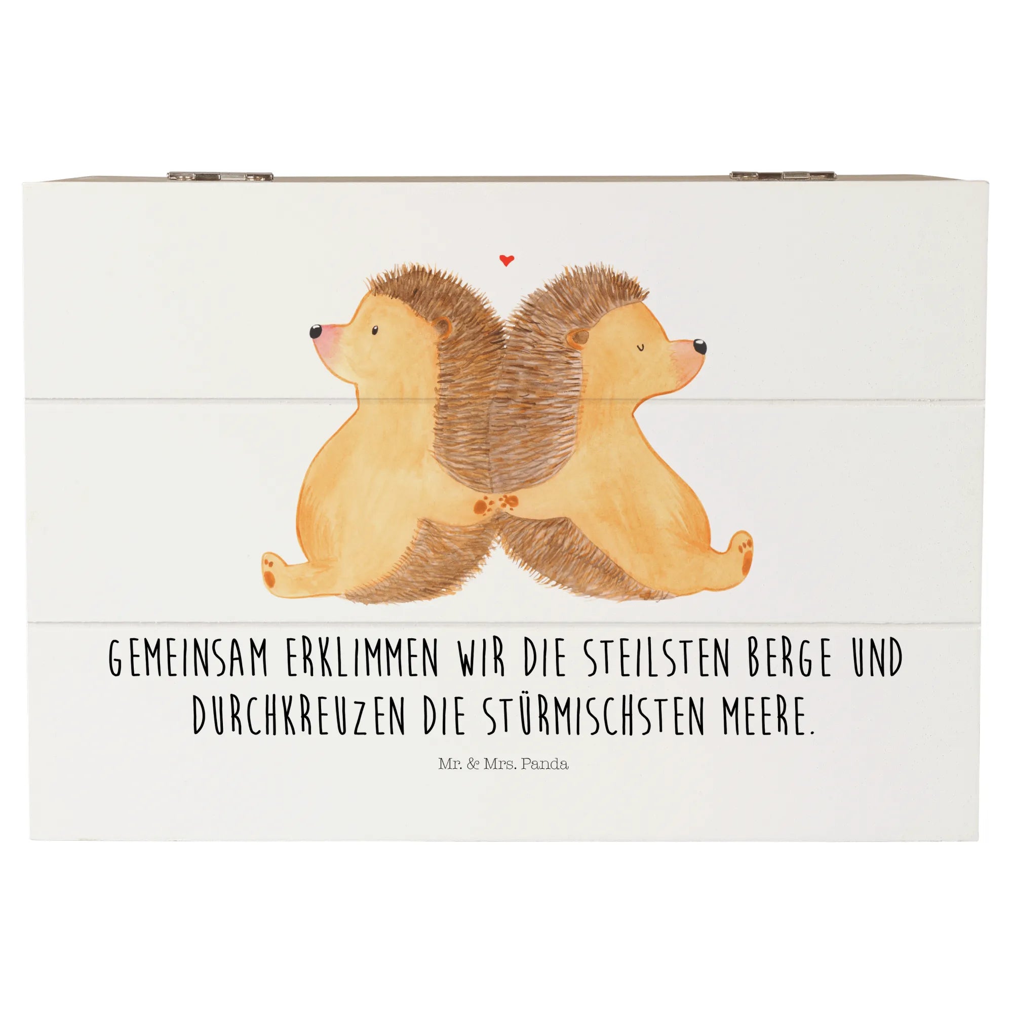 Entdecke die zauberhafte Holzkiste mit dem Motiv "Igel händchenhaltend" von Mr. & Mrs. Panda! Diese wunderschöne Kiste ist das perfekte Geschenk für Paare und Verliebte, um gemeinsame Erinnerungen aufzubewahren.