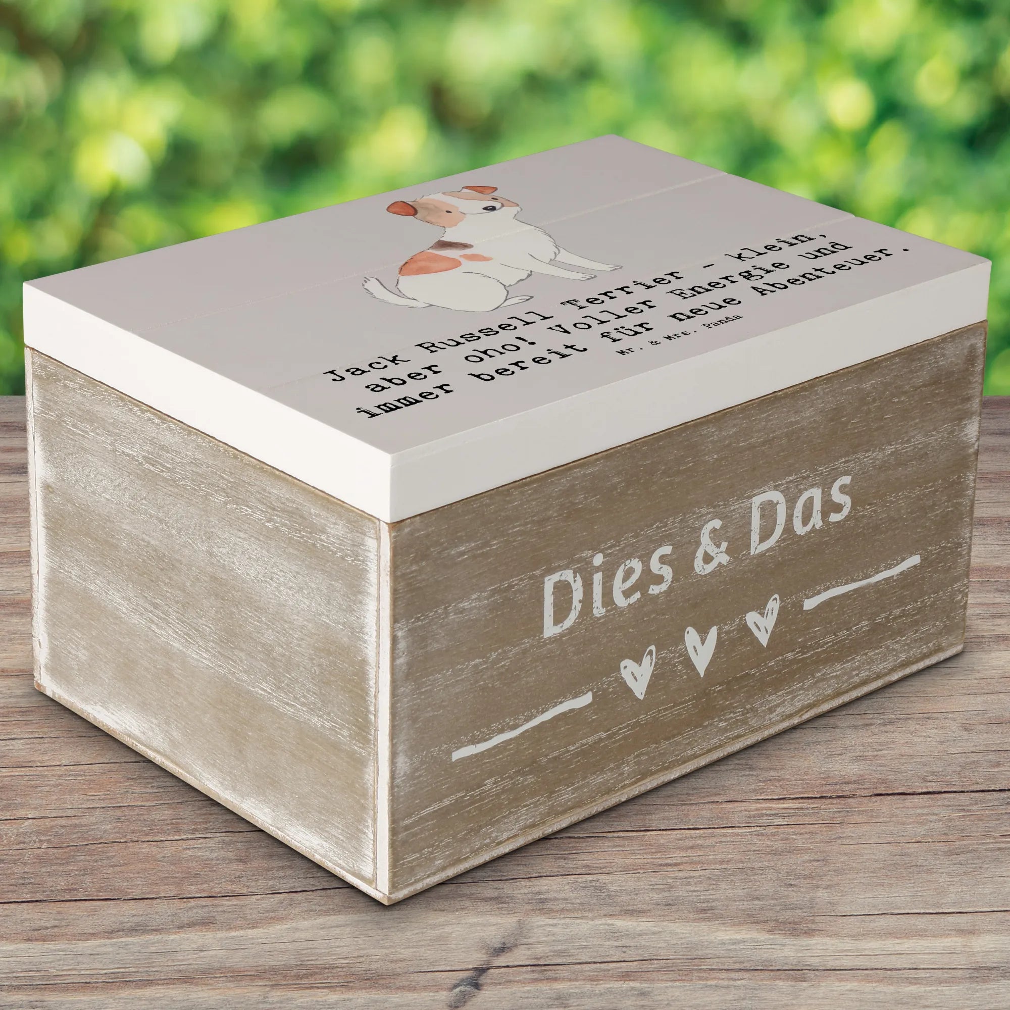 Die Hunderassen Kollektion von Mr. & Mrs. Panda bringt die süßesten Hunde aller gängigen Rassen auf wundervolle Art und Weise zusammen und überzeugt mit ihren niedlichen Sprüchen. Lass die Jack Russell Terrier Holzkiste Deinen Raum verschönern und gleichsam zu einem Sammelort für unvergessliche Momente werden. Diese künstlerisch gestaltete Erinnerungskiste ist perfekt für alle, die ihre Schätze stilvoll aufbewahren möchten.