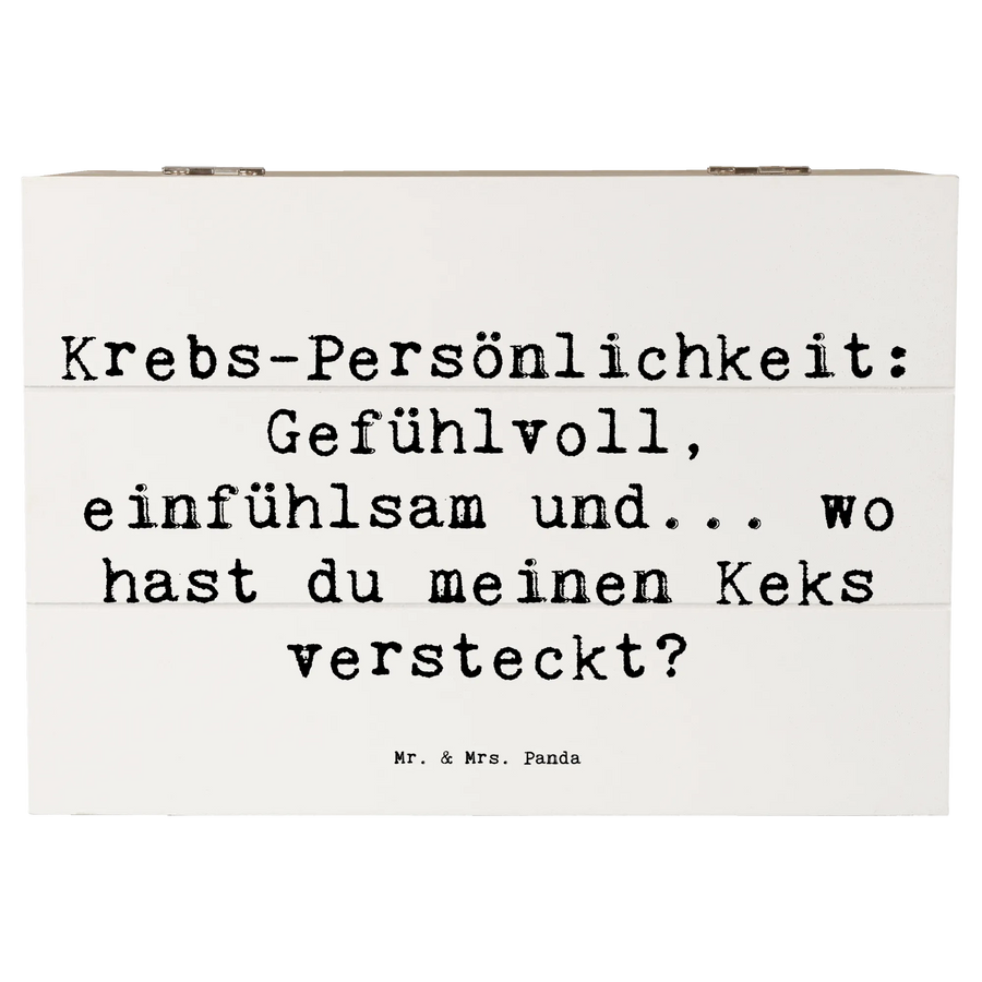 Eine liebevolle Holzkiste für Herzmenschen: Die Holzkiste Krebs von Mr. & Mrs. Panda ist die perfekte Kombination aus Funktion und Persönlichkeit. Mit dem charmanten Spruch „Krebs-Persönlichkeit: Gefühlvoll, einfühlsam und... wo hast du meinen Keks versteckt?“ bringt diese dekorative Schachtel ein Lächeln in jeden Raum und passt ideal zu Menschen, die ihr Sternzeichen mit Stolz und Humor tragen.