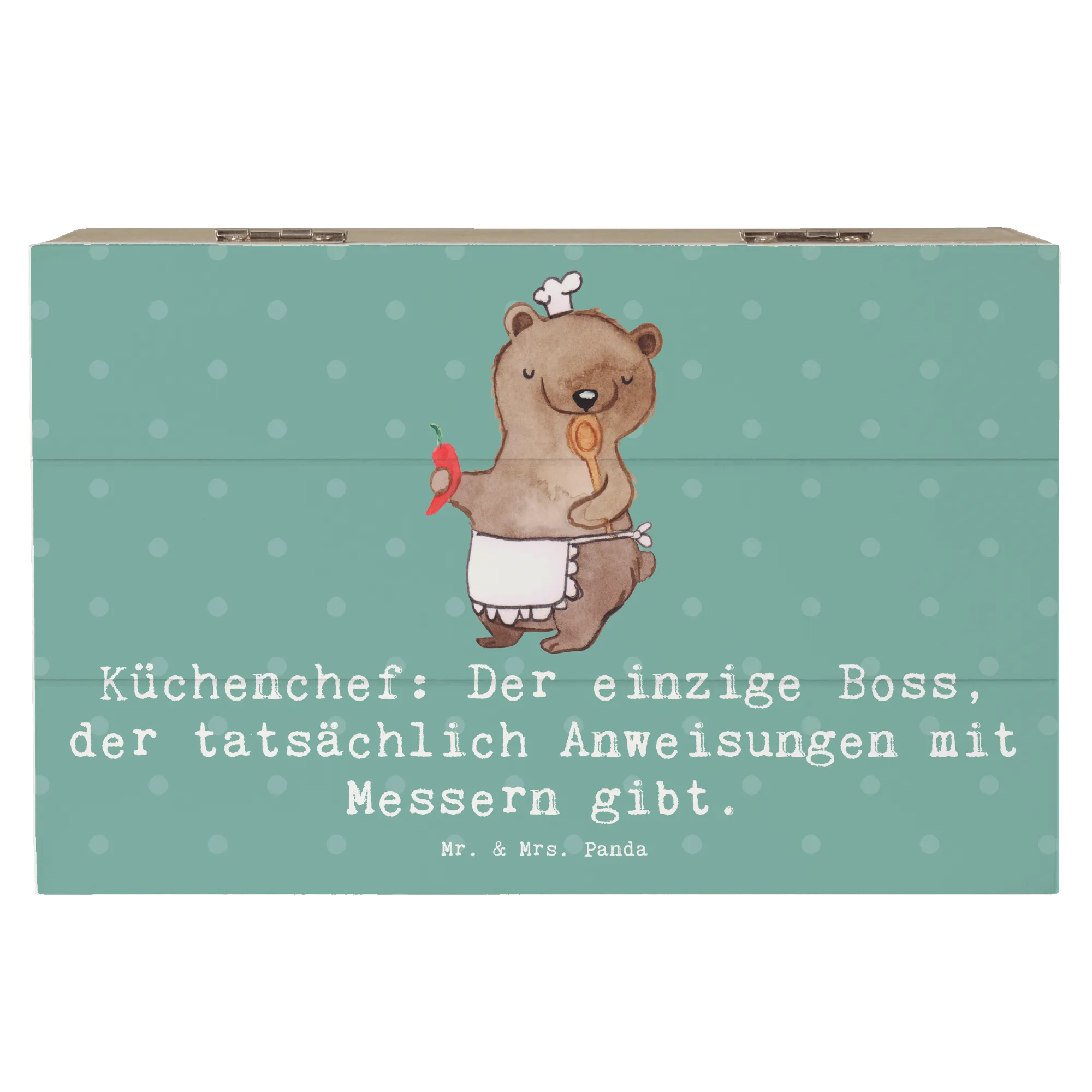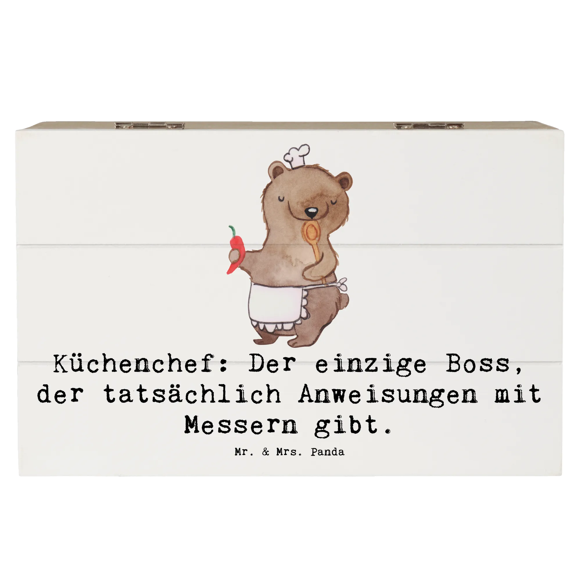 Die Holzkiste "Küchenchef" von Mr. & Mrs. Panda ist das perfekte Geschenk für alle leidenschaftlichen Köche und Hobbyköche da draußen! Mit dem liebevollen Motiv und dem witzigen Spruch "Küchenchef: Der einzige Boss, der tatsächlich Anweisungen mit Messern gibt." bringst Du nicht nur ein Lächeln auf die Gesichter Deiner Liebsten, sondern auch ein kleines Stückchen Humor in ihre Küchen.