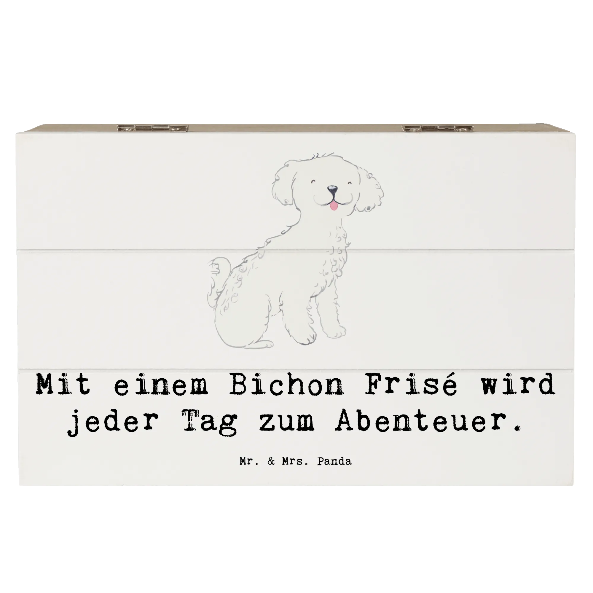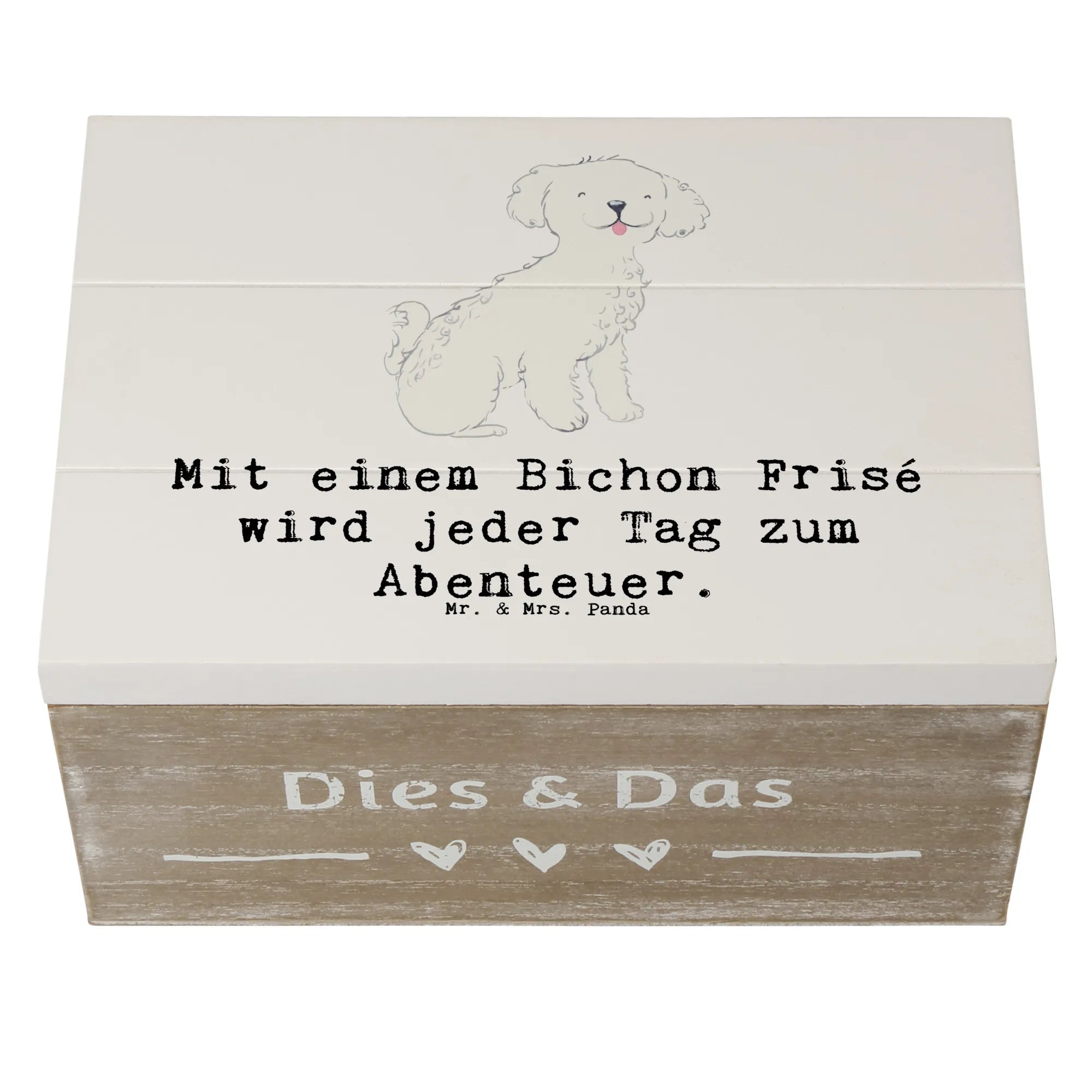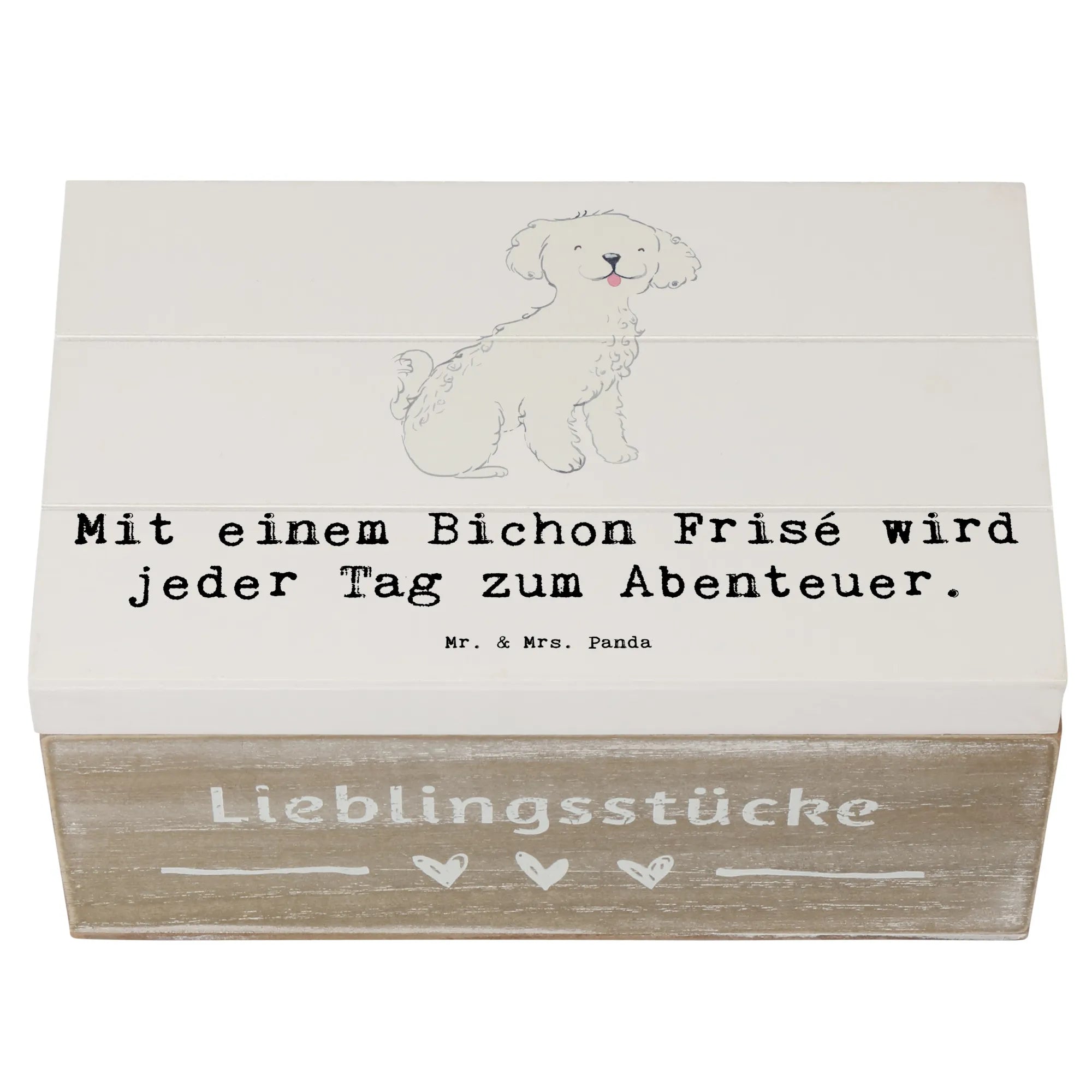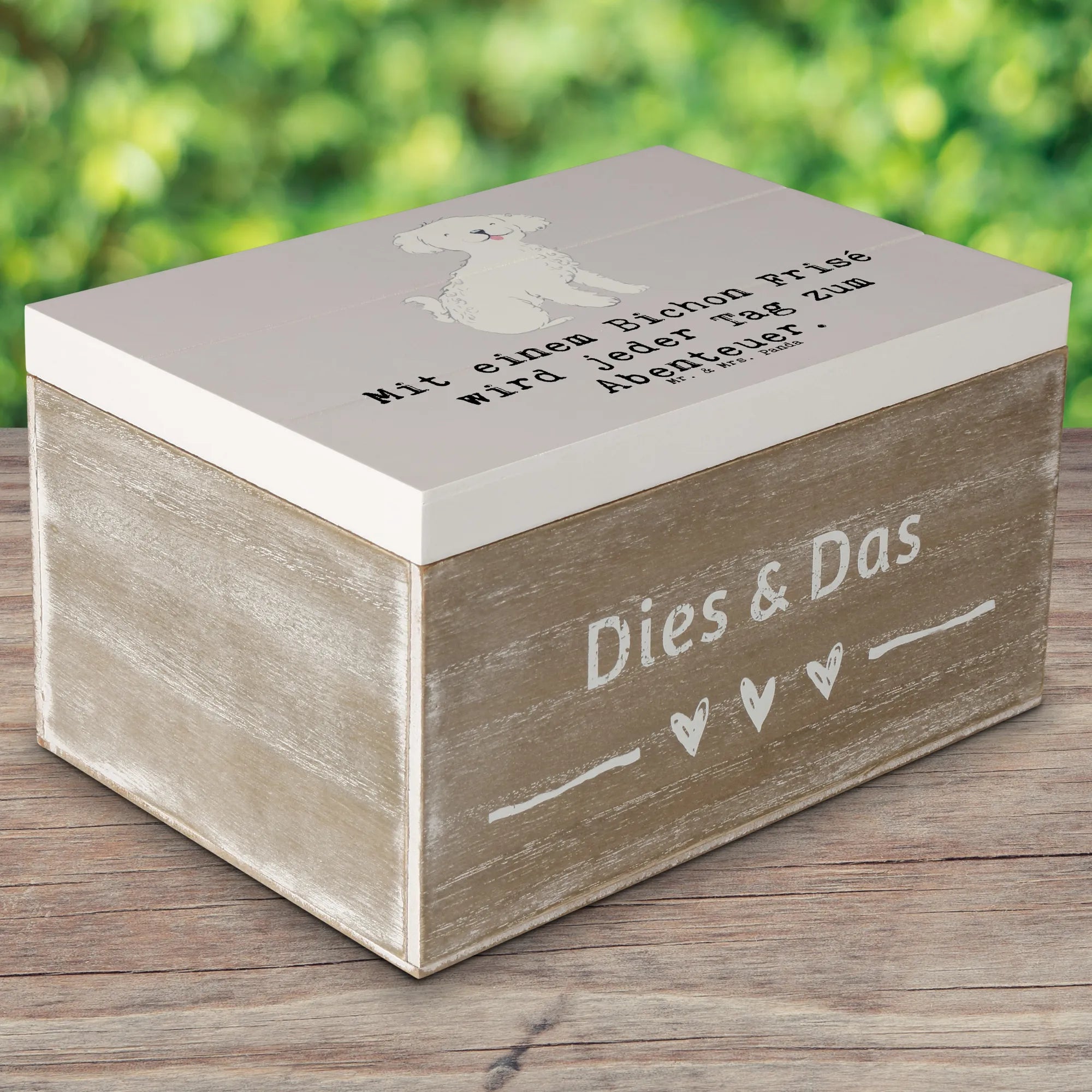 Ob Du Erinnerungen an die Kindheit, Fotos oder kleine Schätze aufbewahren möchtest, diese Erinnerungskiste bietet ausreichend Platz und sieht dabei fantastisch aus. Konzipiert mit dem süßen Motiv des Bichon Frisé und dem inspirierenden Spruch \\"Mit einem Bichon Frisé wird jeder Tag zum Abenteuer.\\", eignet sie sich ideal als Dekokiste oder Geschenkdose.