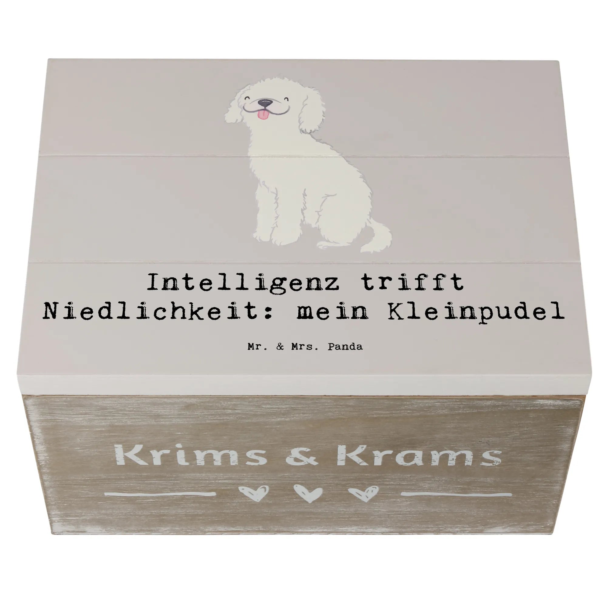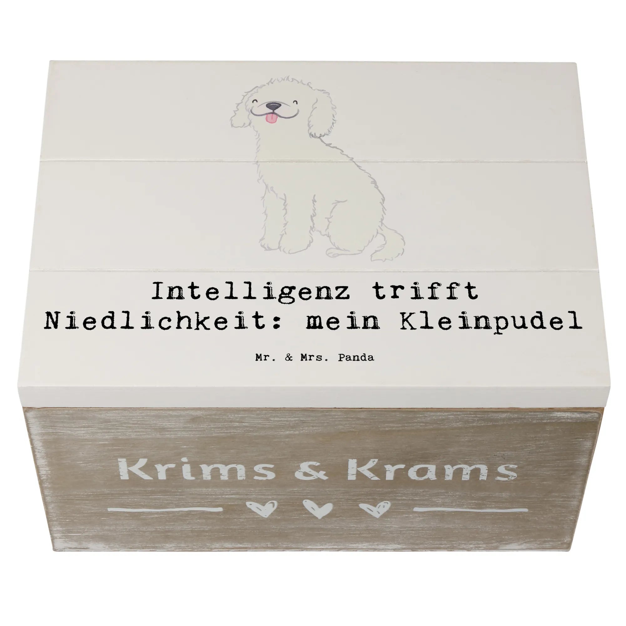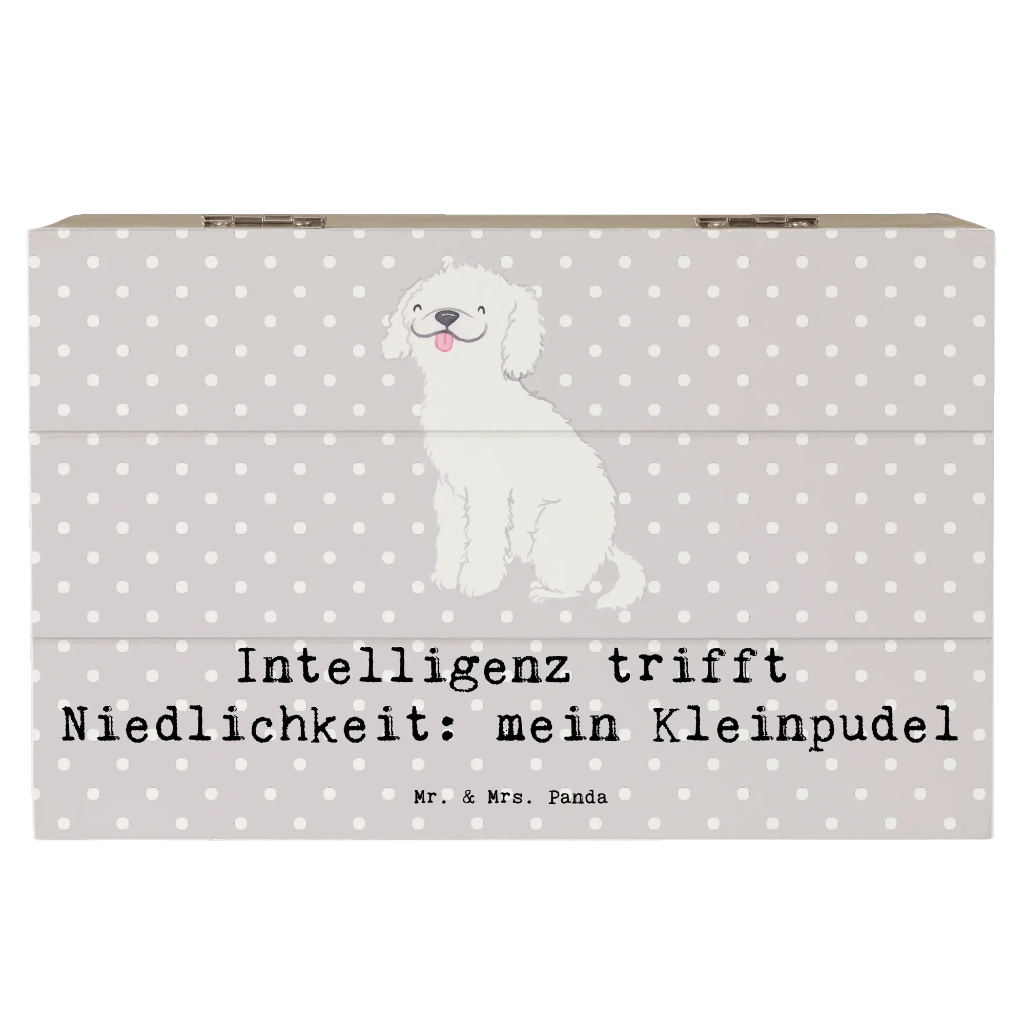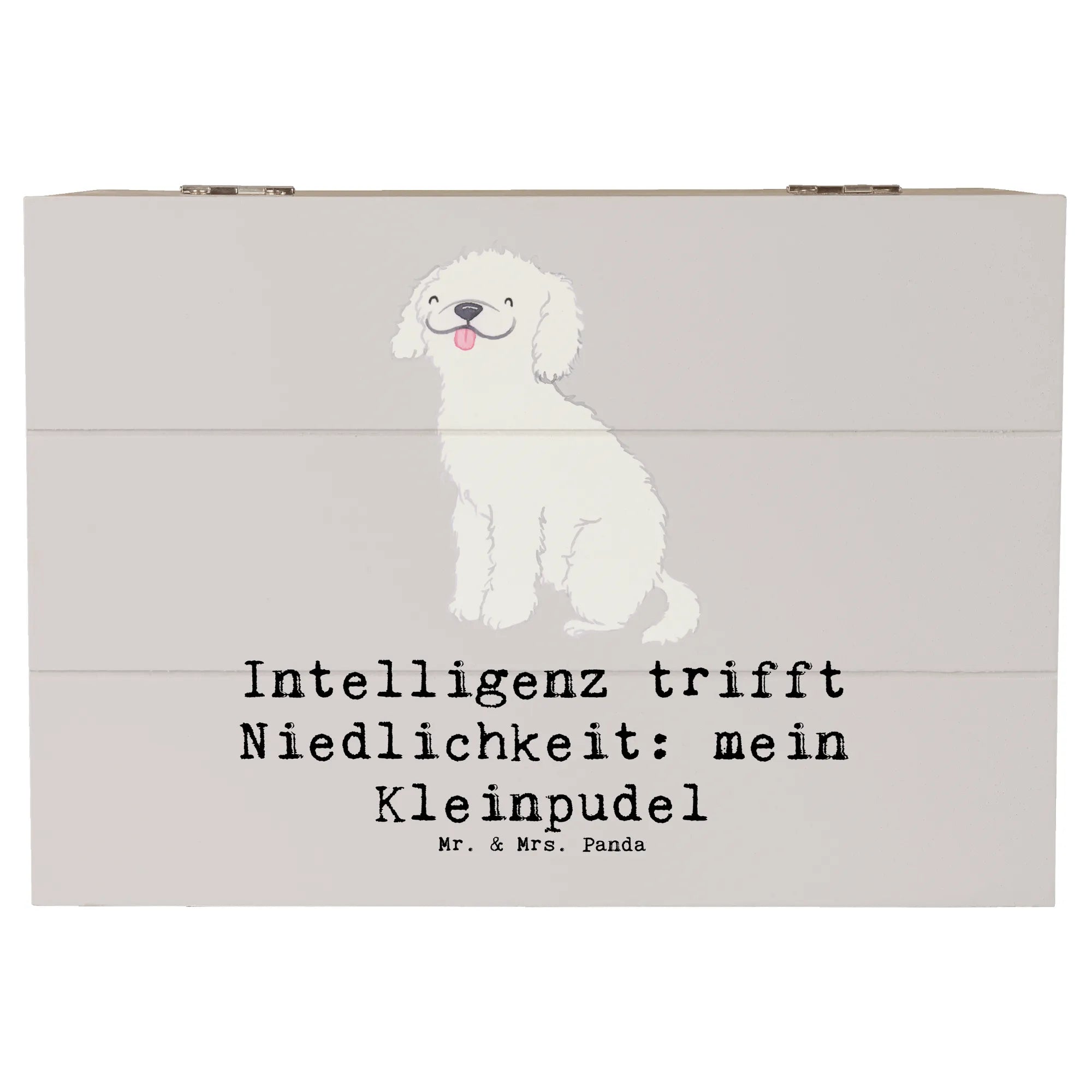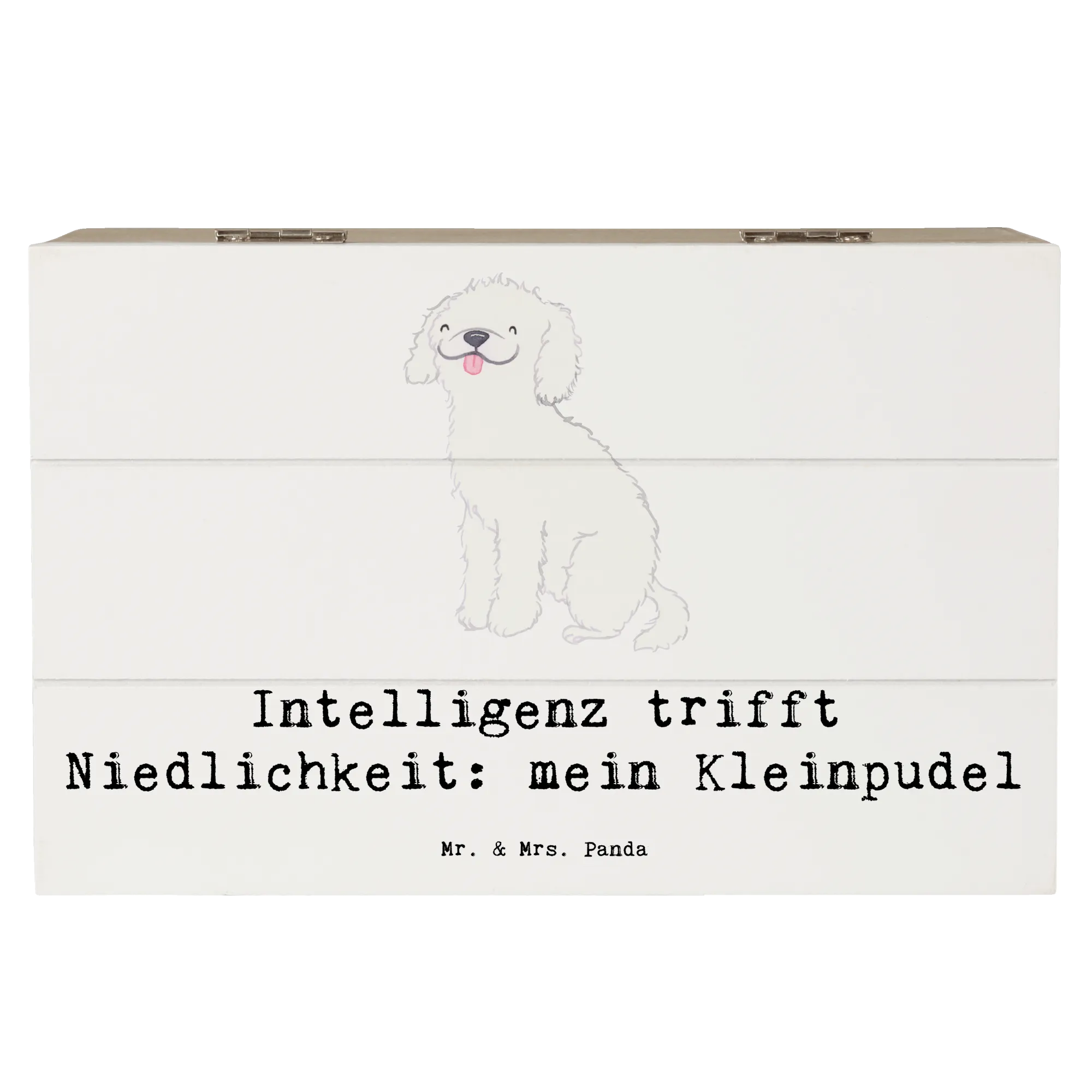 Die Kiste trägt den charmanten Slogan "Intelligenz trifft Niedlichkeit: mein Kleinpudel" und macht sie zu einem absoluten Highlight in jedem Raum. Die liebevoll handgezeichneten Motive von Mrs. Panda verleihen der Kiste einen ganz besonderen, persönlichen Touch und machen sie zum perfekten Geschenk für jeden Hundefan.