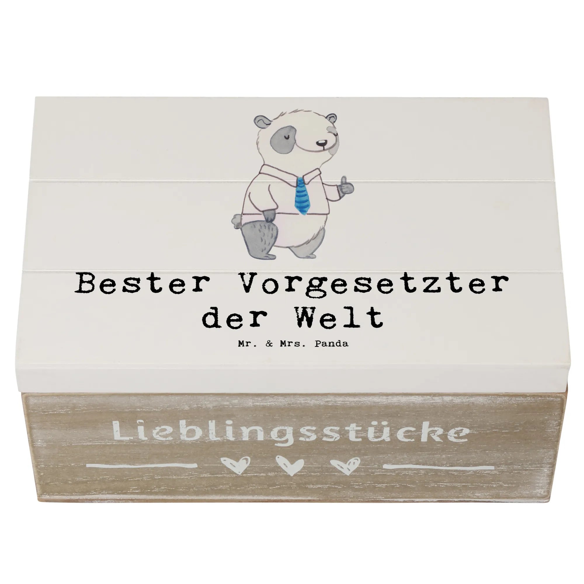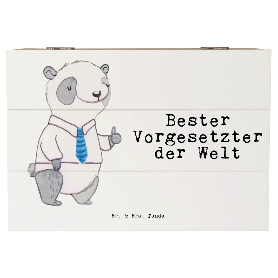 Entdecke die zauberhafte Holzkiste von Mr. & Mrs. Panda mit dem süßen Motiv "Bester Vorgesetzter der Welt"! Diese schöne Kiste aus robuster Premium Hartfaser ist ideal, um besondere Erinnerungen oder wertvolle Schätze aufzubewahren.