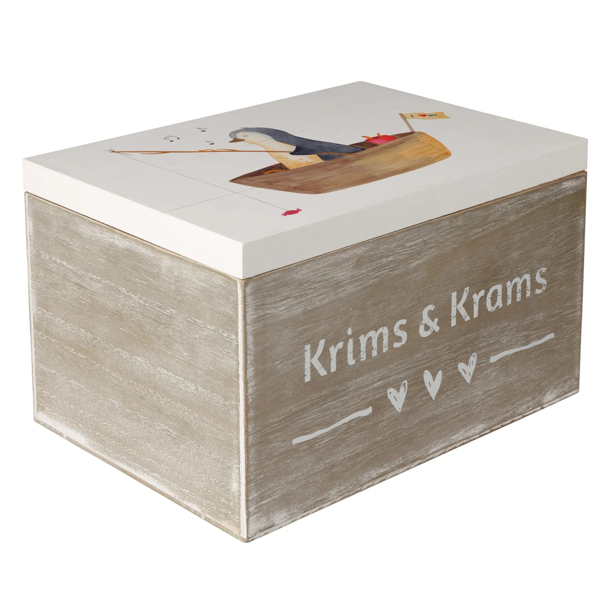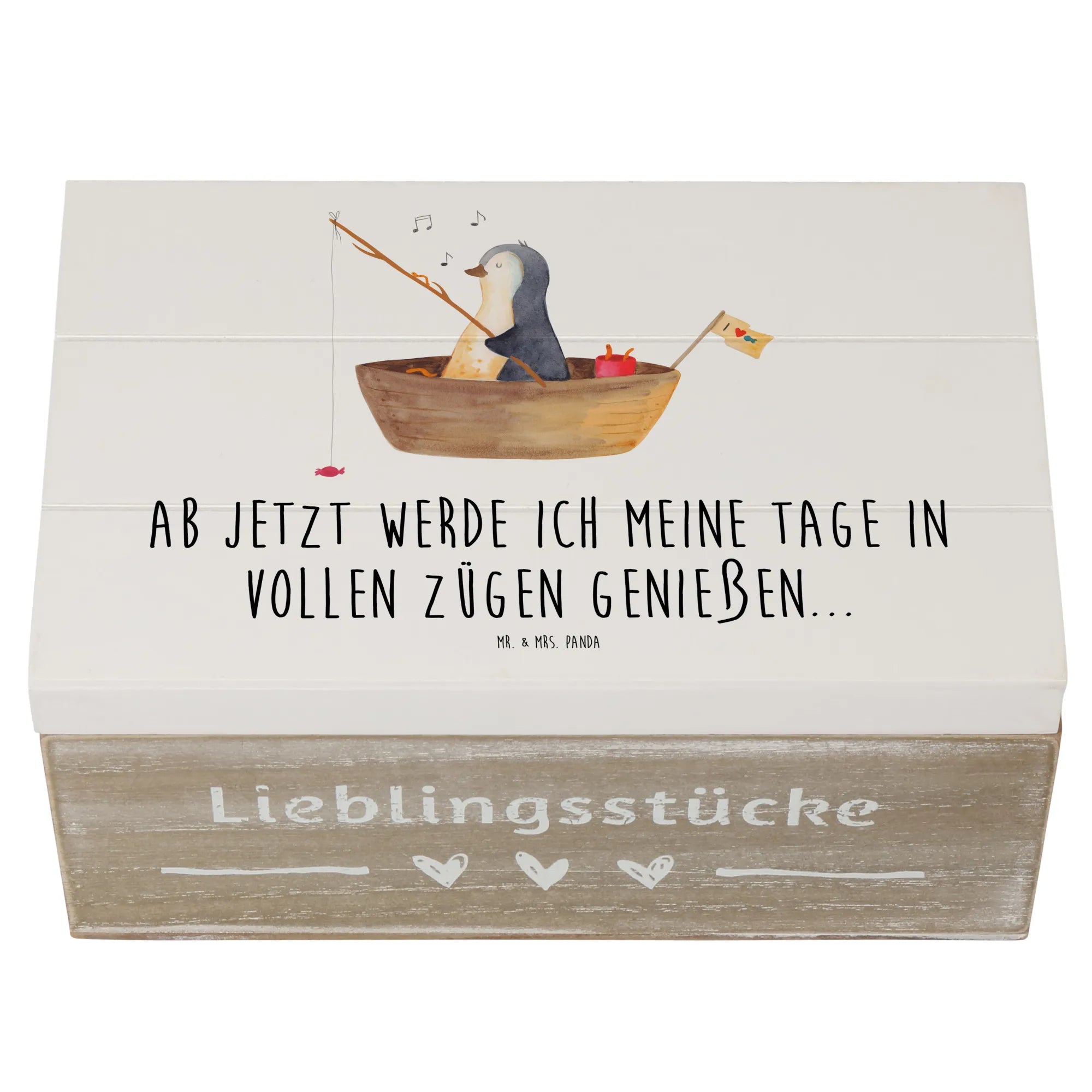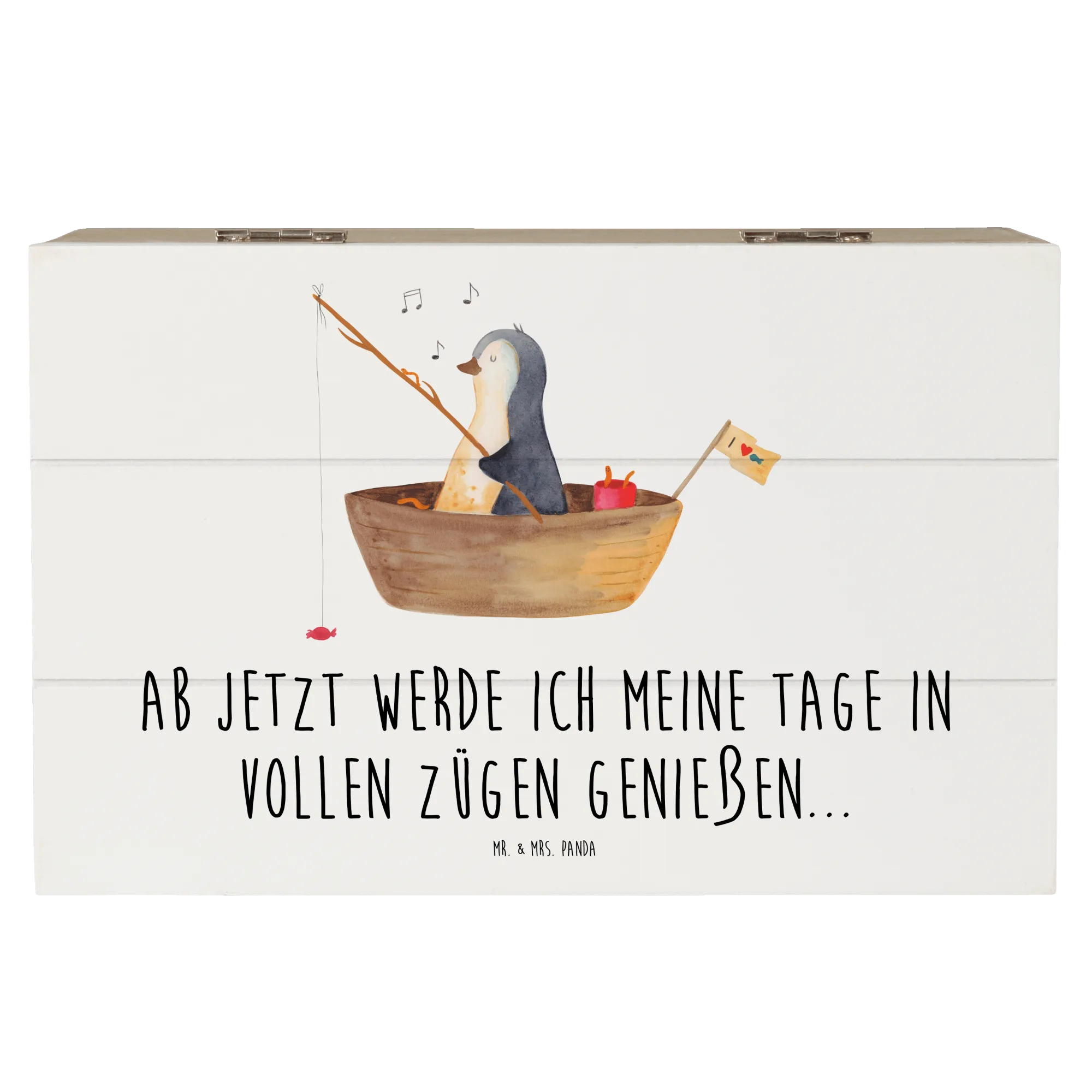 Diese wunderschöne Holzkiste von Mr. & Mrs. Panda ist ein ganz besonderer Ort für all deine Schätze und Erinnerungen. 🐧✨ Mit dem liebevollen Motiv des Pinguins im Angelboot, der statt Fischen süße Bonbons angelt, verbreitet diese Box sofort gute Laune und Lebenslust. Es ist die perfekte Erinnerungskiste für Menschen, die einen Neuanfang wagen oder nach einer schweren Zeit wie einer Trennung oder bei Liebeskummer ein Lächeln gebrauchen können.