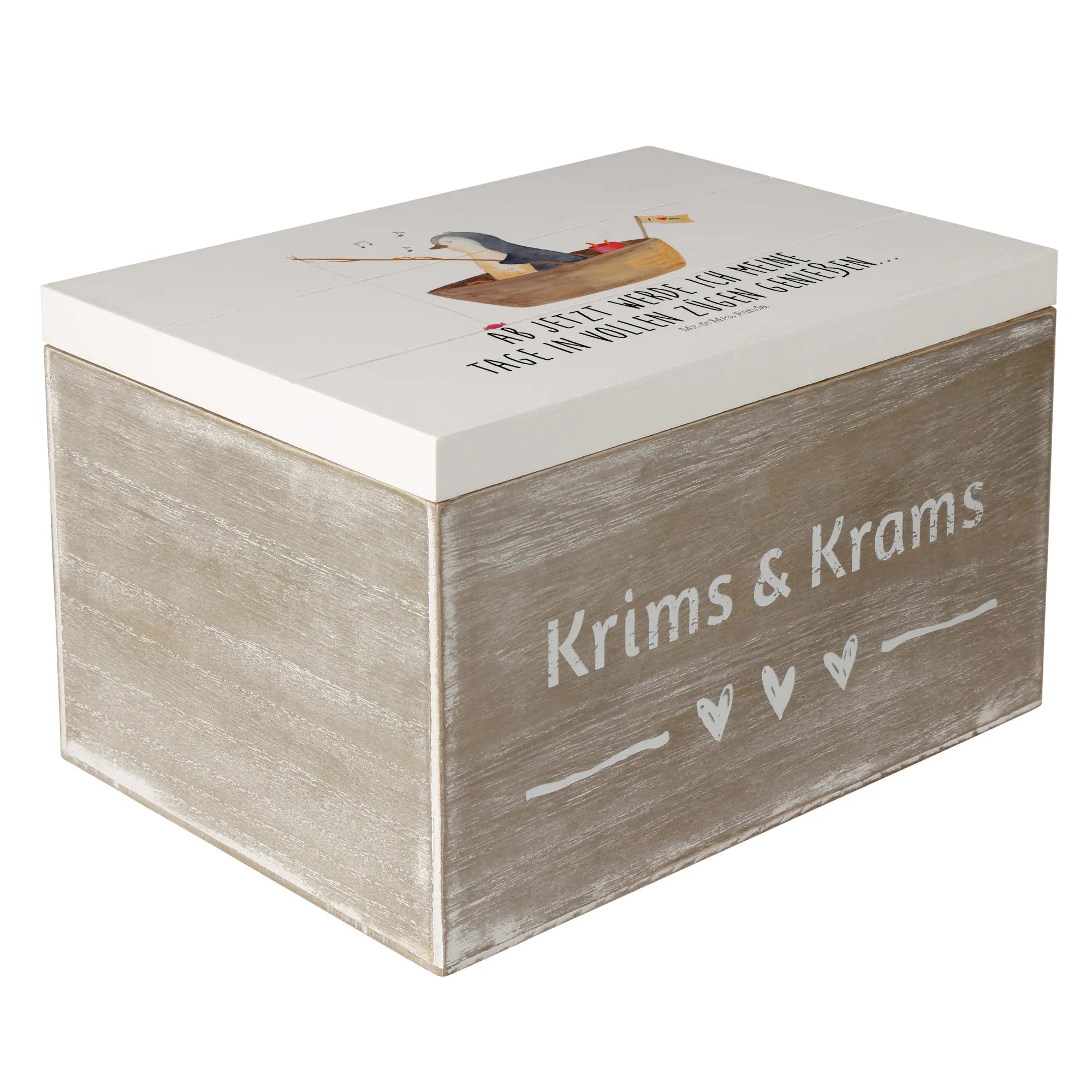 Verschenke Freude mit der wunderschönen Holzkiste Pinguin Angelboot aus der Pinguin-Kollektion von Mr. & Mrs. Panda! Diese liebevoll gestaltete Erinnerungskiste ist ideal für alle Pinguinliebhaber und bietet nicht nur einen stabilen Aufbewahrungsort für deine Schätze, sondern auch eine herzerwärmende Botschaft: "Ab jetzt werde ich meine Tage in vollen Zügen genießen..."