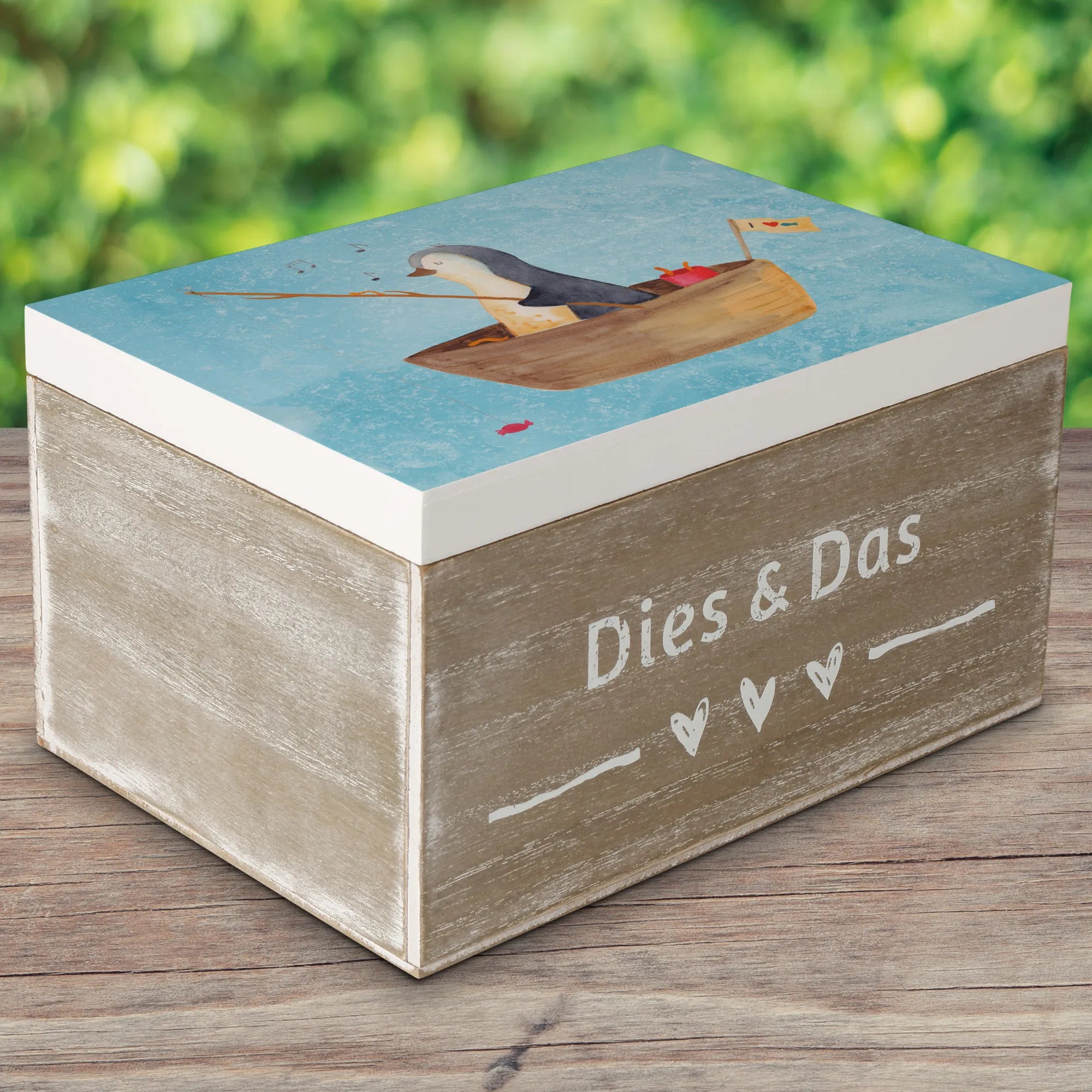 Die wunderschöne Holzkiste von Mr. & Mrs. Panda mit dem zauberhaften Motiv eines Pinguins im Angelboot ist das perfekte Geschenk für jeden Pinguinliebhaber!