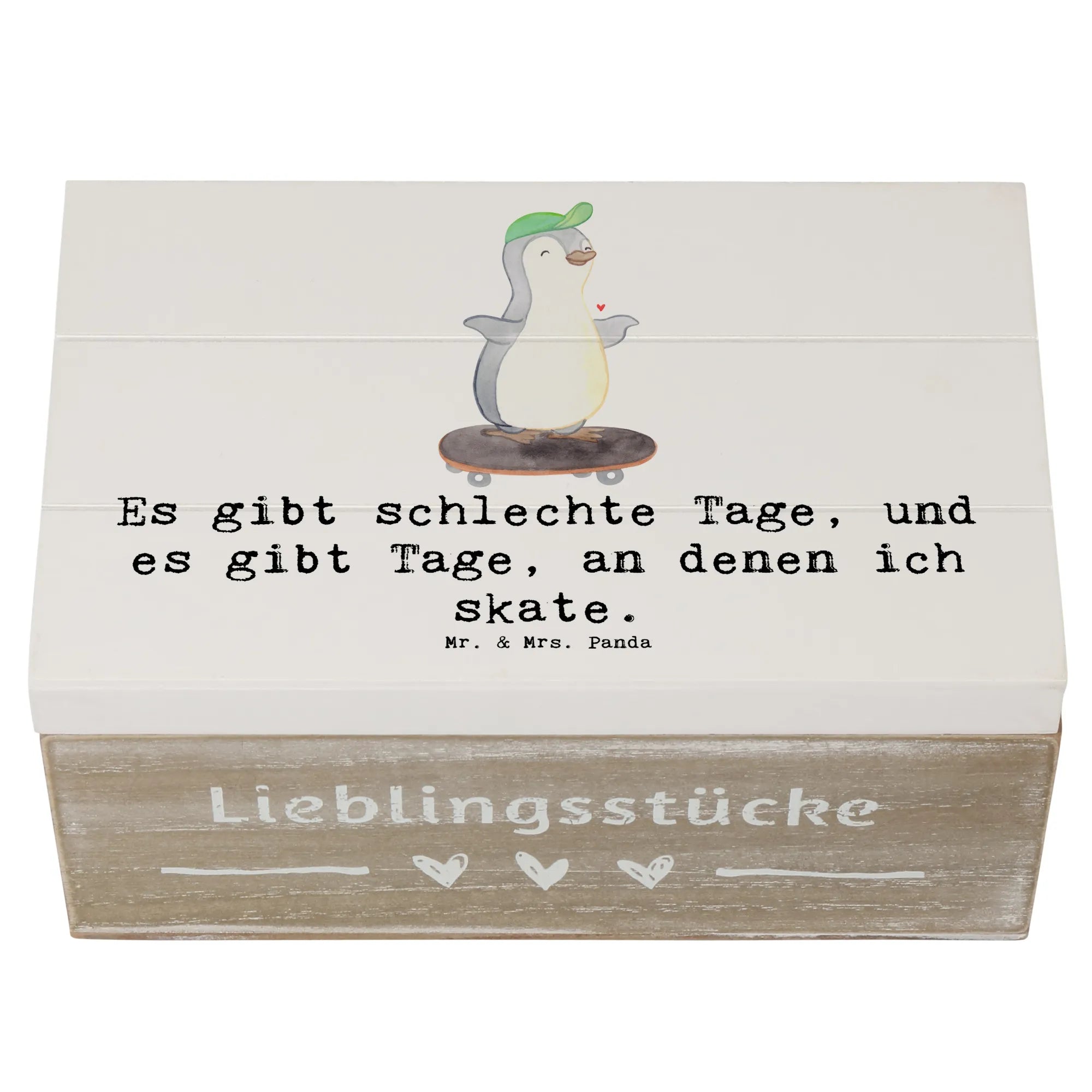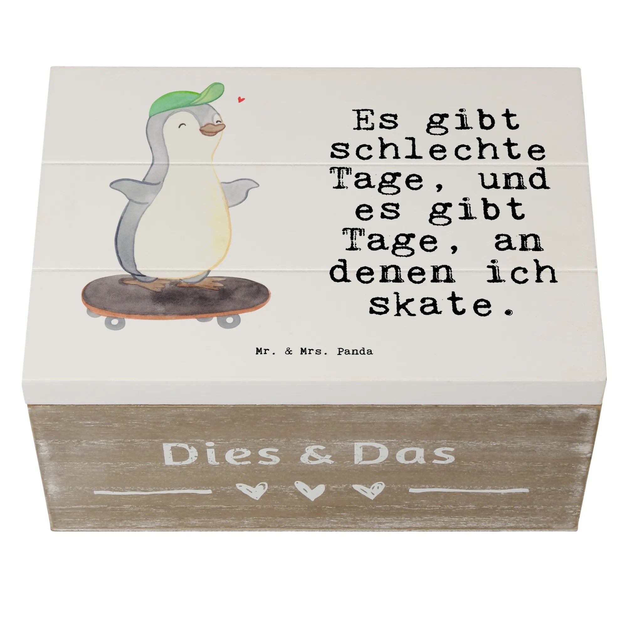 Die Holzkiste "Pinguin Skateboarden Tage" von Mr. & Mrs. Panda ist das perfekte Geschenk für alle kleinen und großen Skateboard-Enthusiasten! Diese wunderschöne Holzkiste ist nicht nur ein praktischer Aufbewahrungsort für all deine Schätze, sondern auch ein echter Blickfang. Mit einem süßen Pinguin, der fröhlich auf seinem Skateboard rollt, und dem inspirierenden Spruch "Es gibt schlechte Tage, und es gibt Tage, an denen ich skate." macht sie jeder Zeit zum idealen Begleiter.