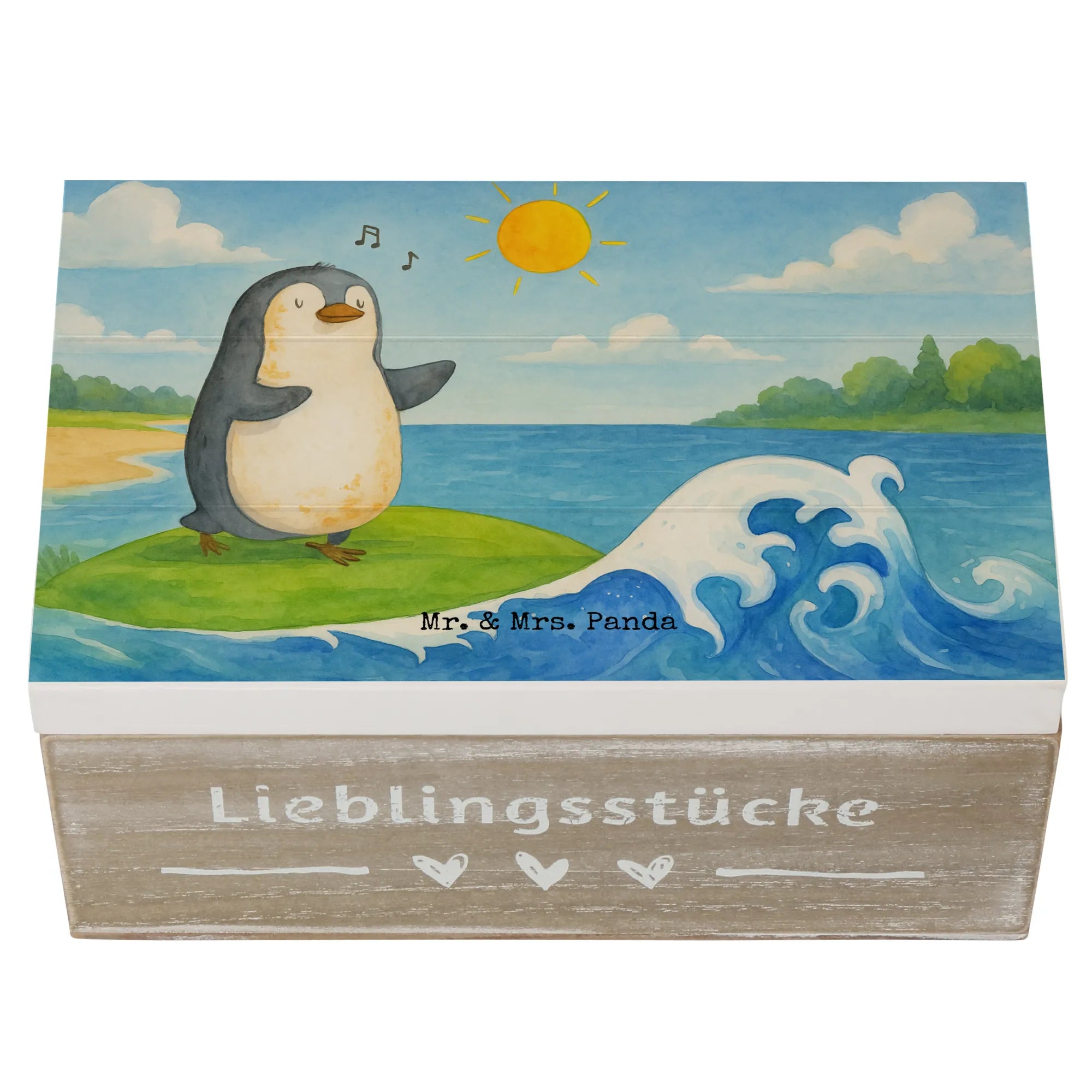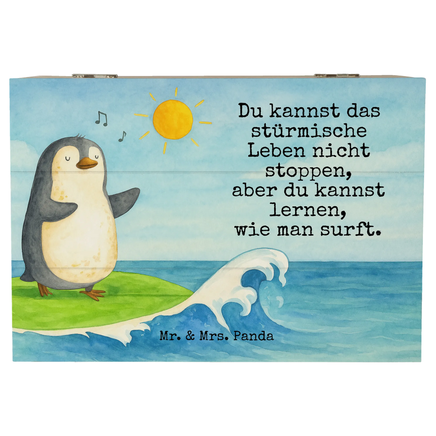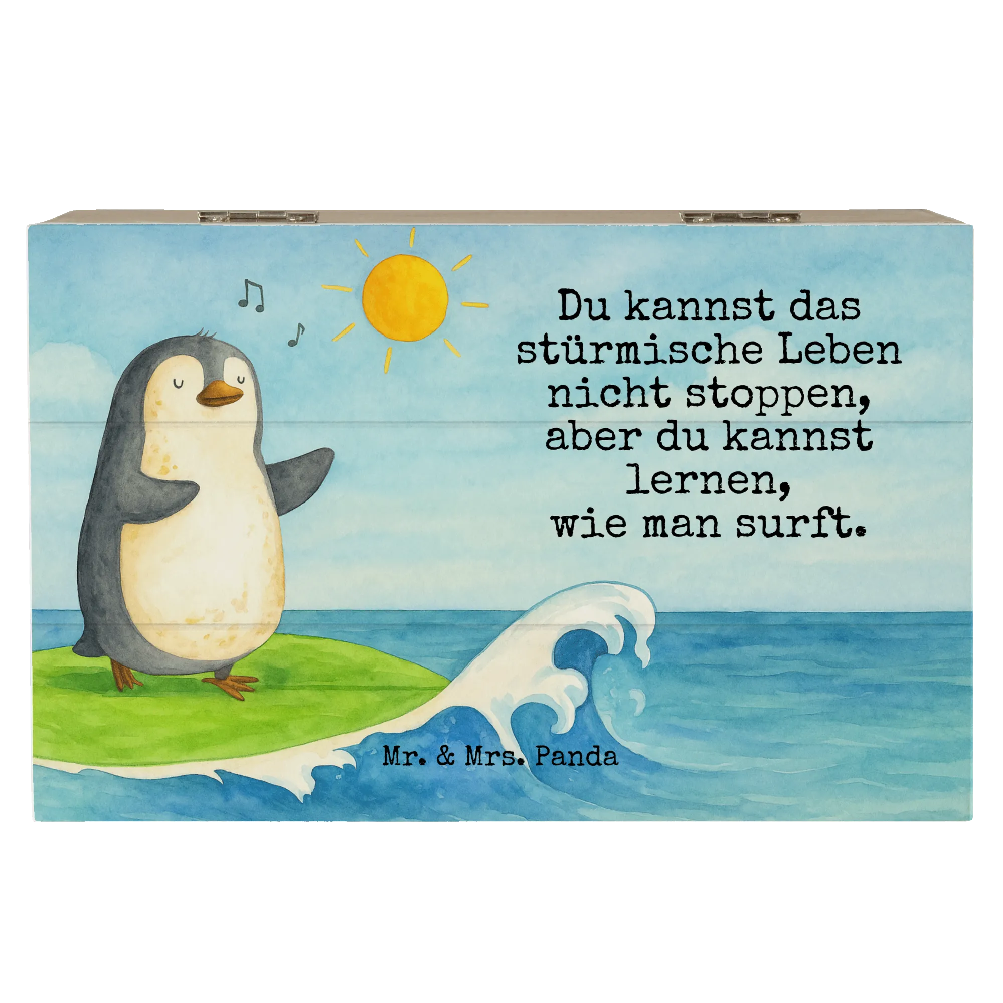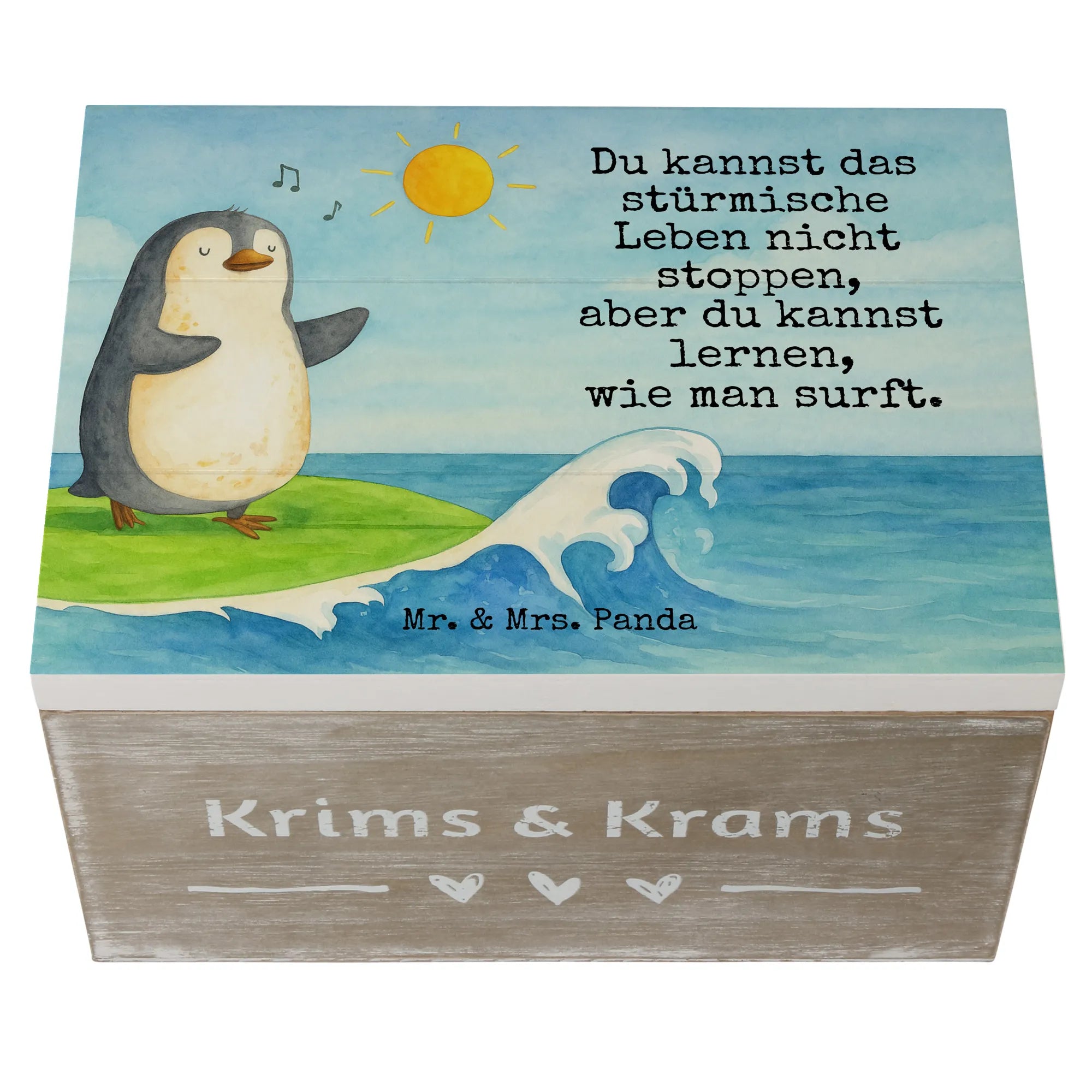 Holzkiste Pinguin Surfer Design - 22 x 15 cm - mit Spruch