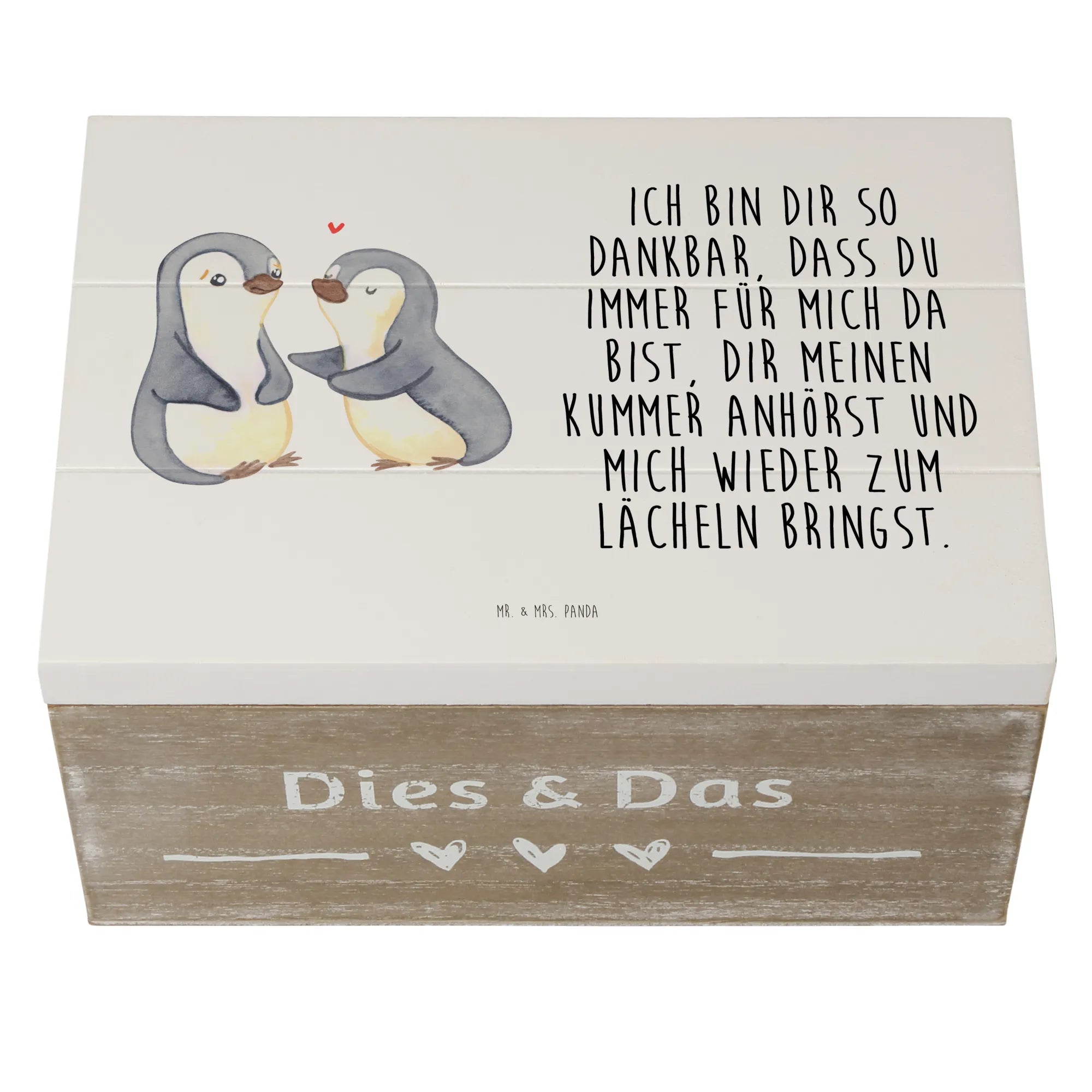 Eine kleine Schatztruhe voller Liebe: Unsere Holzkiste „Pinguine trösten“ aus der Liebe-Kollektion von Mr. & Mrs. Panda ist mehr als nur eine Aufbewahrungsbox. Auf dem Deckel nisten zwei zärtliche Pinguine, die sich tröstend zuneigen, begleitet von dem liebevollen Spruch „Ich bin dir so dankbar, dass du immer für mich da bist, dir meinen Kummer anhörst und mich wieder zum Lächeln bringst.“ 🎁 Dieses Design bringt Wärme, Geborgenheit und echtes Gefühl in jedes Zuhause.