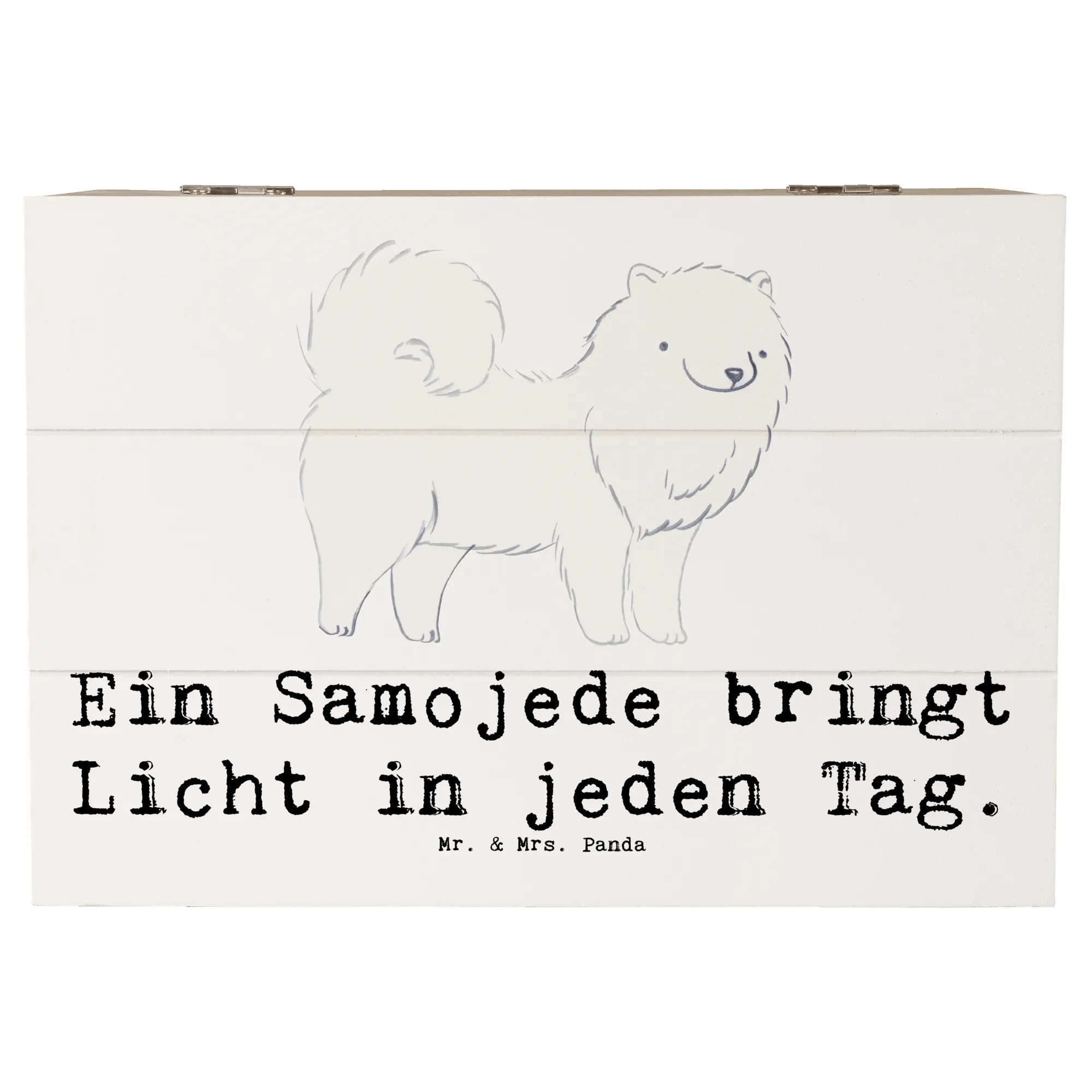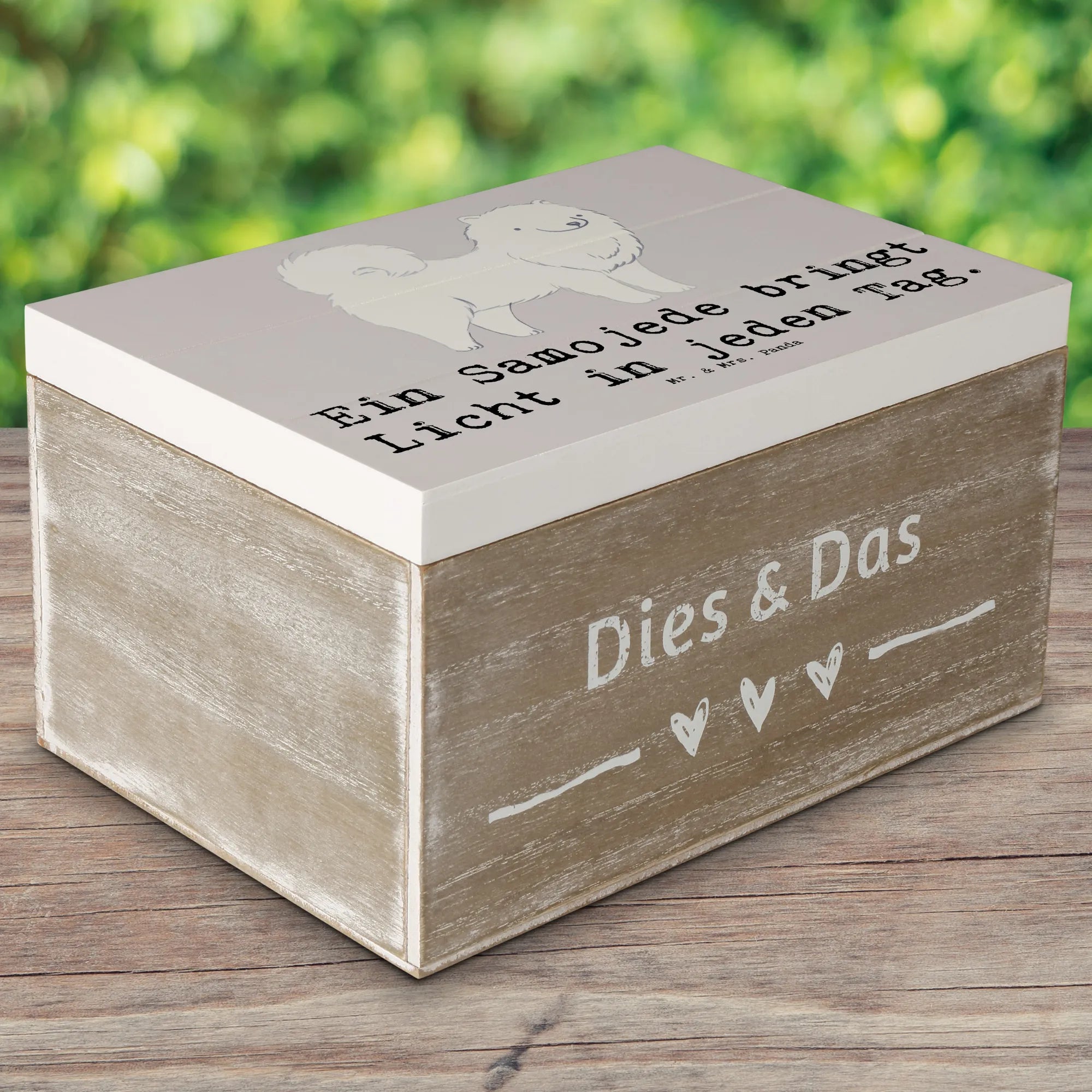 Die wunderschöne Holzkiste von Mr. & Mrs. Panda ist der perfekte Aufbewahrungsort für all Deine kostbaren Erinnerungen! Mit einem zauberhaften Samojede-Motiv und dem herzerwärmenden Slogan "Ein Samojede bringt Licht in jeden Tag." wird diese Kiste schnell zu einem Lieblingsstück in Deinem Zuhause.