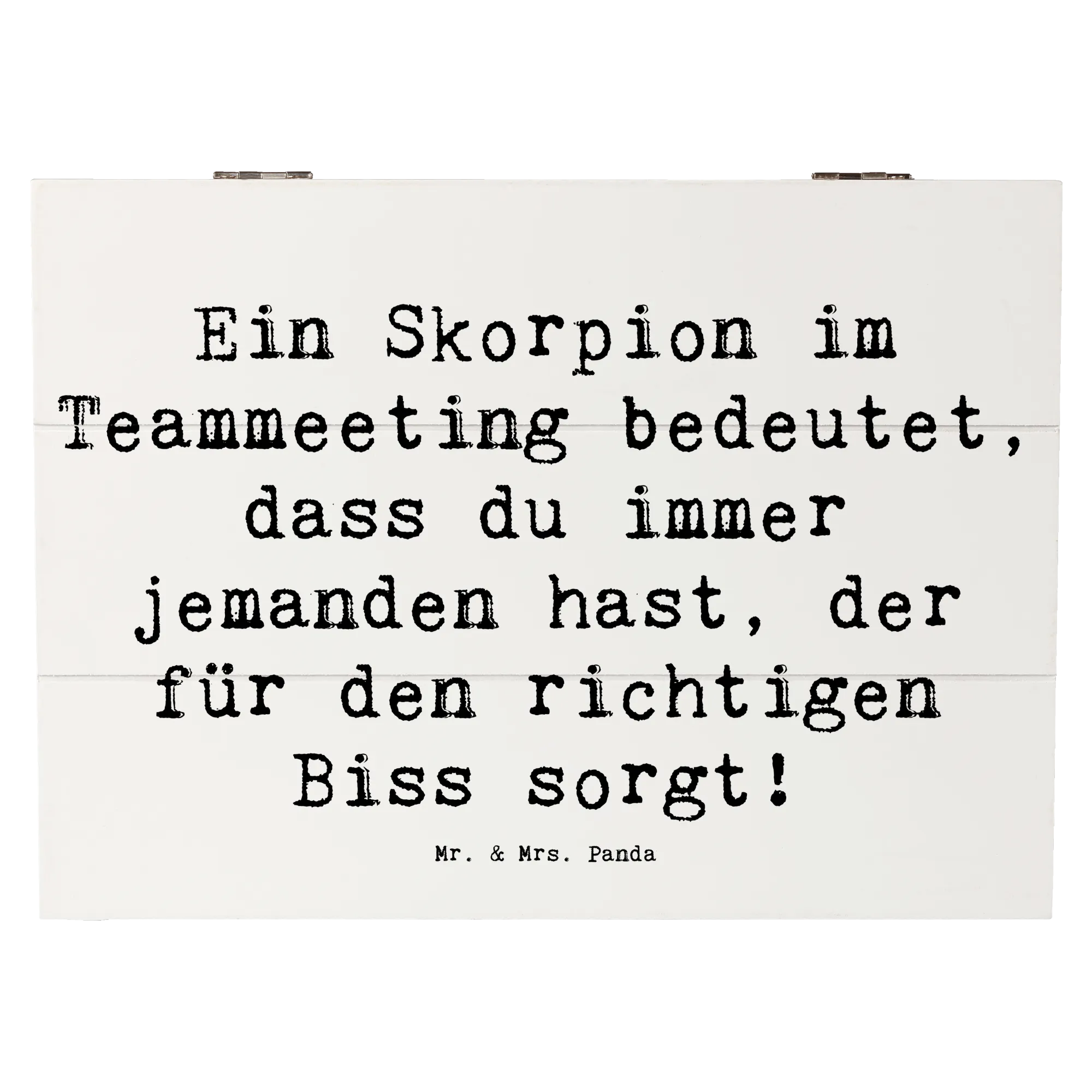 Die robuste Holzfaser sorgt dafür, dass die Kiste stabil und langlebig ist. Das besondere Design wird durch den charmanten Spruch „Ein Skorpion im Teammeeting bedeutet, dass du immer jemanden hast, der für den richtigen Biss sorgt!“ ergänzt, der als humorvolle Erinnerung dient, wie wichtig es ist, den richtigen Biss im Leben zu finden. Mit ihrer einzigartigen Optik und den sanften Farben passt sie sowohl in dein Wohnambiente als auch als Liebesbeweis an deine Freunde und Familie.
