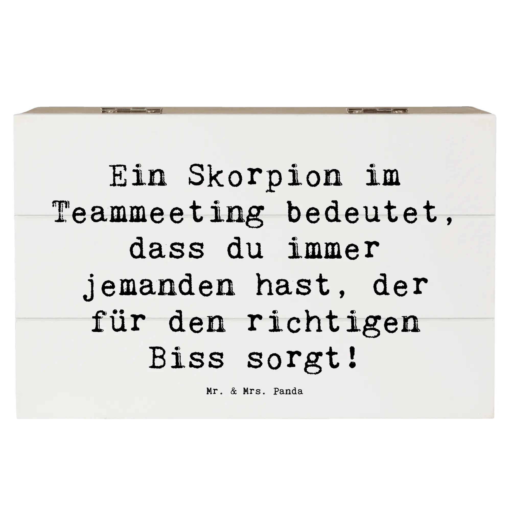 Die Kiste ist aus robuster Holzfaser gefertigt, die sowohl langlebig als auch umweltfreundlich ist. Mit ihrer edlen und stabilen Bauweise wird sie garantiert zum liebevollen Begleiter in jedem Zuhause. Der Slogan "Ein Skorpion im Teammeeting bedeutet, dass du immer jemanden hast, der für den richtigen Biss sorgt!" verleiht der Kiste eine humorvolle Note und sorgt dafür, dass sie nicht nur praktisch ist, sondern auch Freude bereitet.