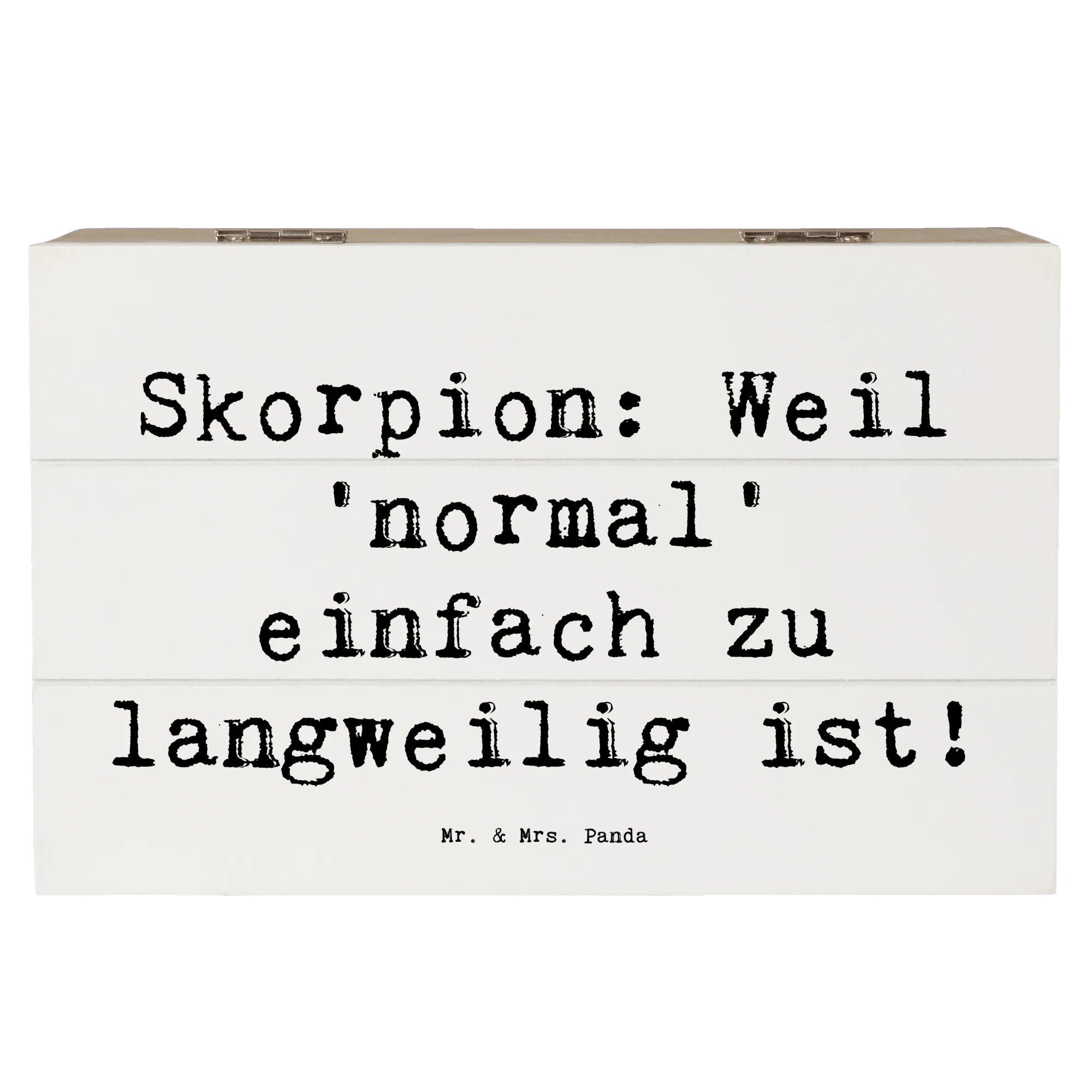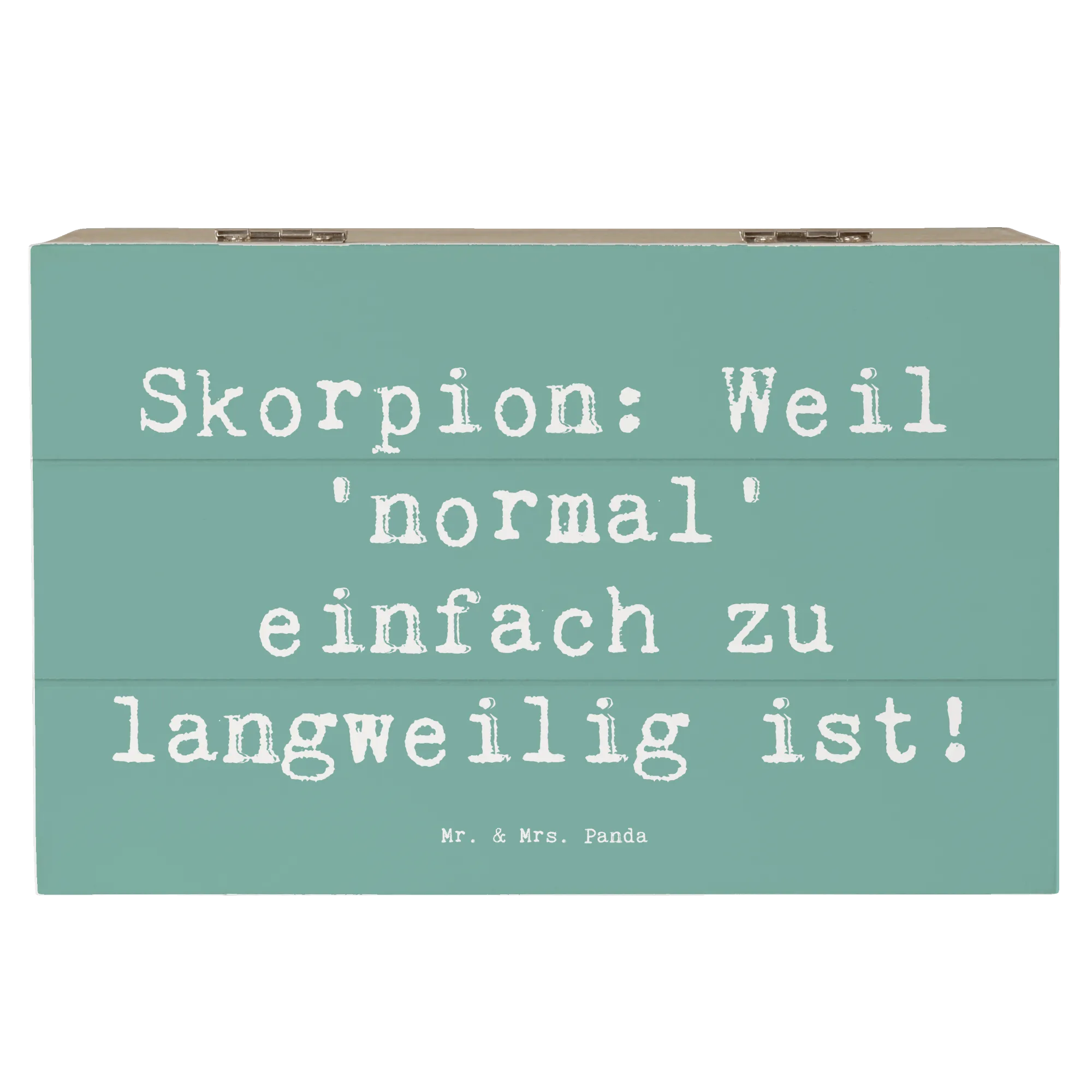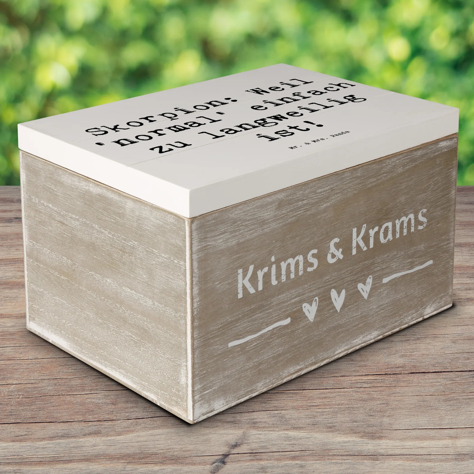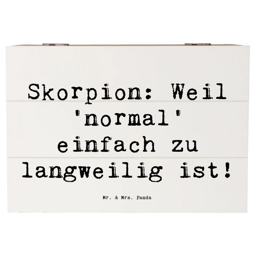 Mit den Maßen von 19 x 12 x 10 cm ist sie ideal geeignet als Aufbewahrungsort und passt überall in dein Zuhause. Der Slogan "Skorpion: Weil 'normal' einfach zu langweilig ist!" verleiht dieser Kiste eine besondere Note und macht sie zu einem ganz persönlichen Geschenk.