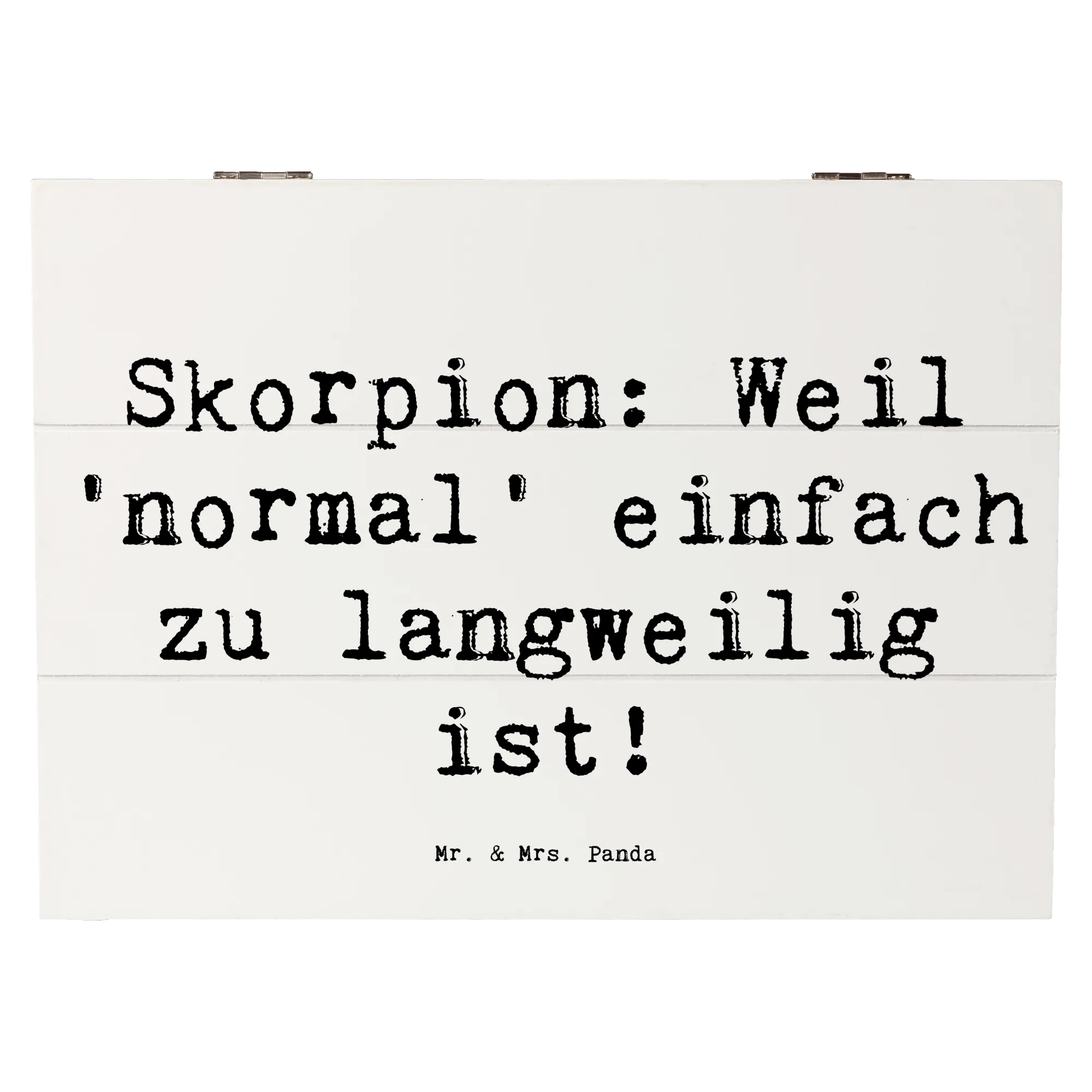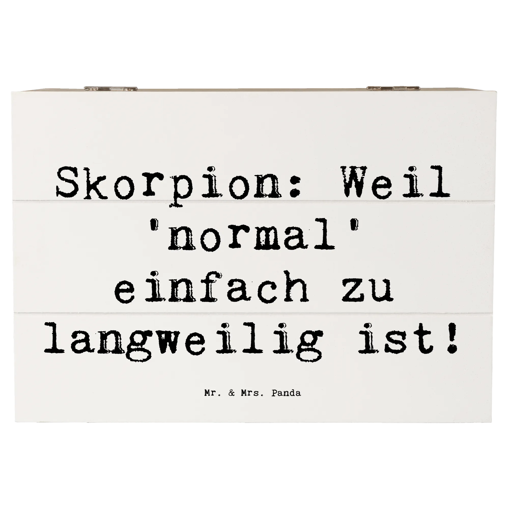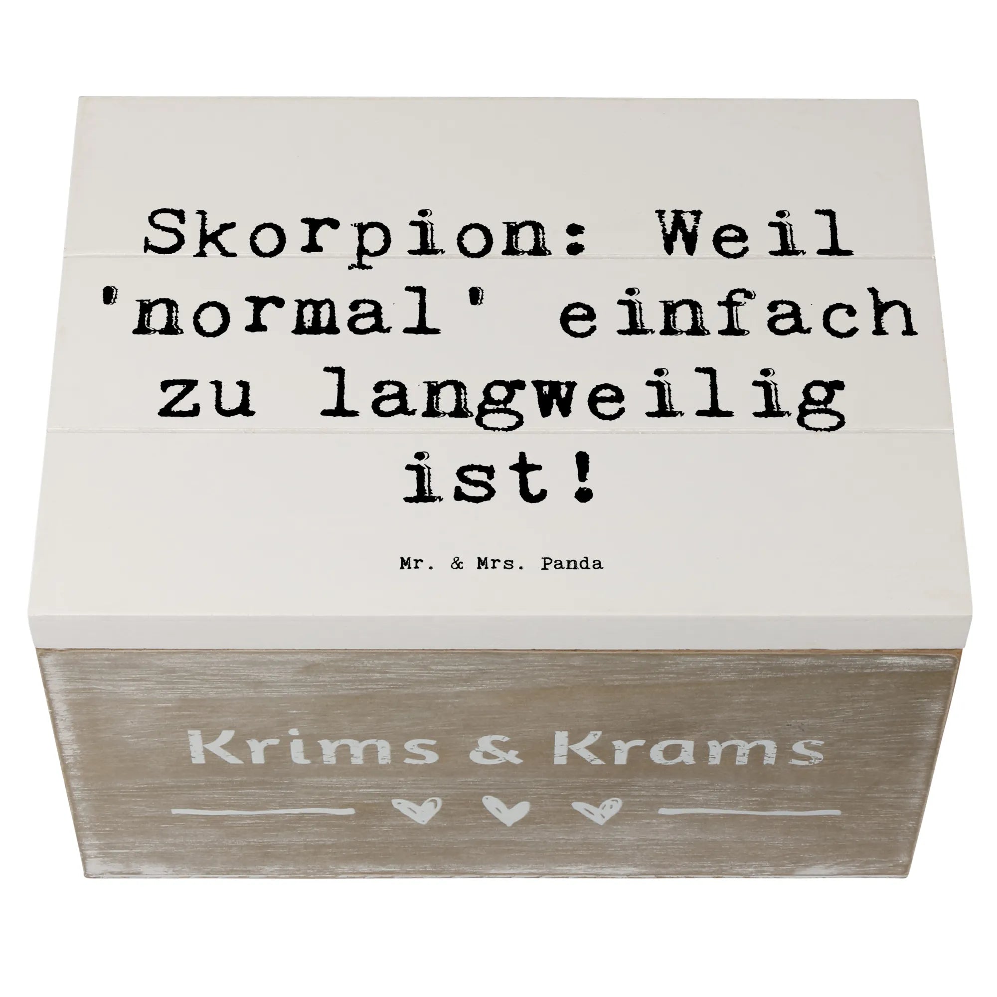 Mit den Maßen von 19 x 12 x 10 cm ist sie ideal geeignet als Aufbewahrungsort und passt überall in dein Zuhause. Der Slogan "Skorpion: Weil 'normal' einfach zu langweilig ist!" verleiht dieser Kiste eine besondere Note und macht sie zu einem ganz persönlichen Geschenk.