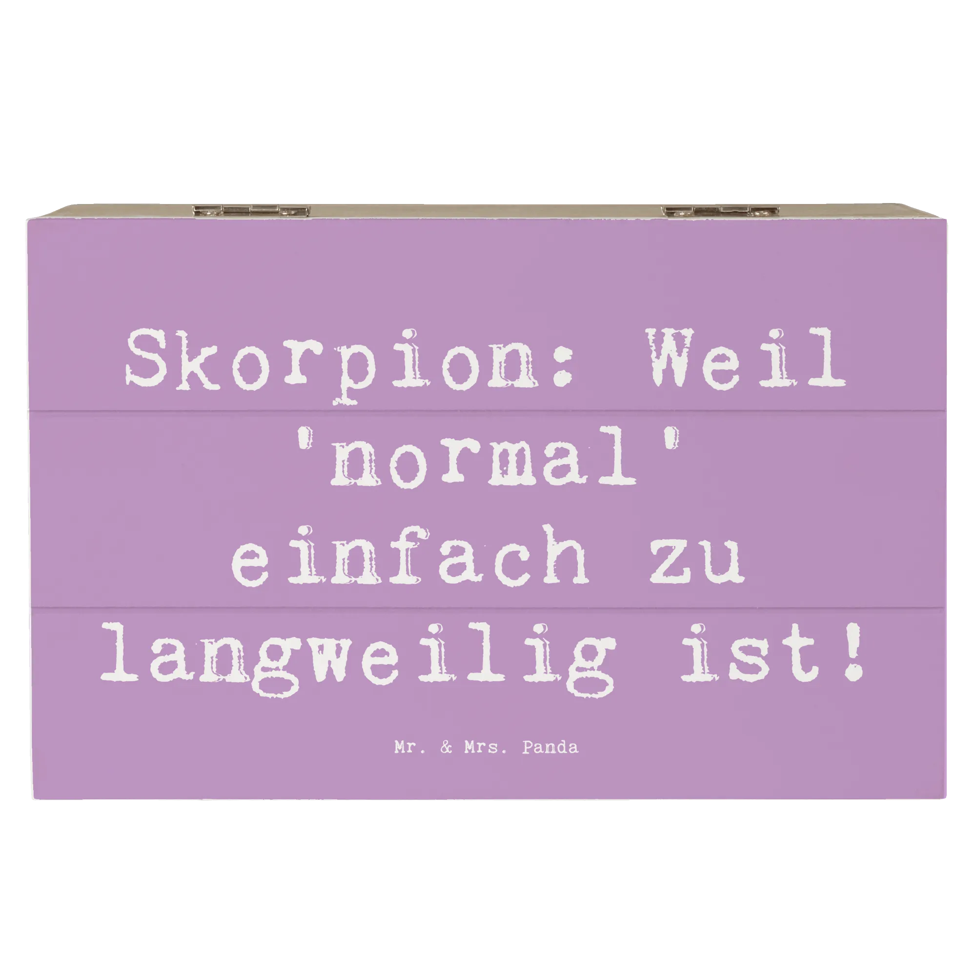 Aber das ist noch nicht alles! Auf der Kiste prangt der witzige Spruch: "Skorpion: Weil 'normal' einfach zu langweilig ist!" Somit wird die Kiste nicht nur zu einem praktischen Utensil, sondern zieht auch alle Blicke auf sich und bringt ein Lächeln auf die Gesichter der Beschenkten. Die Kombination aus Funktionalität und verspieltem Design macht diese Schatulle zu einem einzigartigen Geschenk, das die einzigartigen Eigenschaften des Skorpions widerspiegelt.