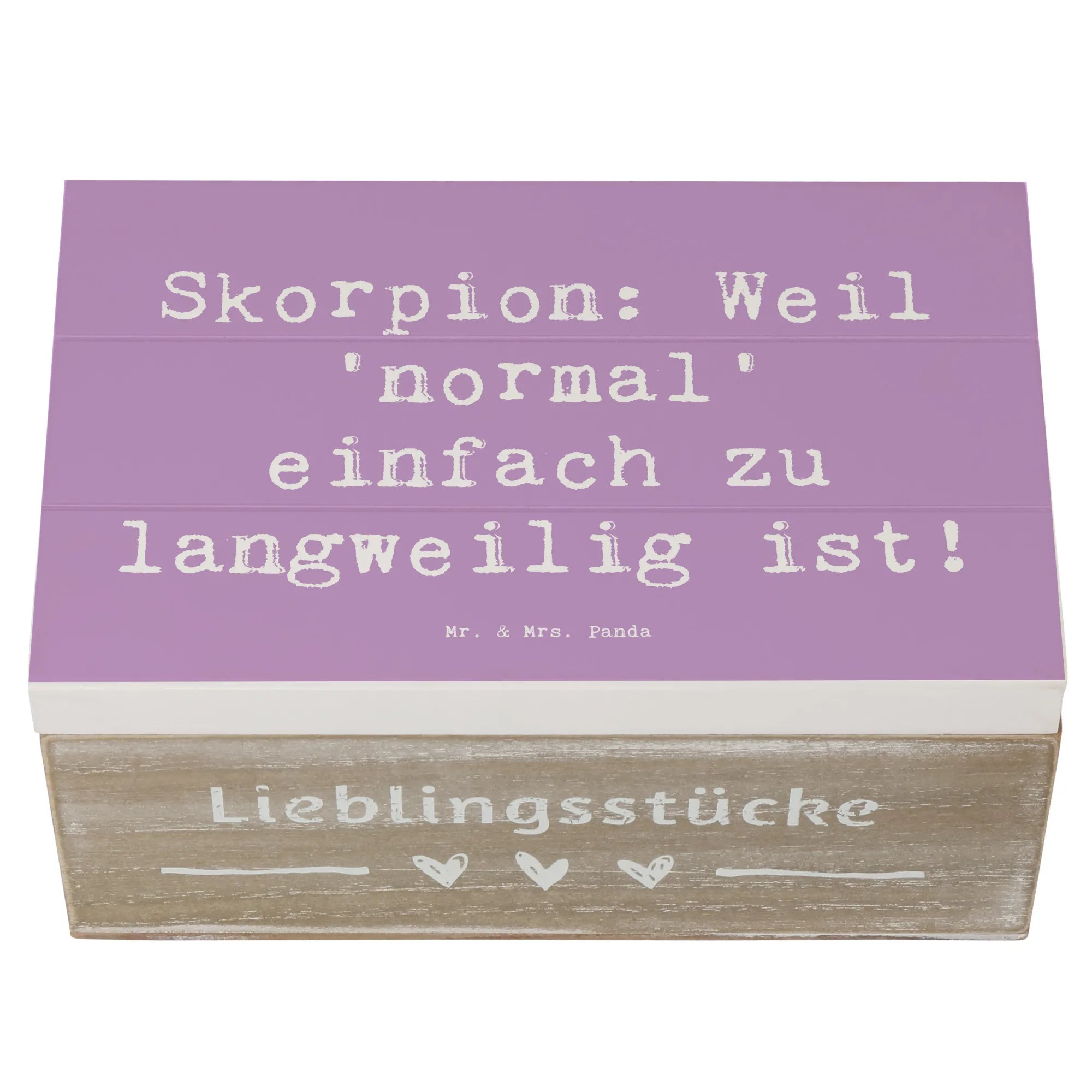 Du suchst nach dem perfekten Geschenk für einen Skorpion? Unsere wunderschöne Holzkiste von Mr. & Mrs. Panda ist genau das, was du brauchst! Mit dem liebevoll handgezeichneten Motiv des Skorpions und dem witzigen Spruch 'Skorpion: Weil "normal" einfach zu langweilig ist!' wird diese Erinnerungskiste zum absoluten Highlight in jedem Raum.