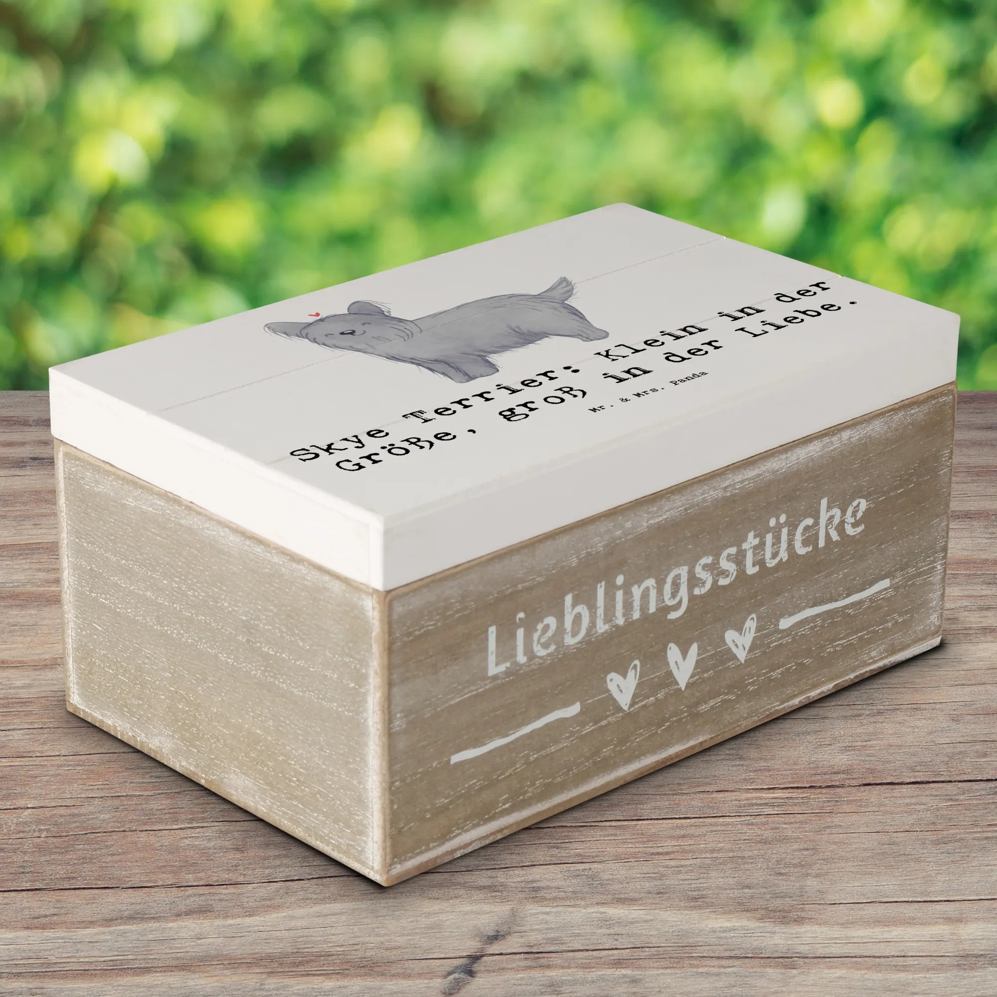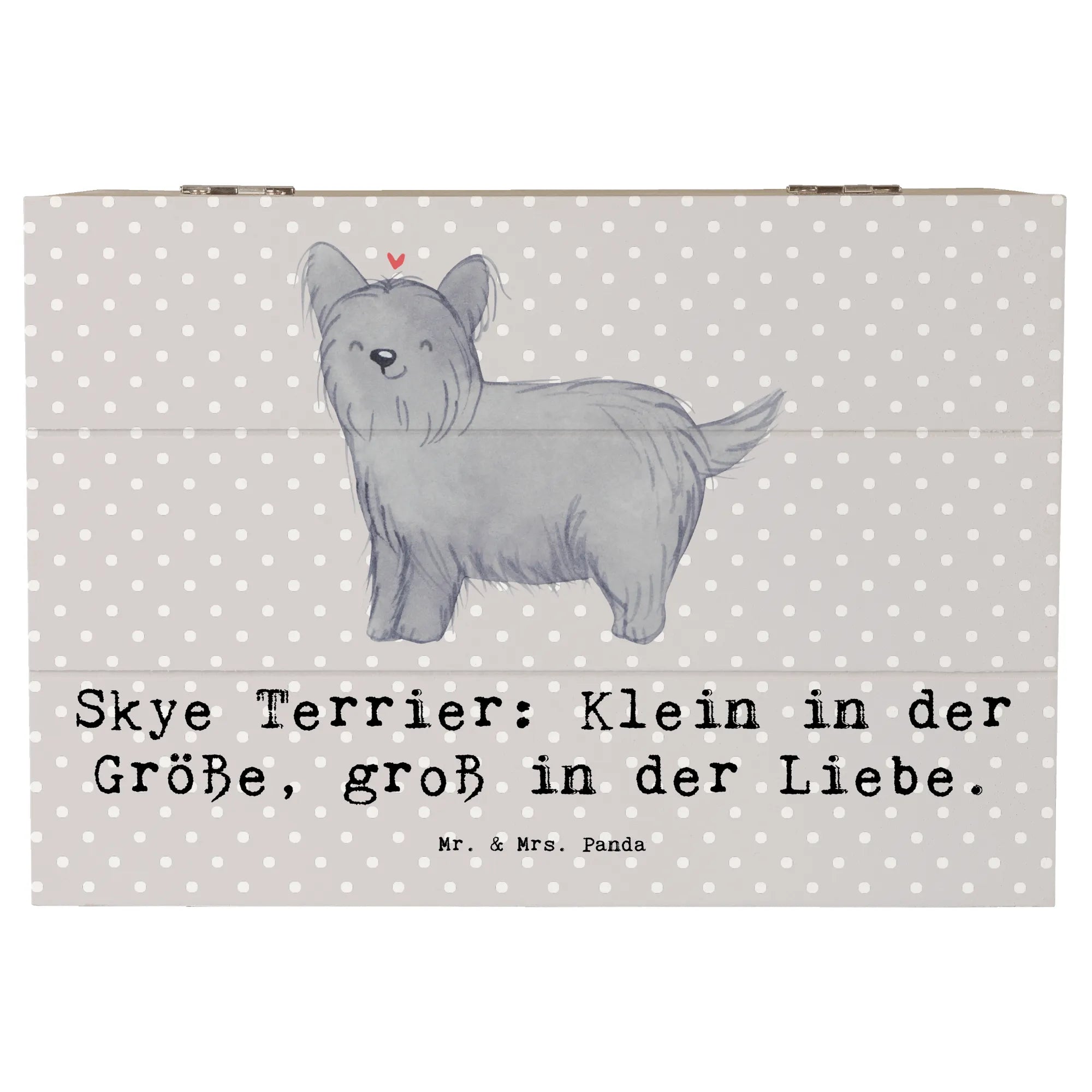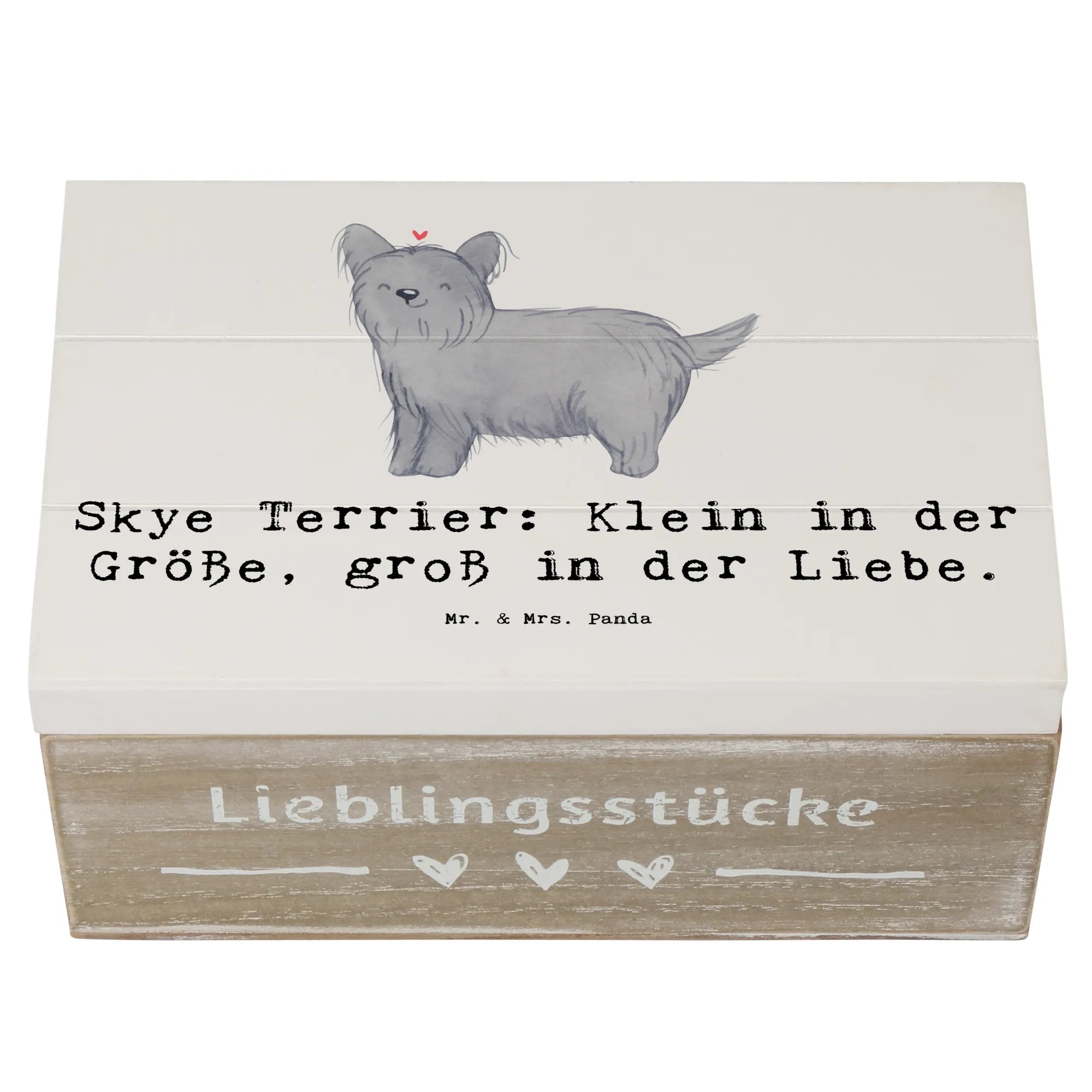 Die Hunderassen Kollektion von Mr. & Mrs. Panda bringt die unterschiedlichsten Hunderassen zum Leben und der Skye Terrier ist da keine Ausnahme. Der Spruch 'Skye Terrier: Klein in der Größe, groß in der Liebe.' zaubert Dir beim Anblick der Box garantiert ein Lächeln ins Gesicht.