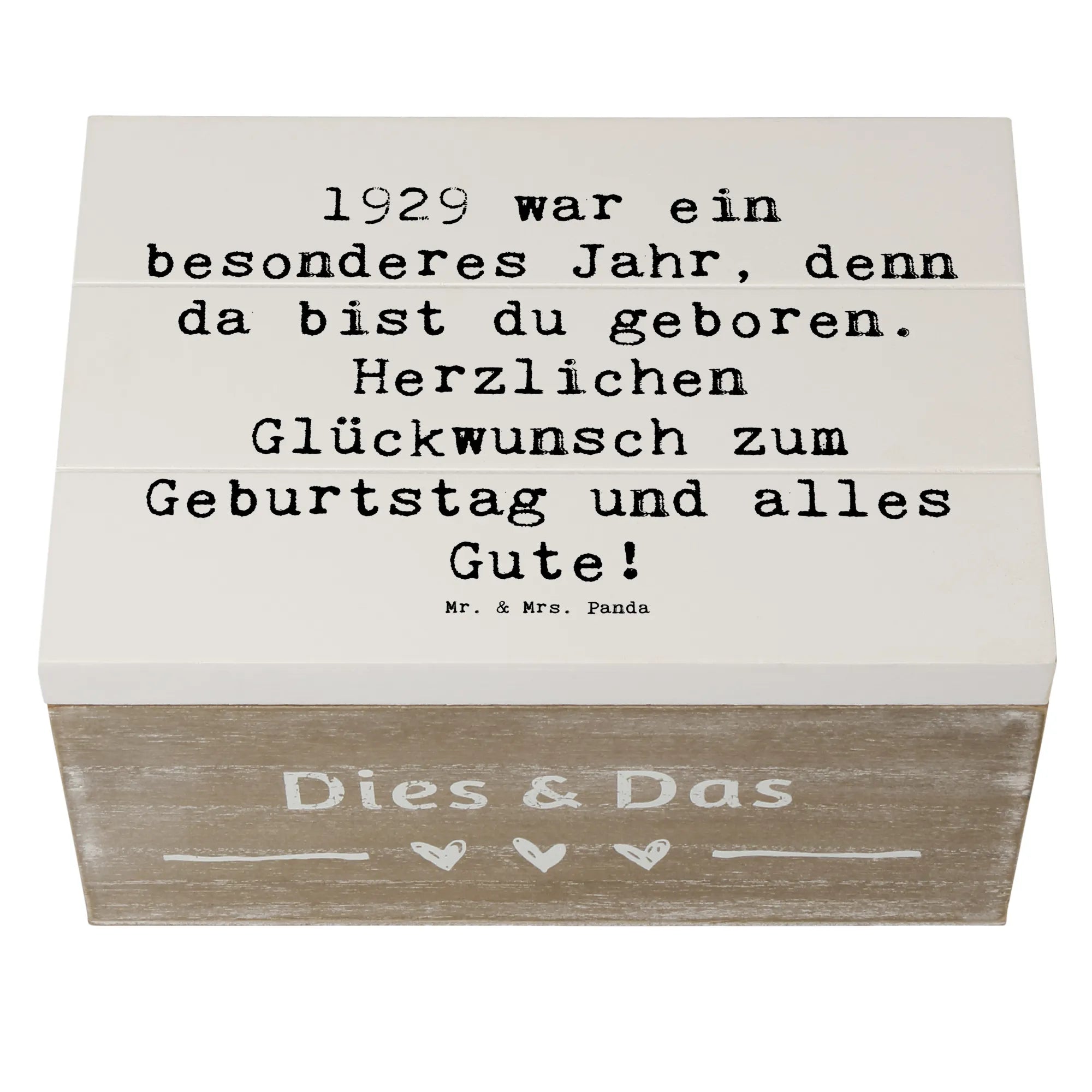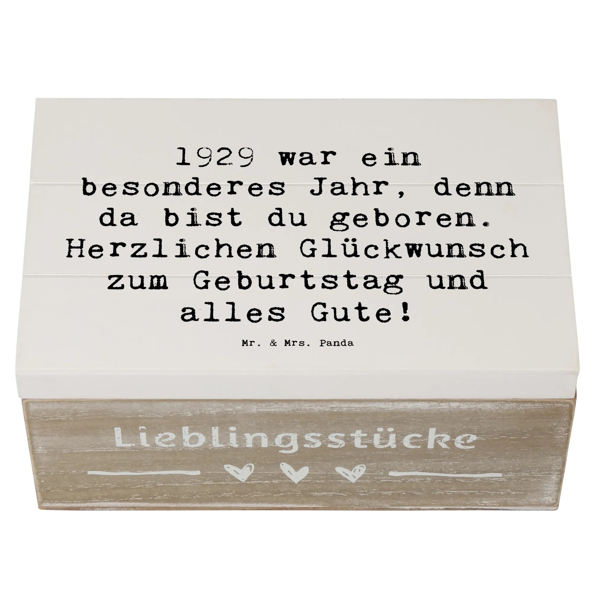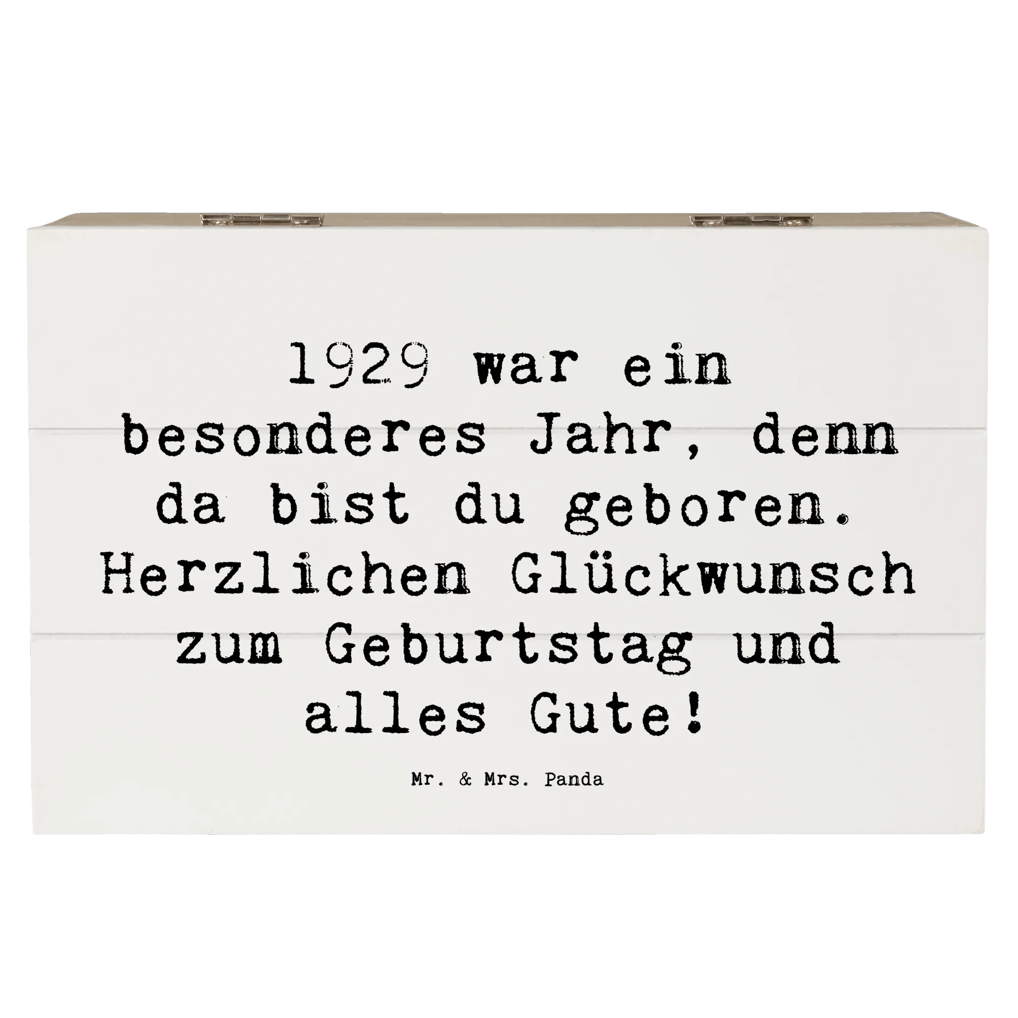 Die Holzkiste mit dem Motiv '1929 Geburtstag' ist Teil der liebevollen Geburtstag Geburtsjahr-Kollektion von Mr. & Mrs. Panda, die dafür entworfen wurde, bedeutungsvolle Geschenke zu kreieren. Jedes Produkt erzählt eine Geschichte, trägt einen Hauch von Nostalgie und bringt Freude in jeden Geburtstag. Damit wird jeder Geburtstag unvergesslich! Hol dir jetzt diese stilvolle und nostalgische Aufbewahrungsbox und mach einen lieben Menschen glücklich.