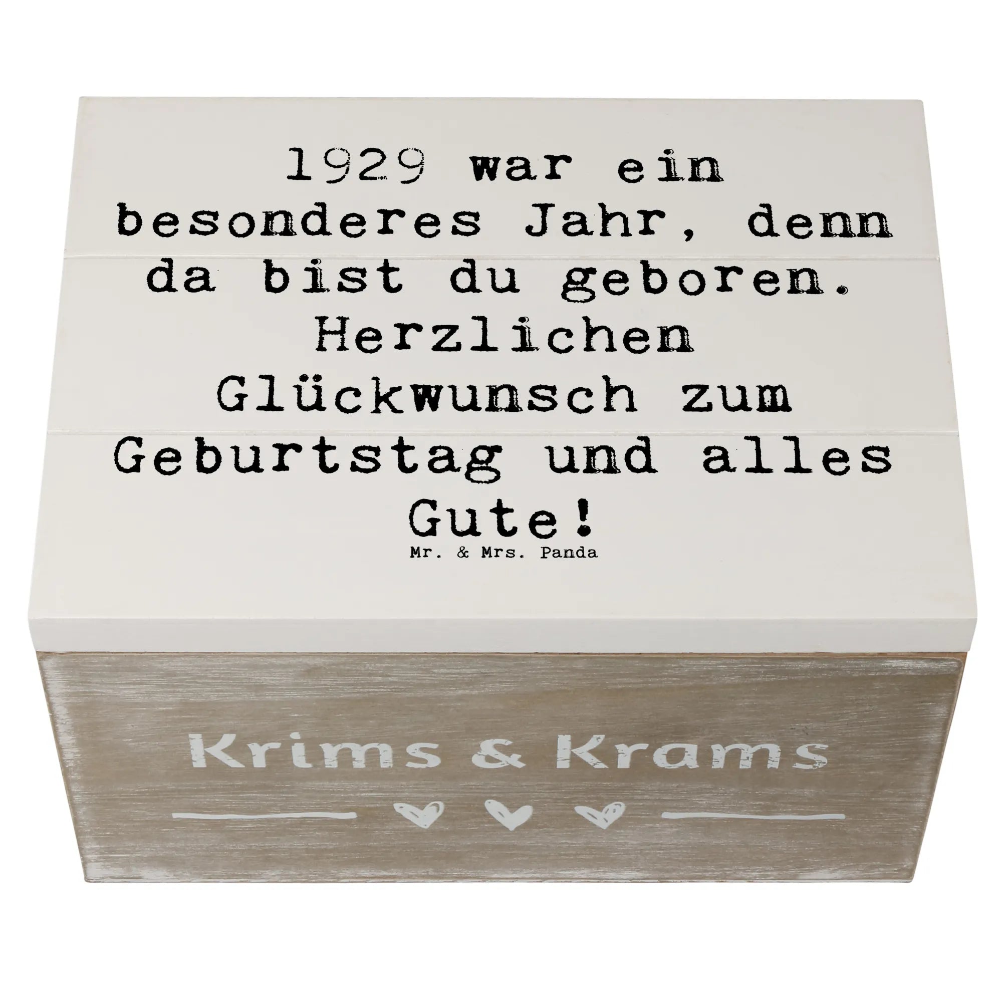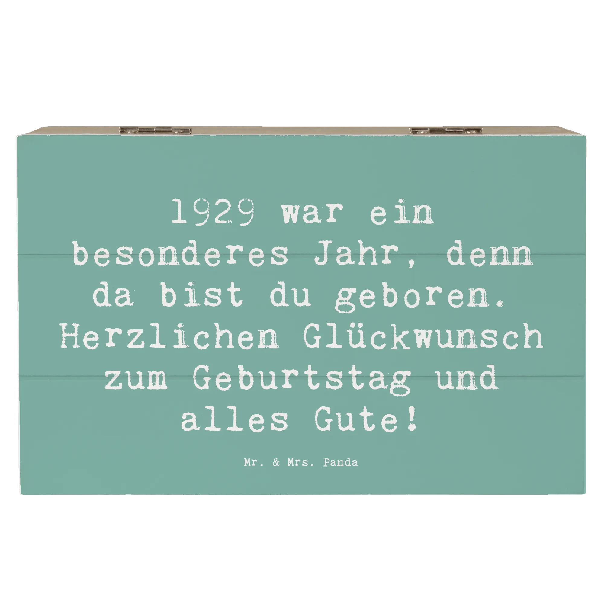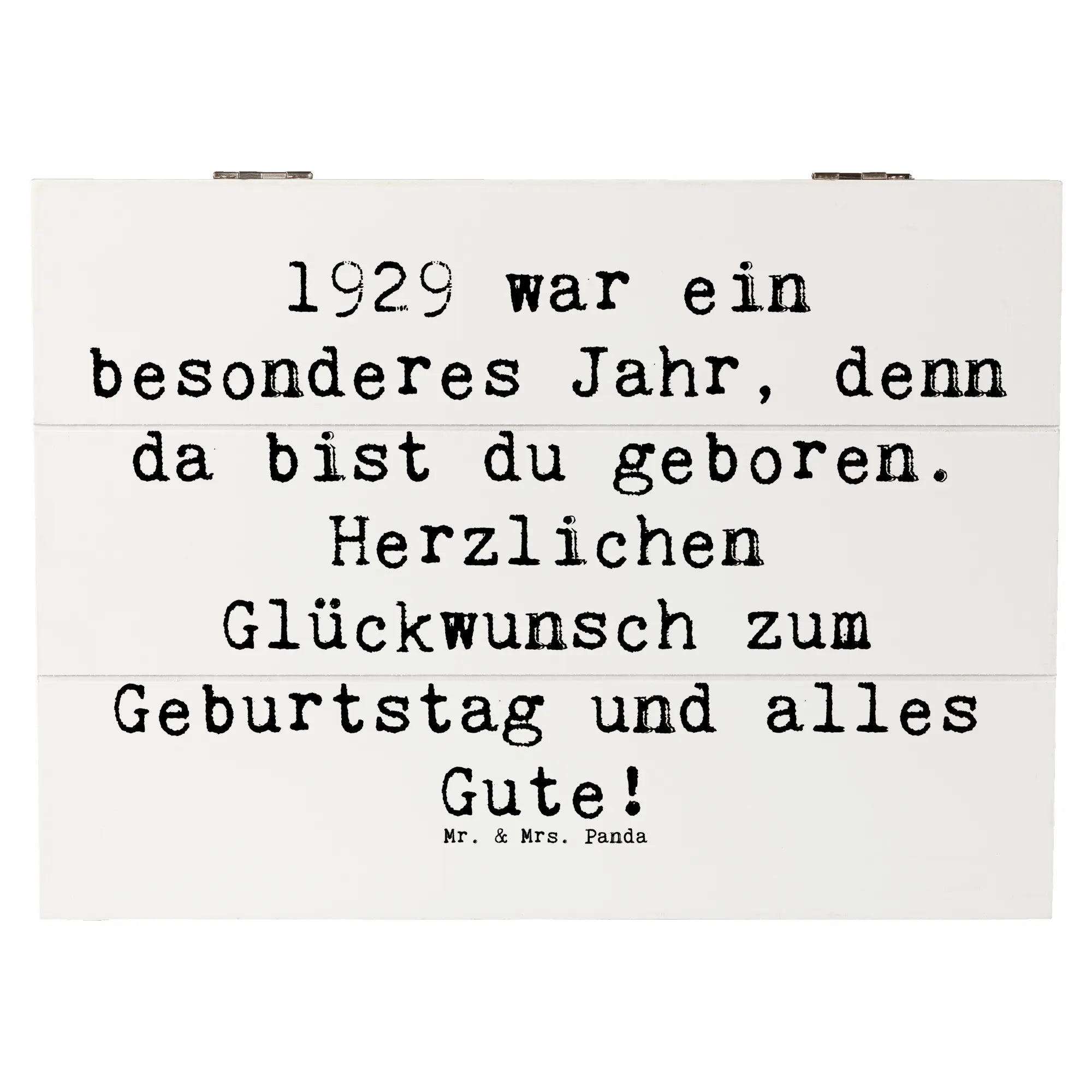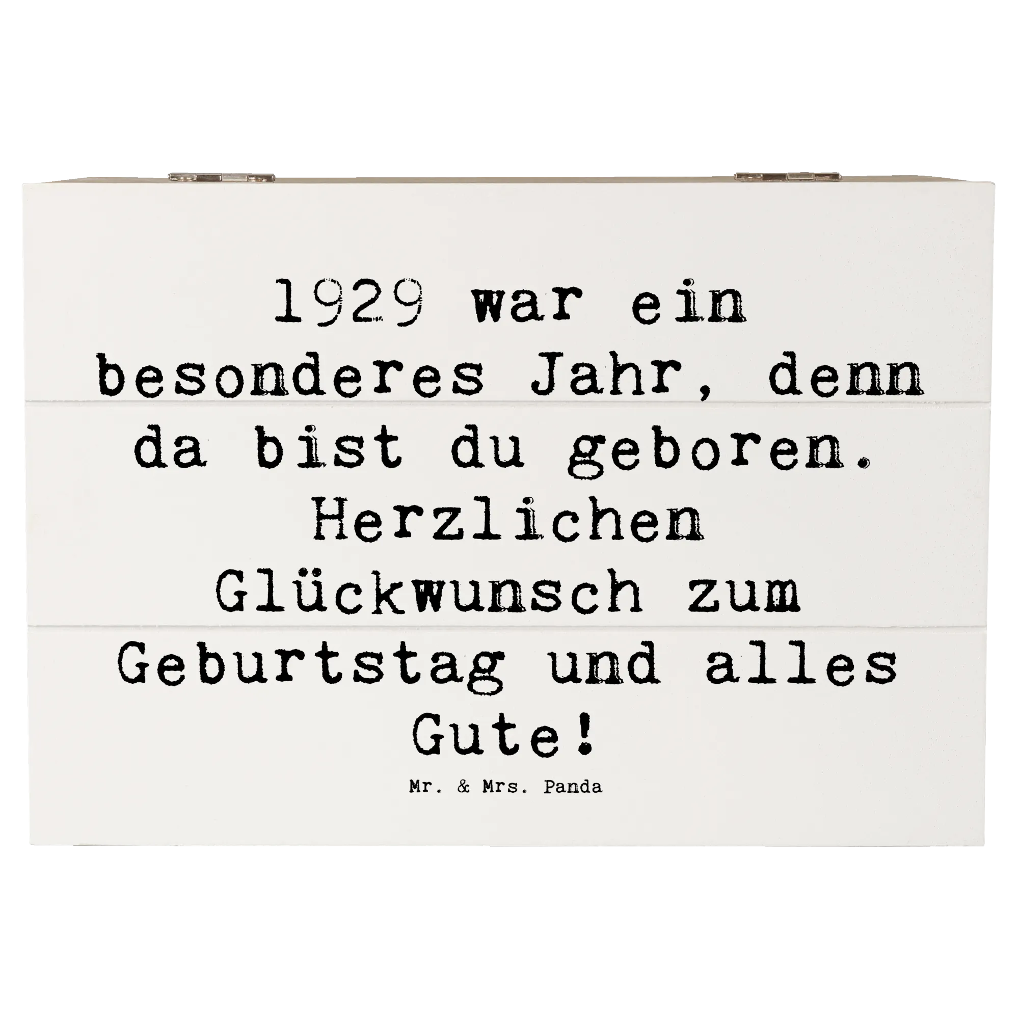 Die Holzkiste mit dem Motiv '1929 Geburtstag' ist Teil der liebevollen Geburtstag Geburtsjahr-Kollektion von Mr. & Mrs. Panda, die dafür entworfen wurde, bedeutungsvolle Geschenke zu kreieren. Jedes Produkt erzählt eine Geschichte, trägt einen Hauch von Nostalgie und bringt Freude in jeden Geburtstag. Damit wird jeder Geburtstag unvergesslich! Hol dir jetzt diese stilvolle und nostalgische Aufbewahrungsbox und mach einen lieben Menschen glücklich.