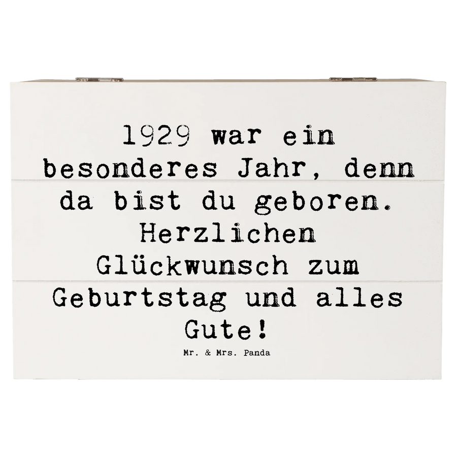 Die Holzkiste "1929 Geburtstag" von Mr. & Mrs. Panda ist das perfekte Geschenk für Menschen, die im Jahr 1929 geboren wurden. Diese wunderschöne Holzkiste lädt zum Träumen und Sammeln ein und ist der ideale Aufbewahrungsort für all die kostbaren Erinnerungen, die du im Laufe der Jahre gesammelt hast.