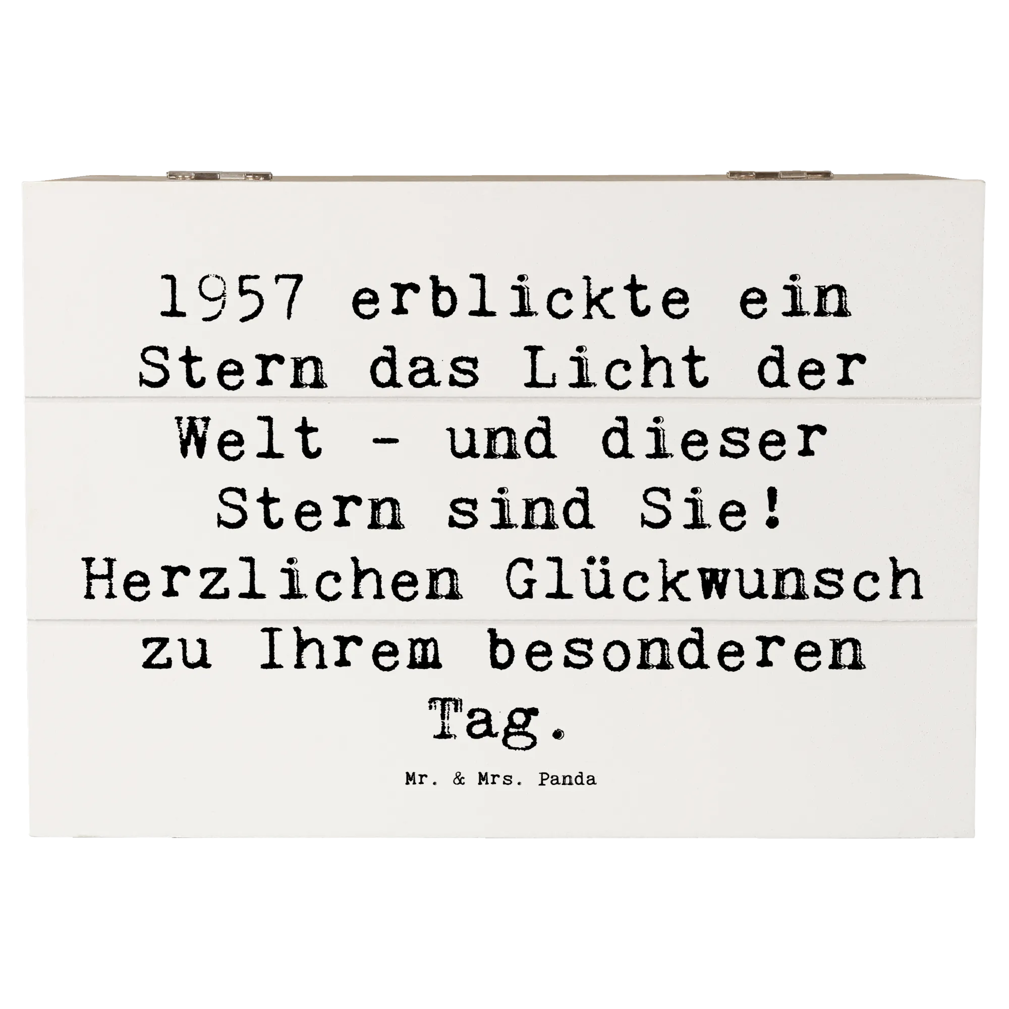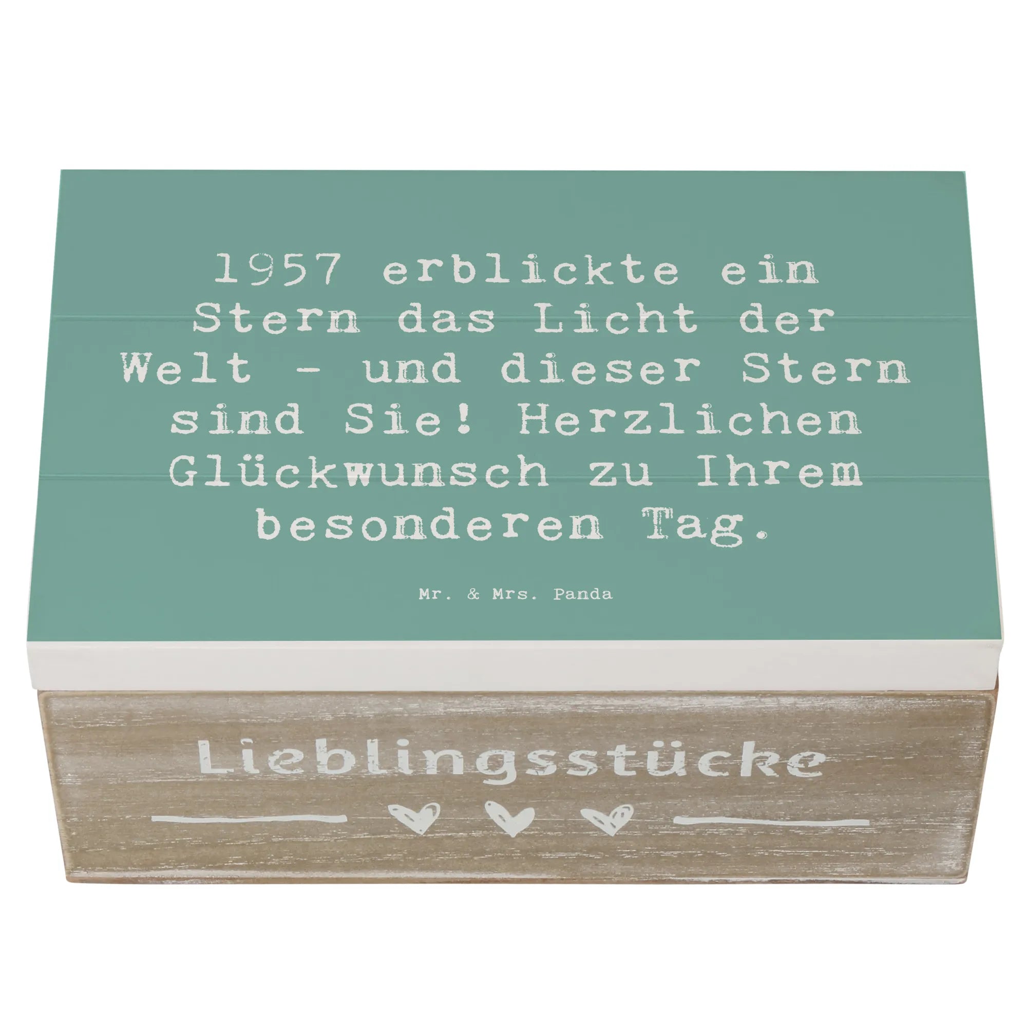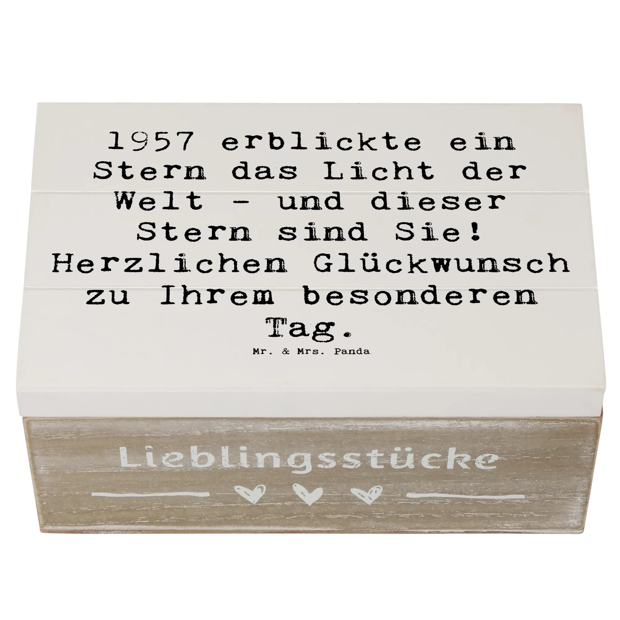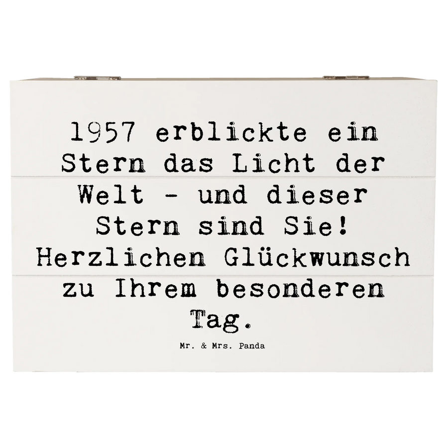 Die wunderschöne Holzkiste von Mr. & Mrs. Panda ist das perfekte Geschenk für alle, die im Jahr 1957 das Licht der Welt erblickt haben. Mit dem liebevollen Spruch "1957 erblickte ein Stern das Licht der Welt - und dieser Stern sind Sie! Herzlichen Glückwunsch zu Ihrem besonderen Tag." sorgt diese Erinnerungskiste nicht nur für Freude, sondern auch für nostalgische Momente.