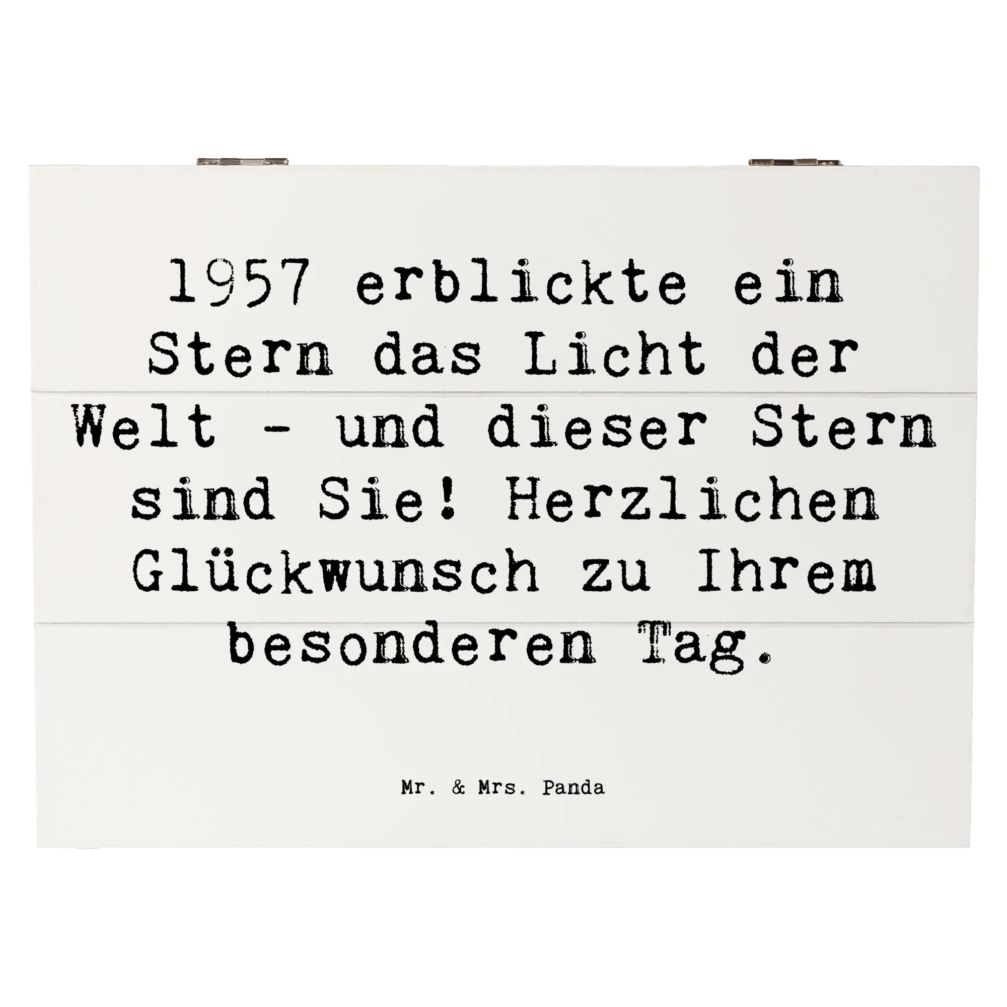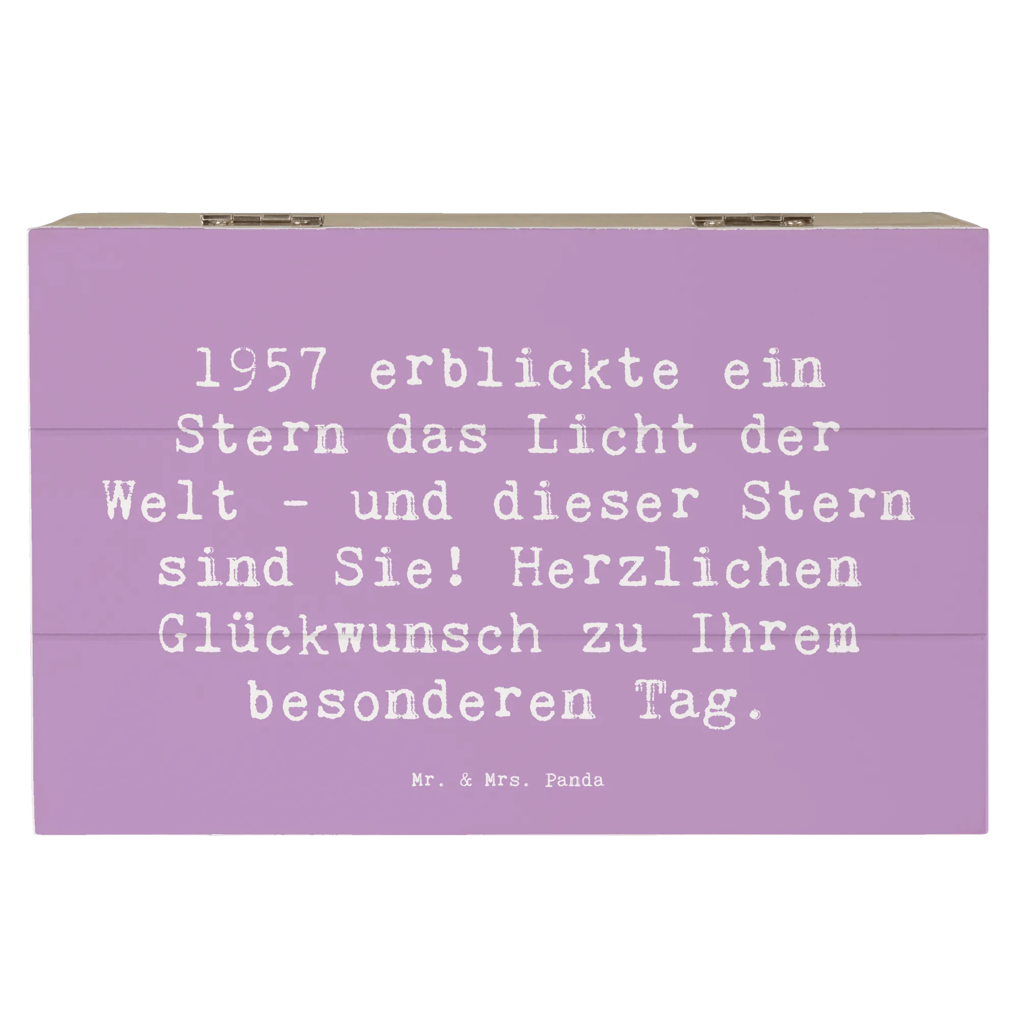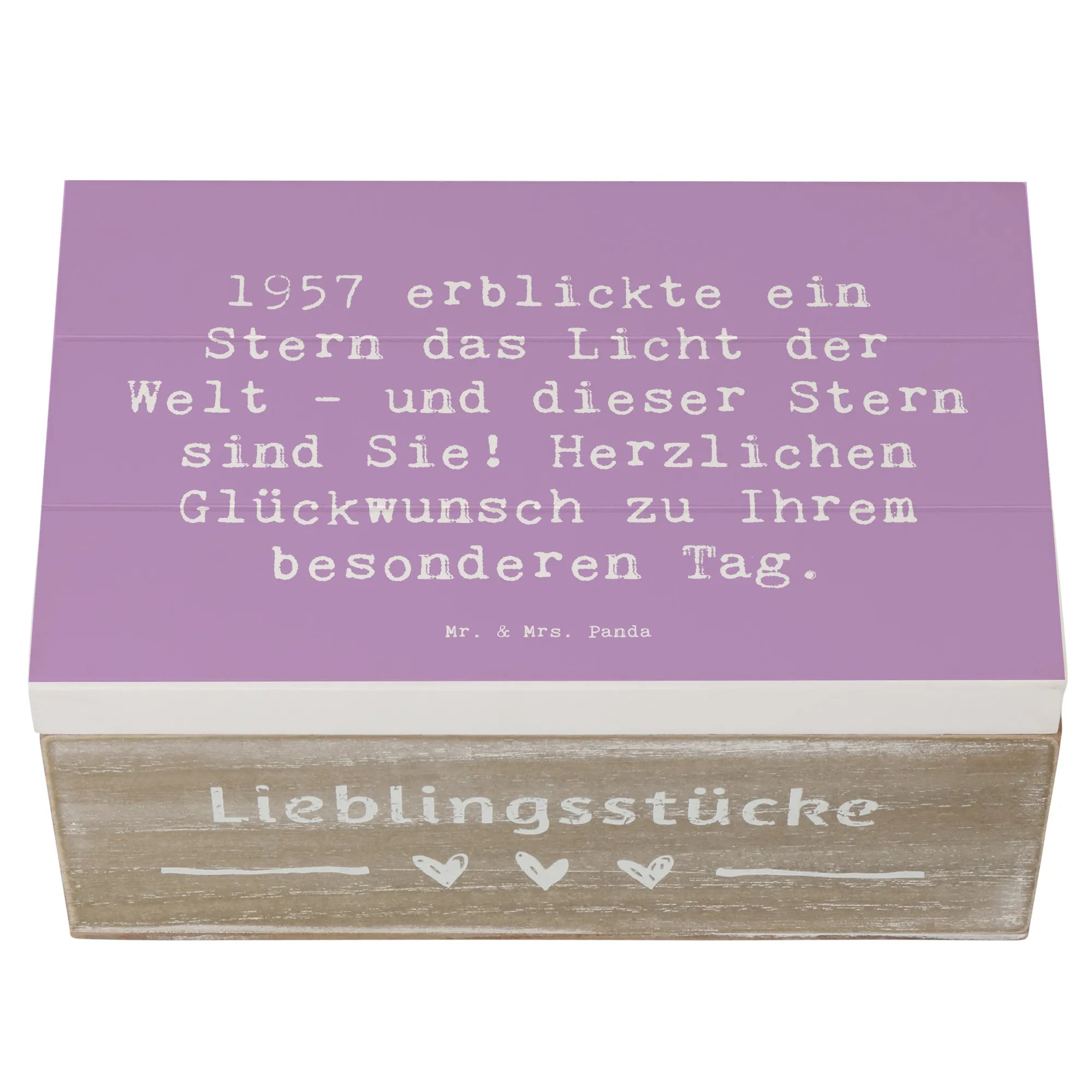 Die wunderschöne Holzkiste von Mr. & Mrs. Panda ist das perfekte Geschenk für alle, die im Jahr 1957 das Licht der Welt erblickt haben. Mit dem liebevollen Spruch "1957 erblickte ein Stern das Licht der Welt - und dieser Stern sind Sie! Herzlichen Glückwunsch zu Ihrem besonderen Tag." sorgt diese Erinnerungskiste nicht nur für Freude, sondern auch für nostalgische Momente.