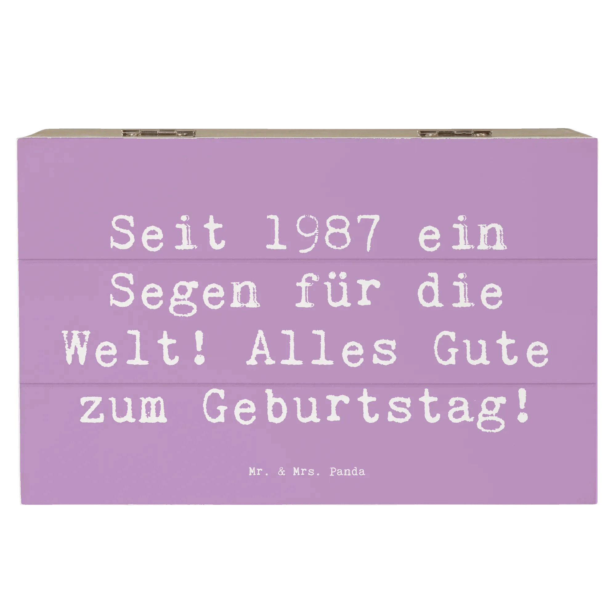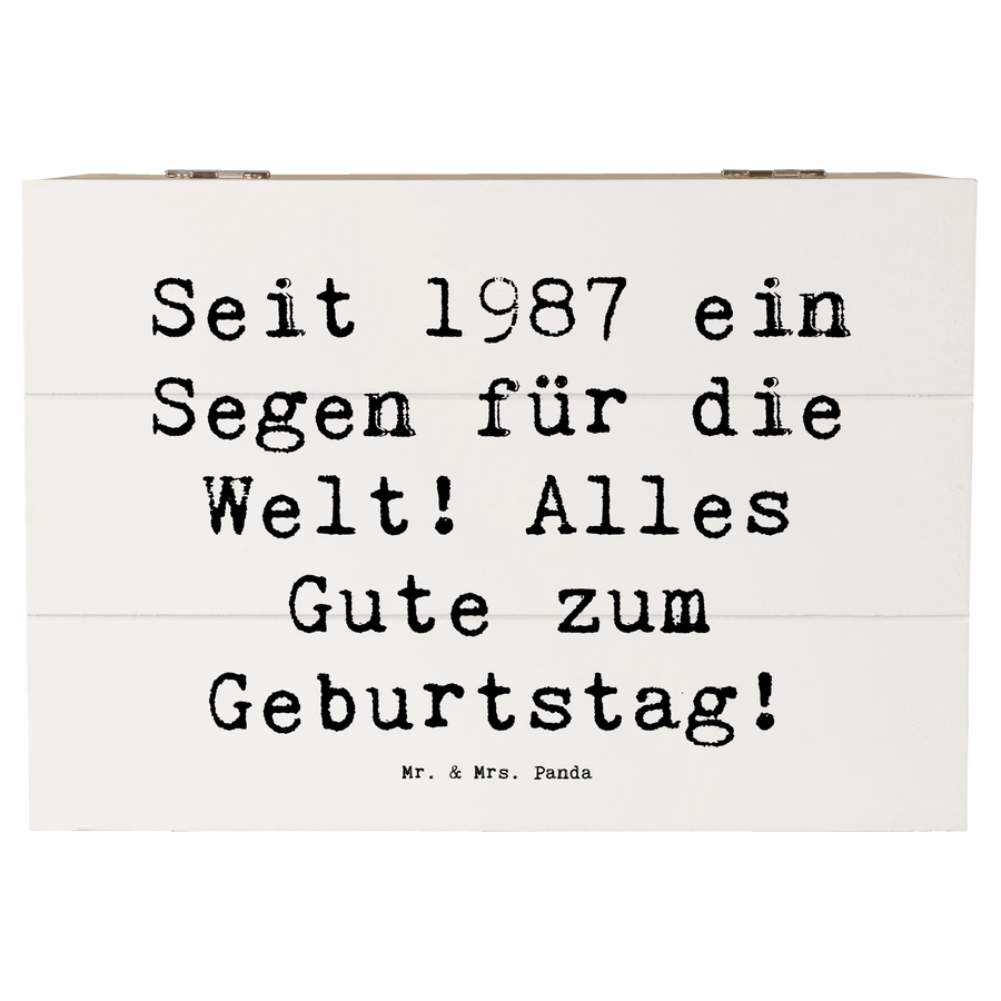 Die wunderschöne Holzkiste von Mr. & Mrs. Panda ist das perfekte Geschenk für alle, die 1987 geboren wurden! Mit ihrem liebevollen Design und dem Spruch "Seit 1987 ein Segen für die Welt! Alles Gute zum Geburtstag!" ist sie nicht nur eine Erinnerung an einen besonderen Geburtstag, sondern auch ein toller Aufbewahrungsort für all deine Schätze.