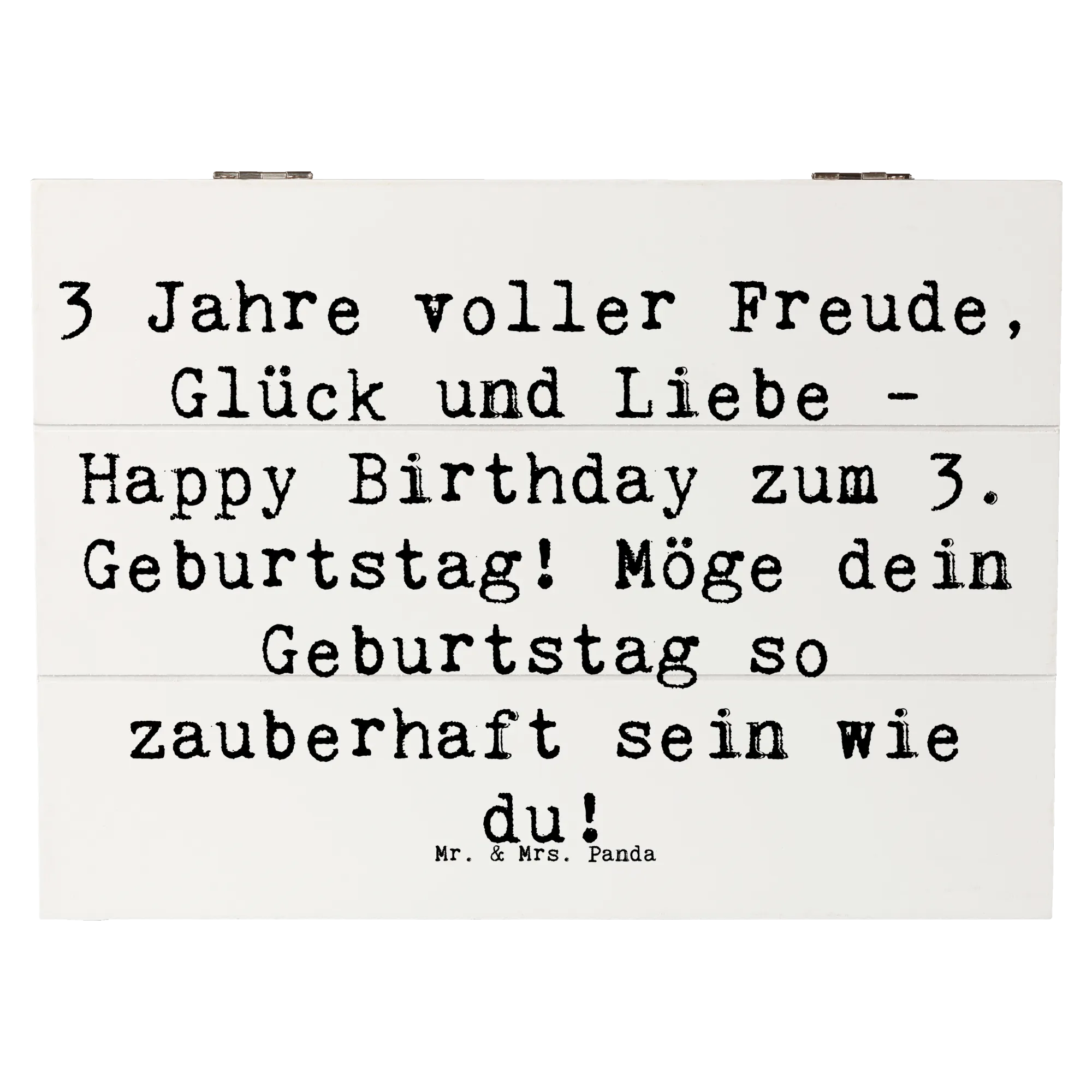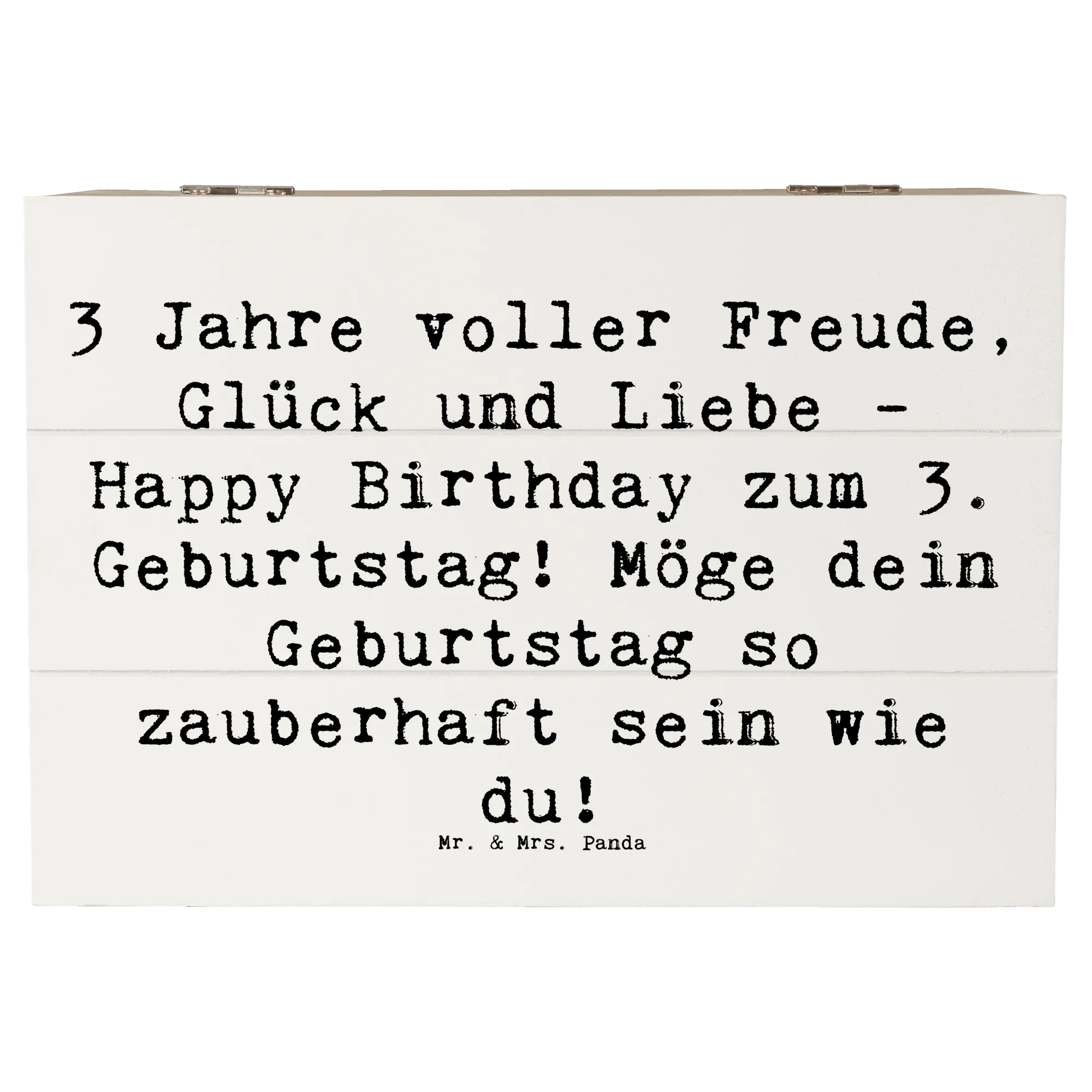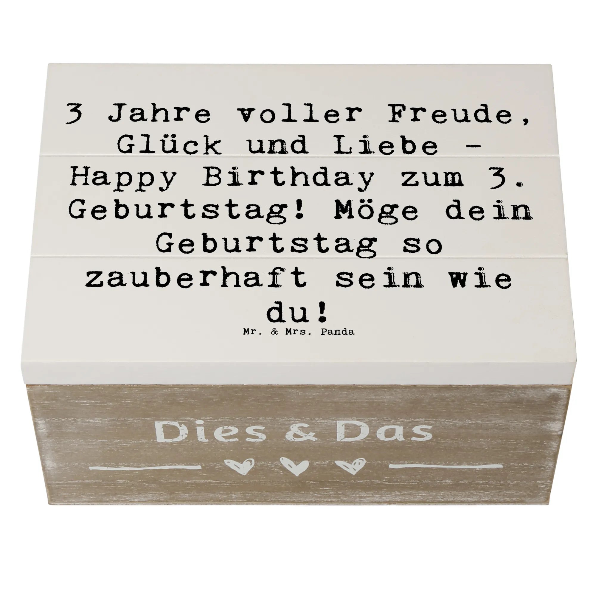 Die wunderschöne Holzkiste von Mr. & Mrs. Panda mit dem Motiv "3 Jahre voller Freude, Glück und Liebe - Happy Birthday zum 3. Geburtstag! Möge dein Geburtstag so zauberhaft sein wie du!" ist das perfekte Geschenk für alle kleinen Geburtstagskinder. Diese robuste Schatzkiste, aus hochwertigem Premium Hartfaser gefertigt, bietet nicht nur einen stilvollen Aufbewahrungsort für die wertvollsten Schätze des Kindes, sondern sichert auch unvergessliche Erinnerungen.