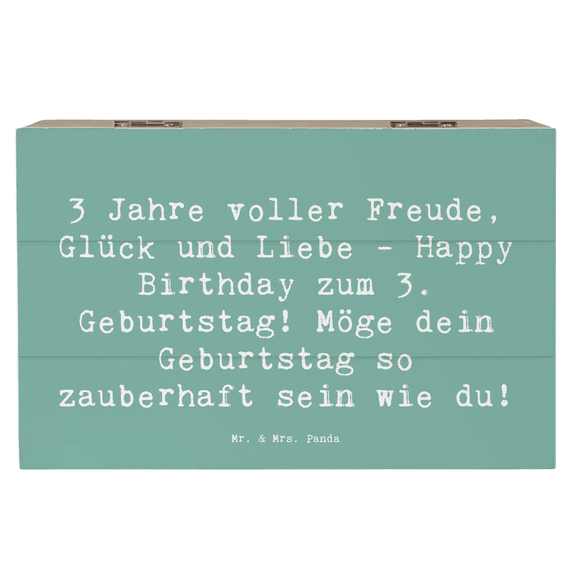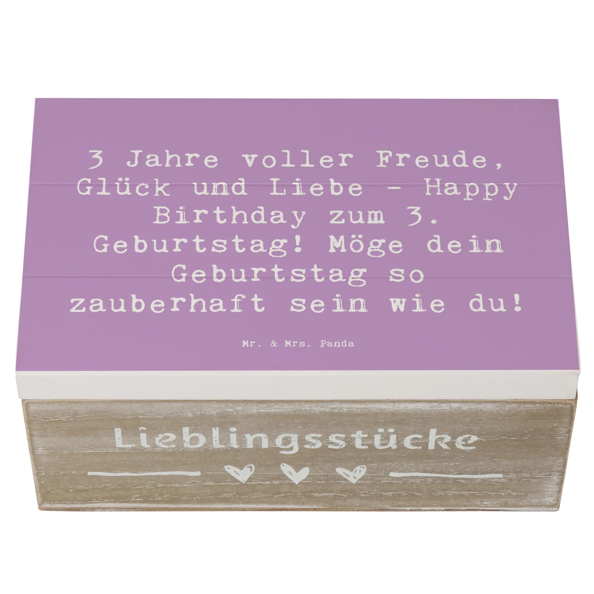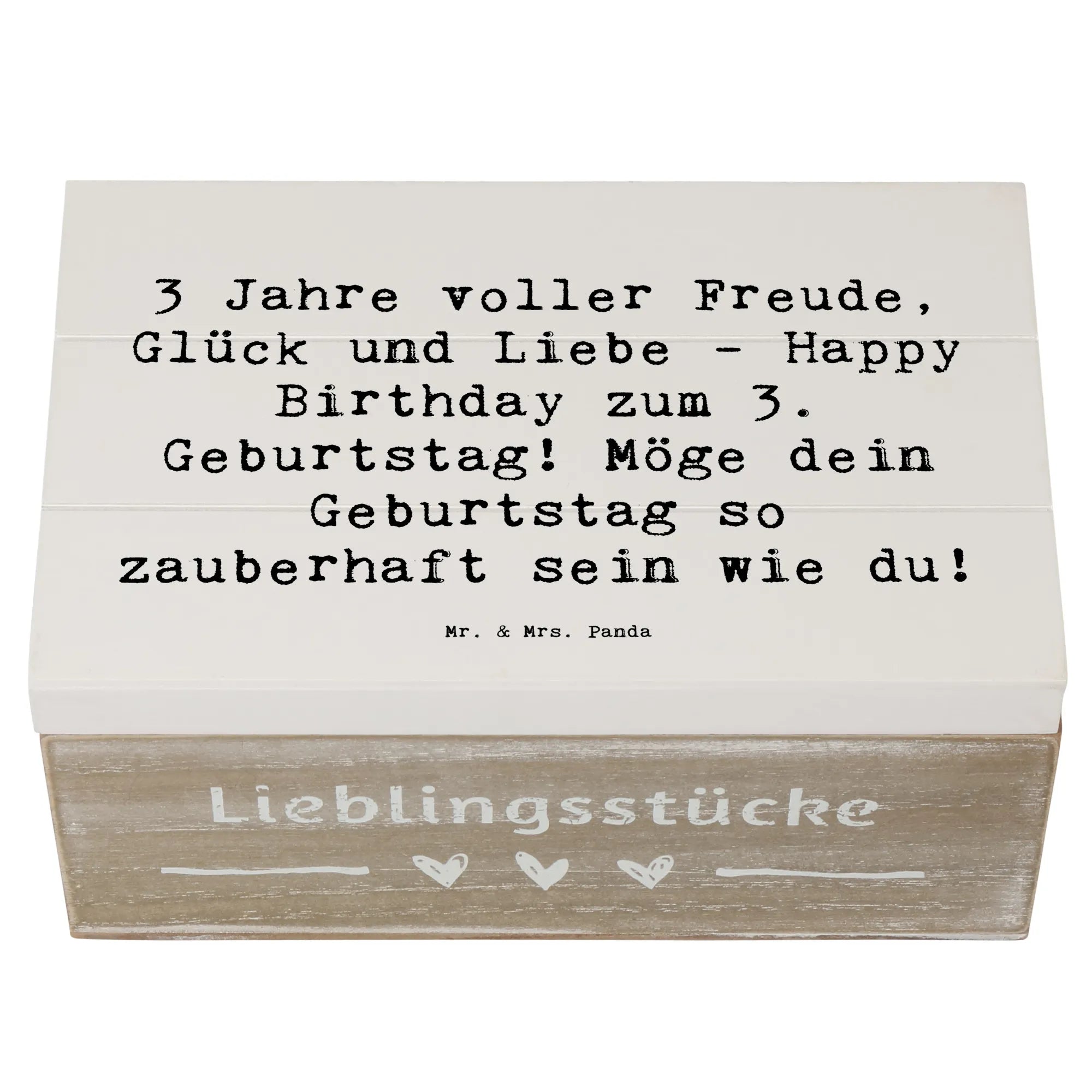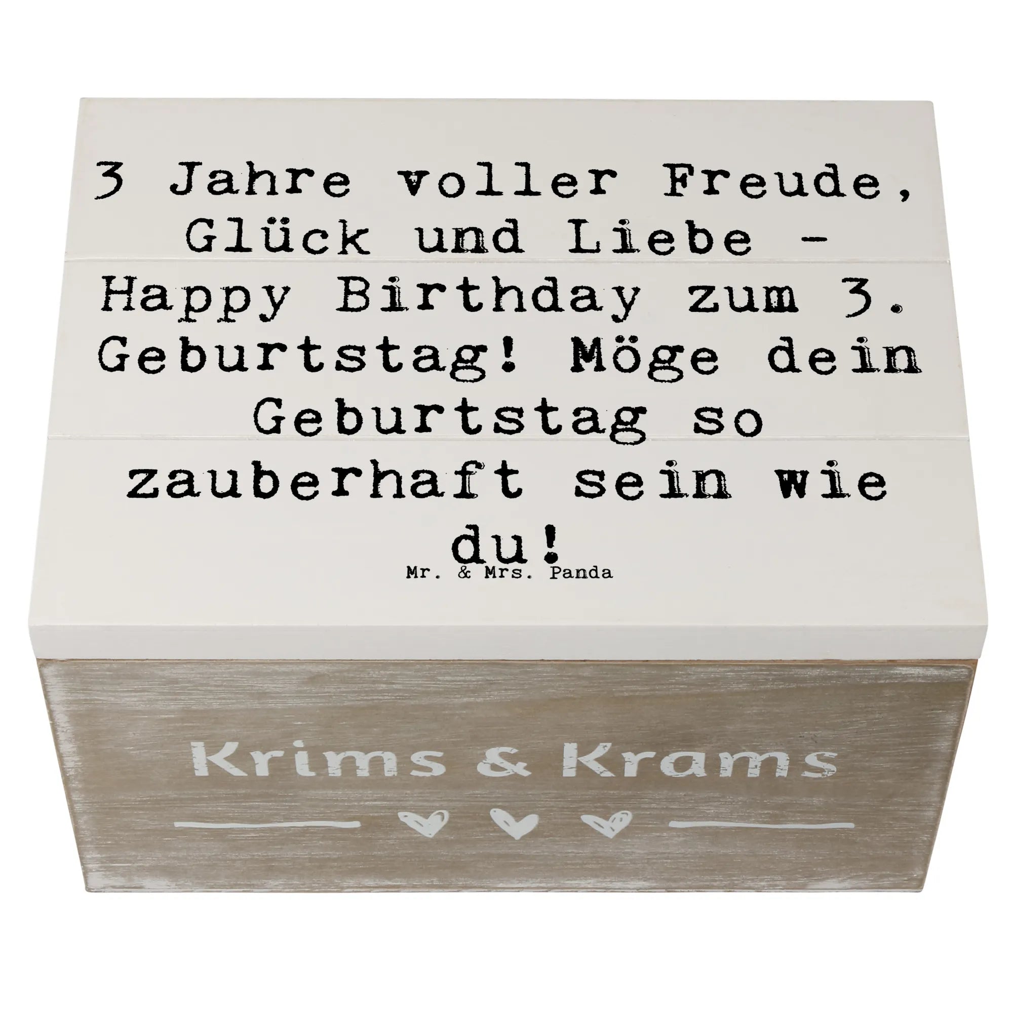 Die wunderschöne Holzkiste von Mr. & Mrs. Panda mit dem Motiv "3 Jahre voller Freude, Glück und Liebe - Happy Birthday zum 3. Geburtstag! Möge dein Geburtstag so zauberhaft sein wie du!" ist das perfekte Geschenk für alle kleinen Geburtstagskinder. Diese robuste Schatzkiste, aus hochwertigem Premium Hartfaser gefertigt, bietet nicht nur einen stilvollen Aufbewahrungsort für die wertvollsten Schätze des Kindes, sondern sichert auch unvergessliche Erinnerungen.
