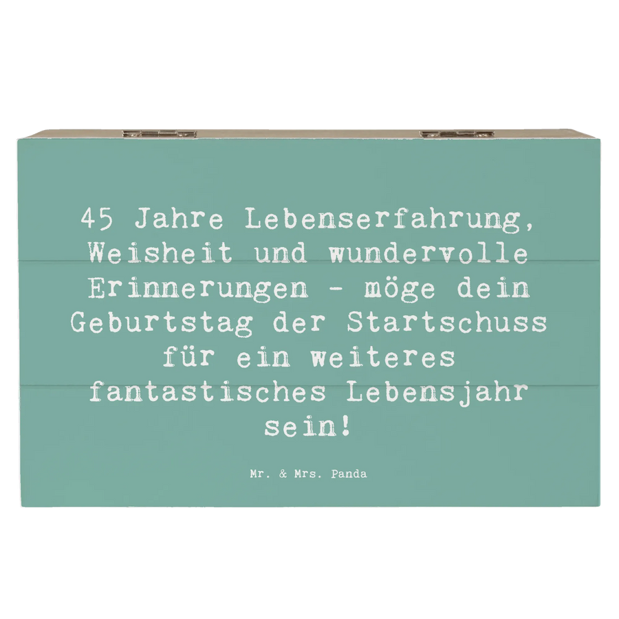 Die wunderschöne Holzkiste zum 45. Geburtstag von Mr. & Mrs. Panda ist das ideale Geschenk für jeden, der diesen besonderen Tag feiert. Mit ihrem zauberhaften Design und dem liebevollen Spruch "45 Jahre Lebenserfahrung, Weisheit und wundervolle Erinnerungen - möge dein Geburtstag der Startschuss für ein weiteres fantastisches Lebensjahr sein!" verkörpert diese Kiste die Lebensfreude und die besonderen Erinnerungen, die jeder Geburtstag mit sich bringt.