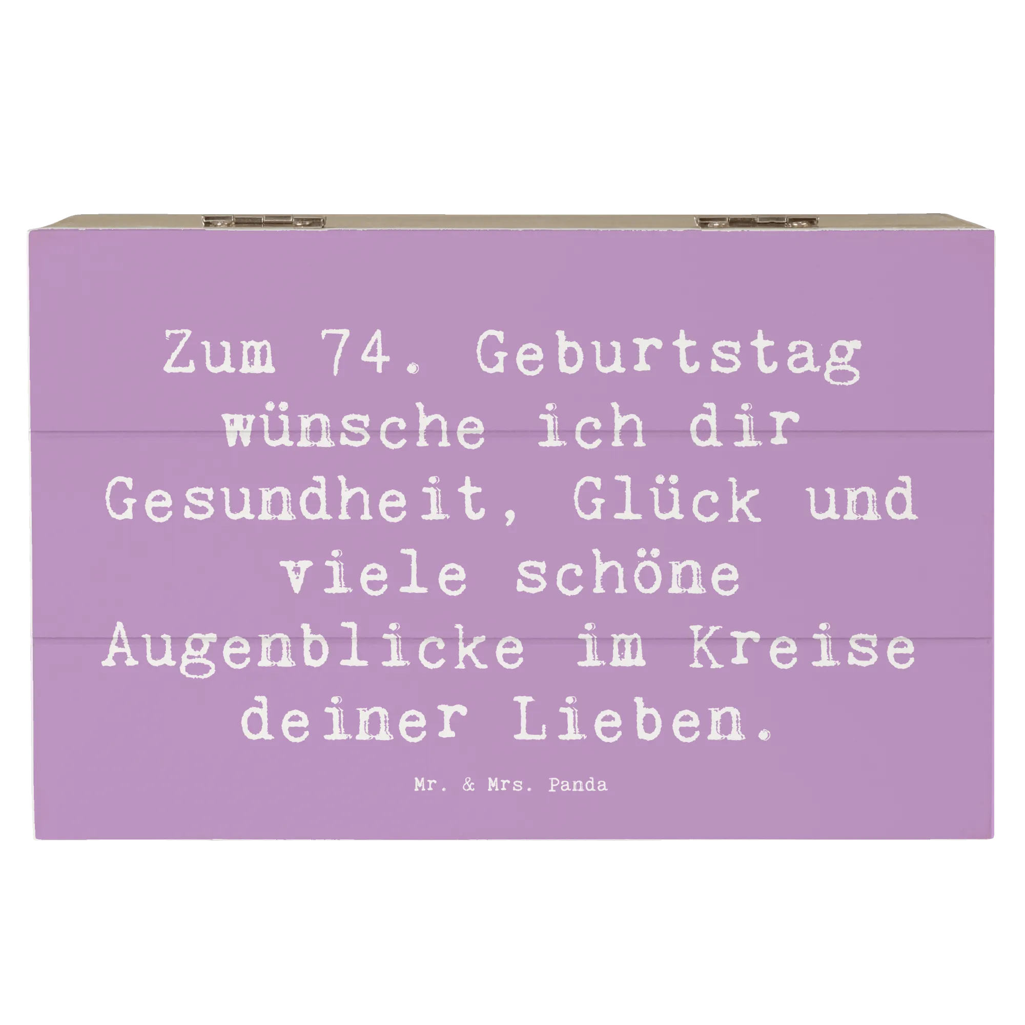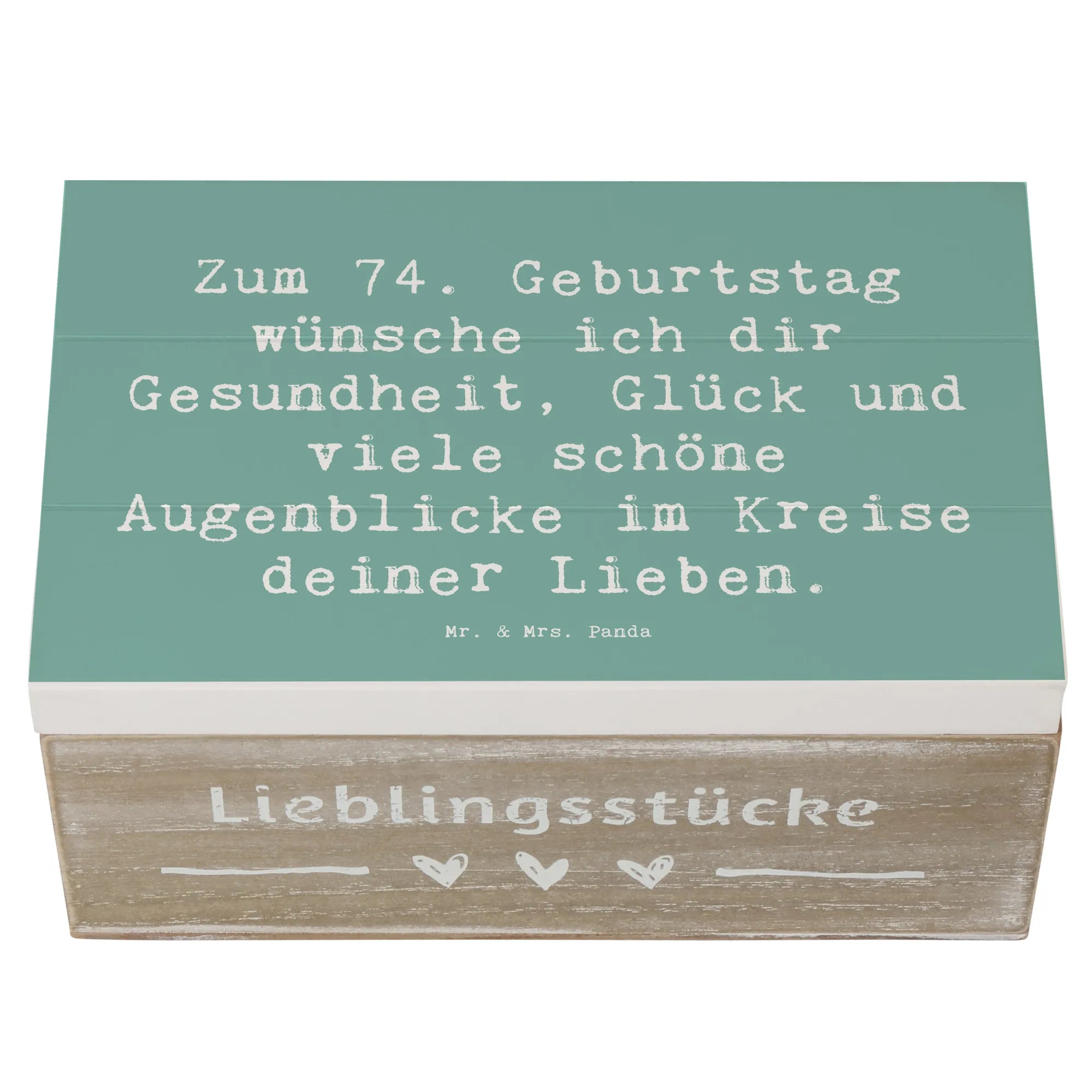 Mit dem liebevollen Spruch 'Zum 74. Geburtstag wünsche ich dir Gesundheit, Glück und viele schöne Augenblicke im Kreise deiner Lieben' wird jedes Mal, wenn man die Kiste öffnet, ein Stück Lebensfreude verschenkt. Die Kiste hat die Maße 190 mm x 120 mm x 100 mm und besteht aus hochwertiger, wasserabweisender Holzfaser, die sich durch besondere Stabilität auszeichnet.