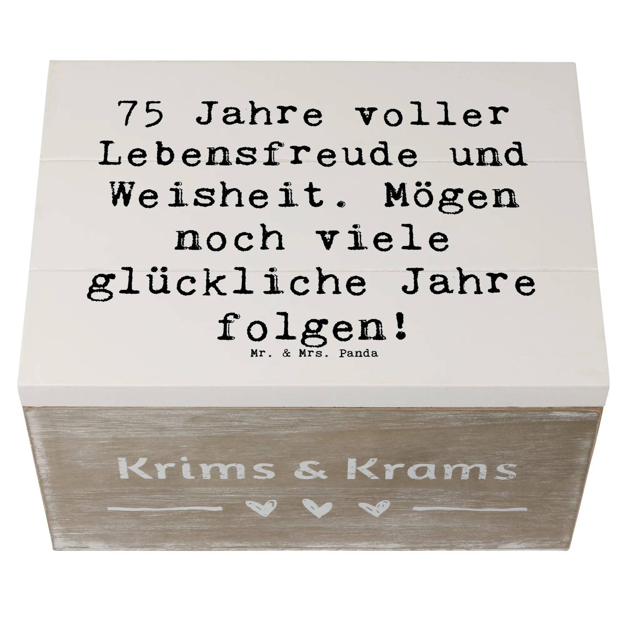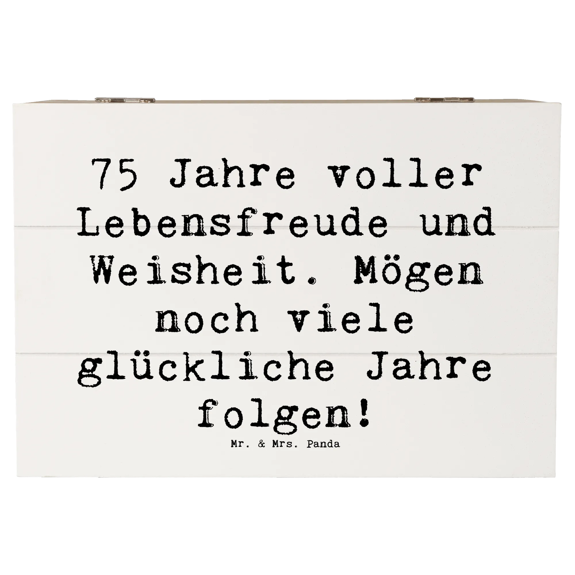 Eine liebevolle Holzkiste für den 75. Geburtstag 🎉 – Unsere Mr. & Mrs. Panda Schatzkiste trägt den warmen Spruch: „75 Jahre voller Lebensfreude und Weisheit. Mögen noch viele glückliche Jahre folgen!“ und ist damit das perfekte Geschenk, um ein großes Lebensjahr zu feiern.
