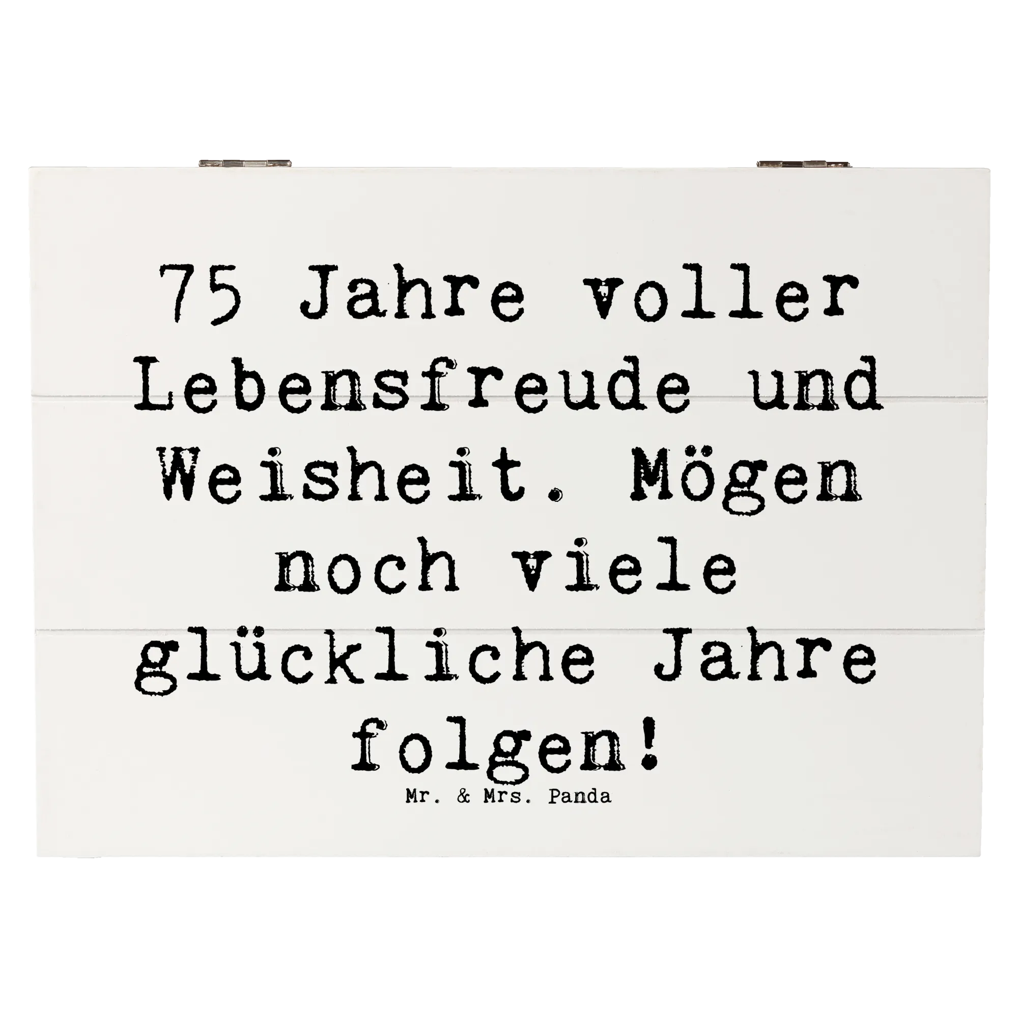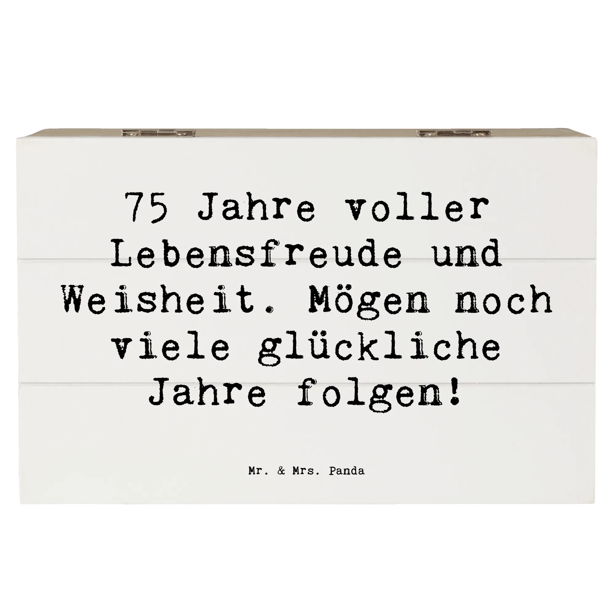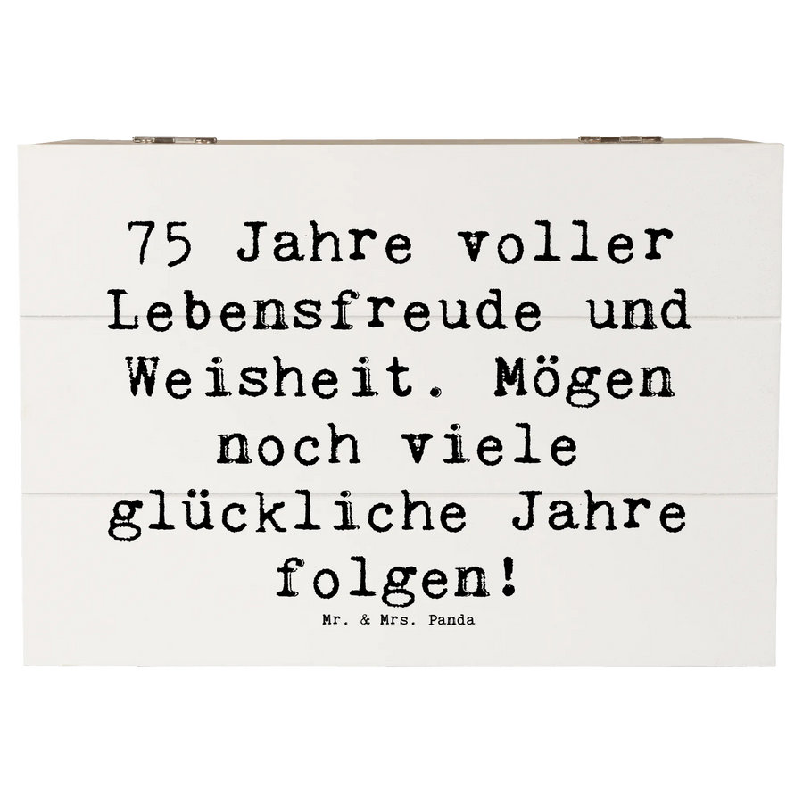 Die wunderschöne Holzkiste von Mr. & Mrs. Panda ist das perfekte Geschenk zum 75. Geburtstag! Sie kombiniert charmante Designs mit einem herzlichen Spruch: '75 Jahre voller Lebensfreude und Weisheit. Mögen noch viele glückliche Jahre folgen!'. Diese Erinnerungskiste ist ideal, um die schönsten Schätze Deines Lebens aufzubewahren. Egal, ob Fotos, kleine Geschenke oder andere besondere Erinnerungen - in dieser stabilen Holzkiste ist alles sicher verstaut.