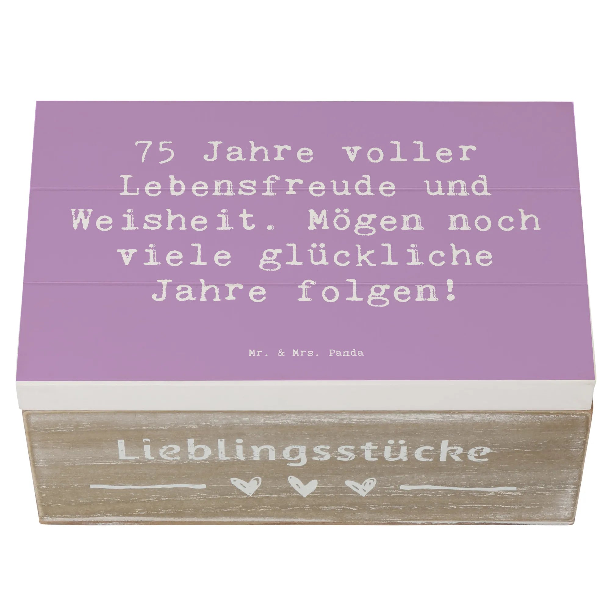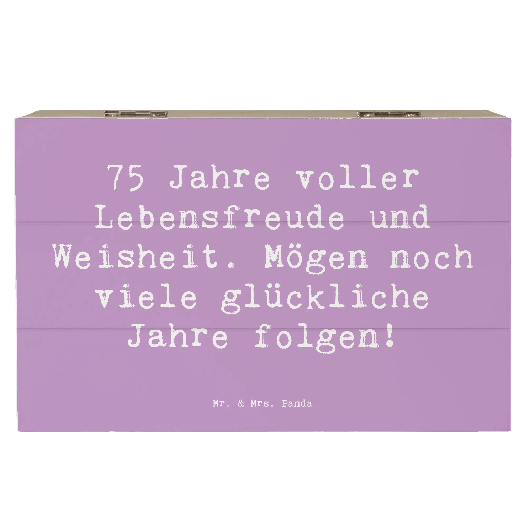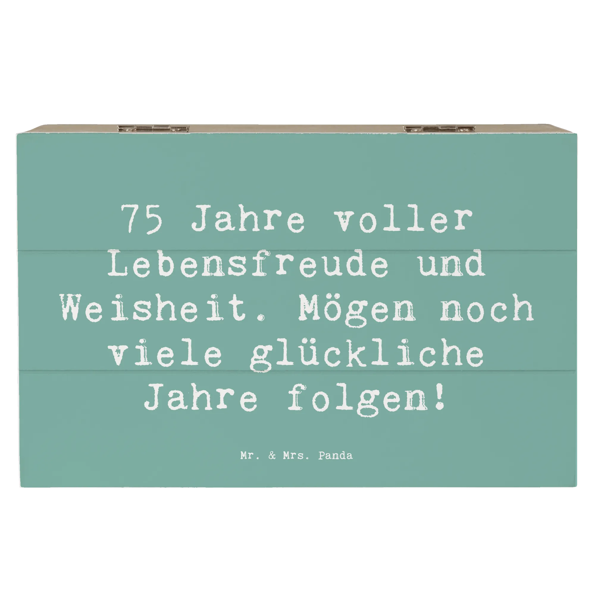 Die wunderschöne Holzkiste von Mr. & Mrs. Panda ist das perfekte Geschenk zum 75. Geburtstag! Sie kombiniert charmante Designs mit einem herzlichen Spruch: '75 Jahre voller Lebensfreude und Weisheit. Mögen noch viele glückliche Jahre folgen!'. Diese Erinnerungskiste ist ideal, um die schönsten Schätze Deines Lebens aufzubewahren. Egal, ob Fotos, kleine Geschenke oder andere besondere Erinnerungen - in dieser stabilen Holzkiste ist alles sicher verstaut.