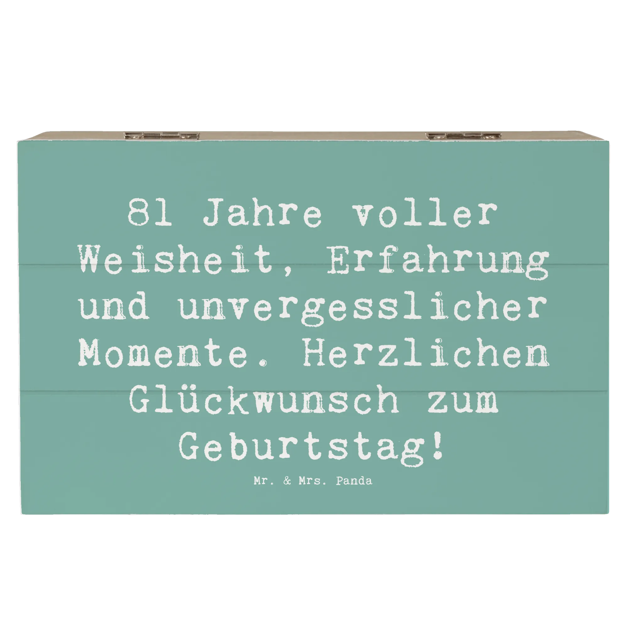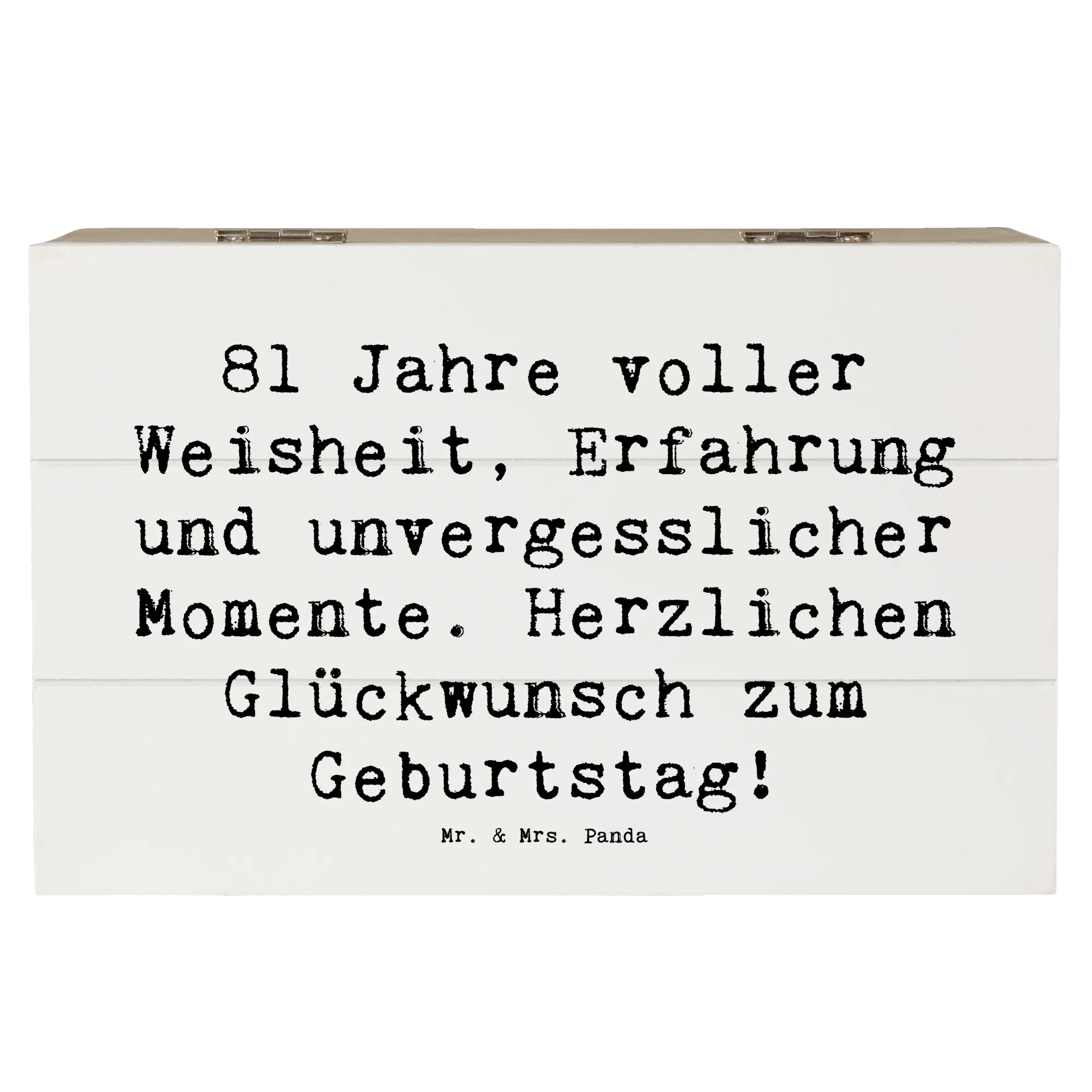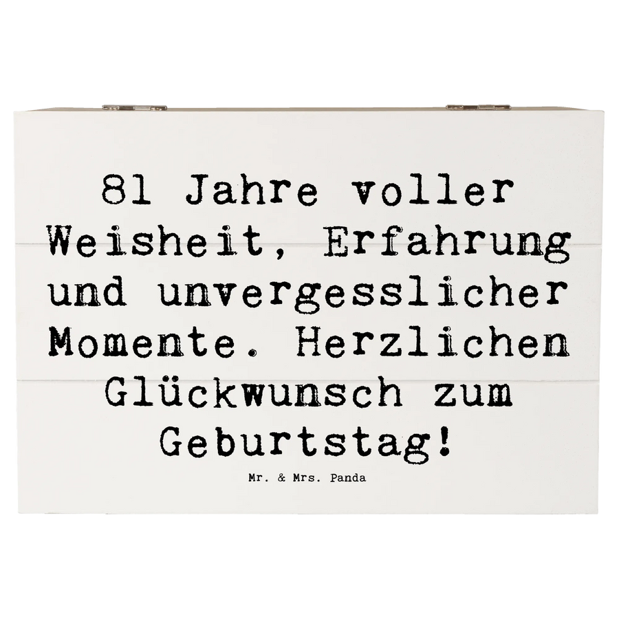 Die wunderschöne Holzkiste von Mr. & Mrs. Panda ist das perfekte Geschenk zum 81. Geburtstag! Diese besondere Kiste, bedruckt mit dem liebevollen Spruch "81 Jahre voller Weisheit, Erfahrung und unvergesslicher Momente. Herzlichen Glückwunsch zum Geburtstag!", ist ein wunderschöner und einzigartiger Weg, um wertvolle Erinnerungen festzuhalten.
