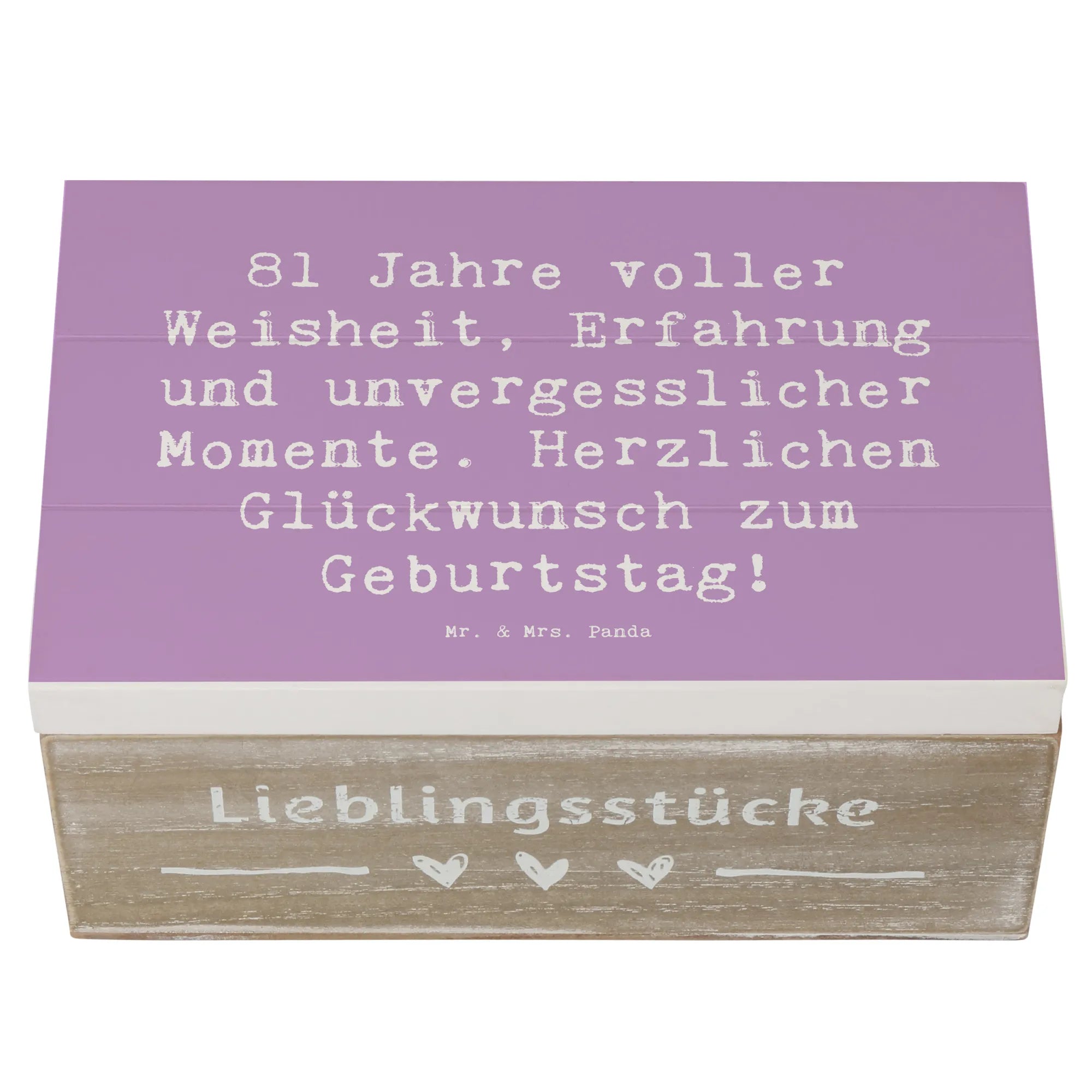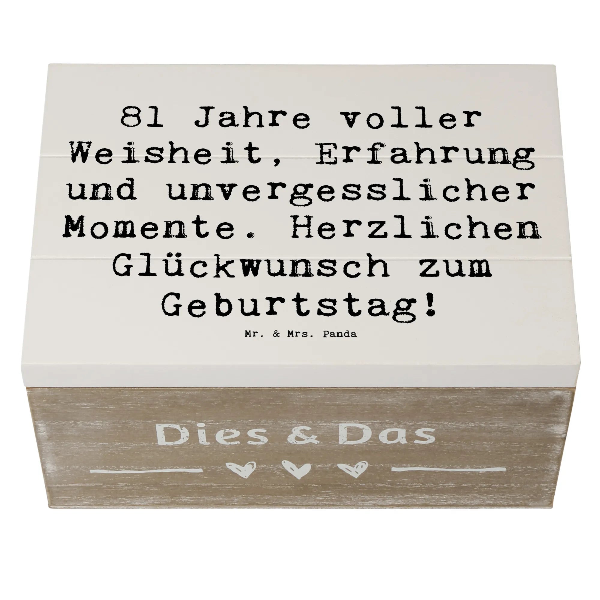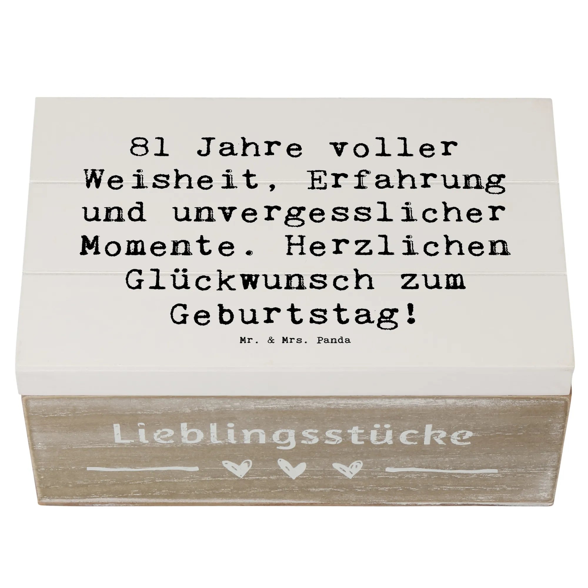 Die wunderschöne Holzkiste von Mr. & Mrs. Panda ist das perfekte Geschenk zum 81. Geburtstag! Sie ist nicht nur ein stilvolles Aufbewahrungsobjekt, sondern auch eine Schatzkiste voller Erinnerungen. Mit dem liebevoll gestalteten Motiv "81 Jahre voller Weisheit, Erfahrung und unvergesslicher Momente. Herzlichen Glückwunsch zum Geburtstag!" ist diese Erinnerungskiste ein ganz besonderes Geschenk, das von Herzen kommt.