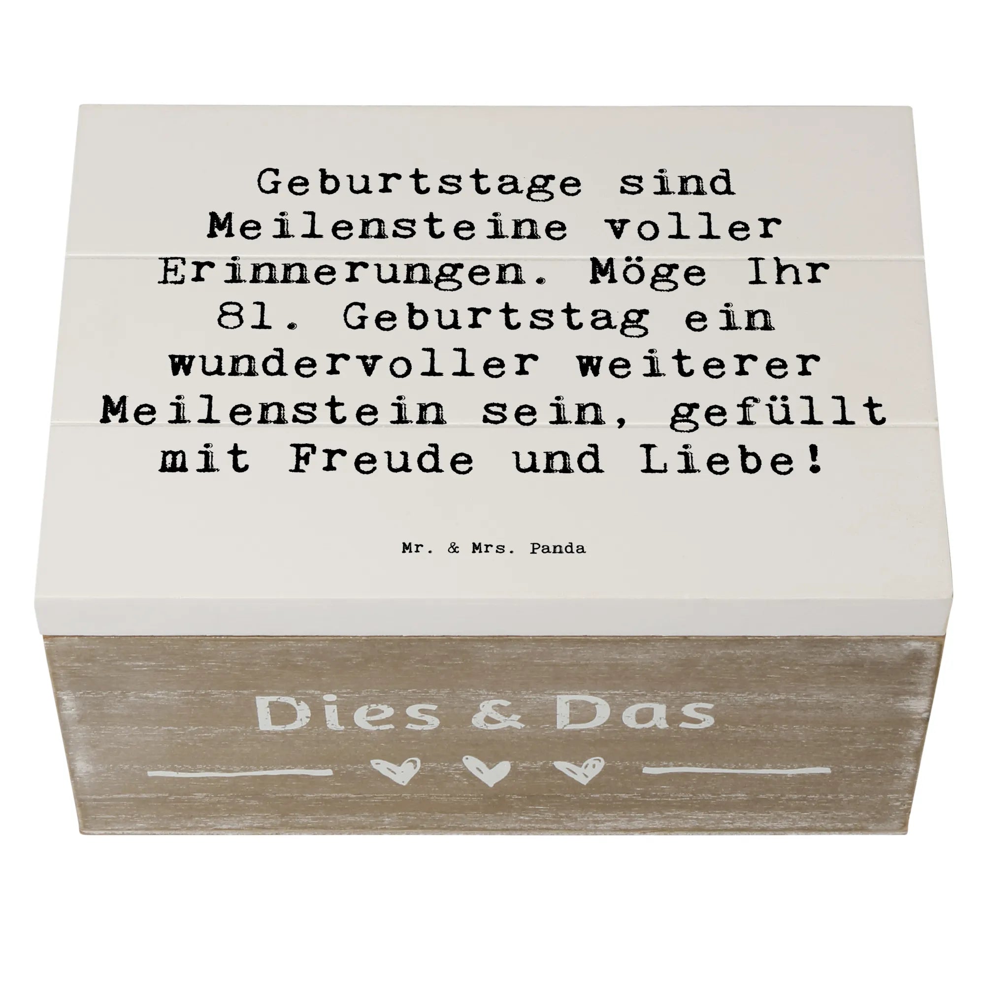 Die wunderschöne Holzkiste von Mr. & Mrs. Panda ist das ideale Geschenk zum 81. Geburtstag! Sie ist nicht nur eine schicke Aufbewahrungsbox, sondern auch eine Erinnerungskiste, die das Herz höherschlagen lässt. Mit dem liebevollen Spruch "Geburtstage sind Meilensteine voller Erinnerungen. Möge Ihr 81. Geburtstag ein wundervoller weiterer Meilenstein sein, gefüllt mit Freude und Liebe!" ist diese Kiste perfekt für all die besonderen Schätze und Erinnerungen, die Du aufbewahren möchtest.