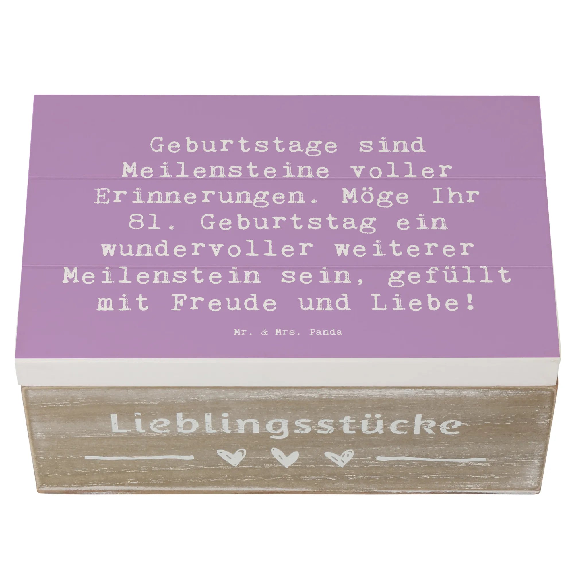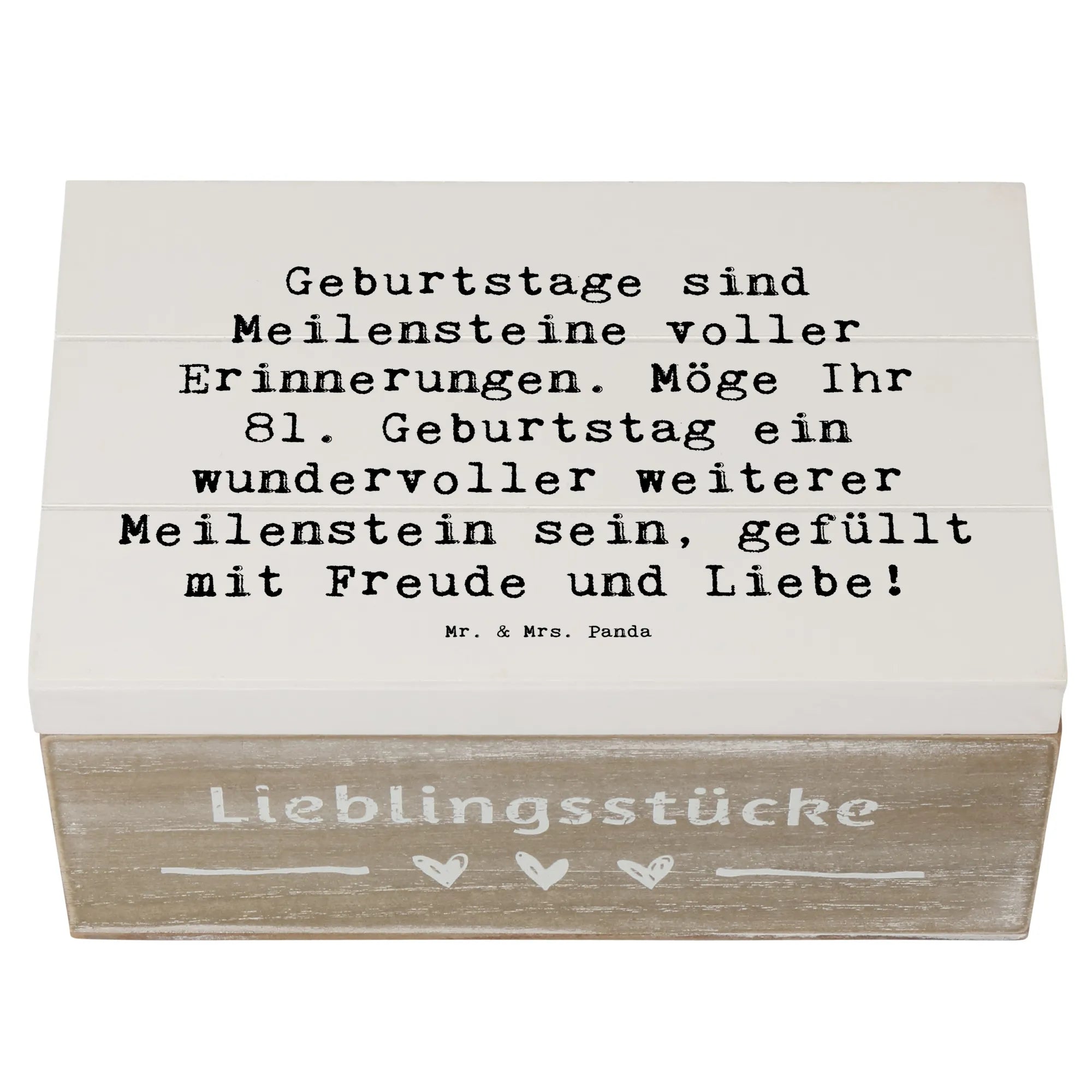 Die Holztruhe zum 81. Geburtstag von Mr. & Mrs. Panda ist das ideale Geschenk, um unvergessliche Erinnerungen zu bewahren! Mit einem liebevoll gestalteteten Motiv und dem herzlichen Spruch "Geburtstage sind Meilensteine voller Erinnerungen. Möge Ihr 81. Geburtstag ein wundervoller weiterer Meilenstein sein, gefüllt mit Freude und Liebe!" eignet sich diese Holzkiste hervorragend als Geburtstagsgeschenk für Freunde, Verwandte oder Kollegen, die diesen besonderen Tag feiern.