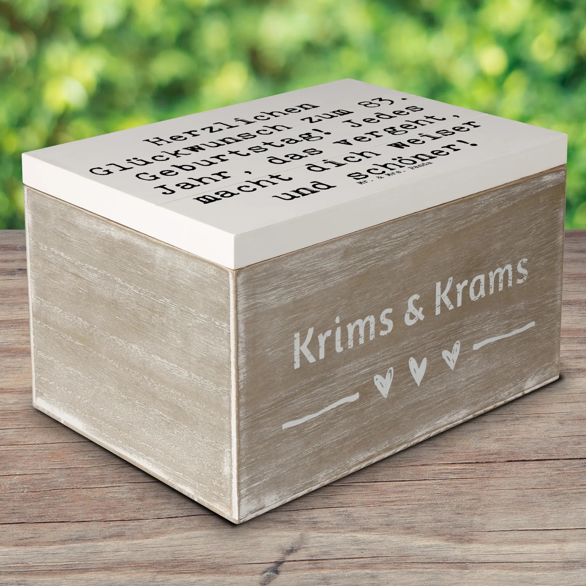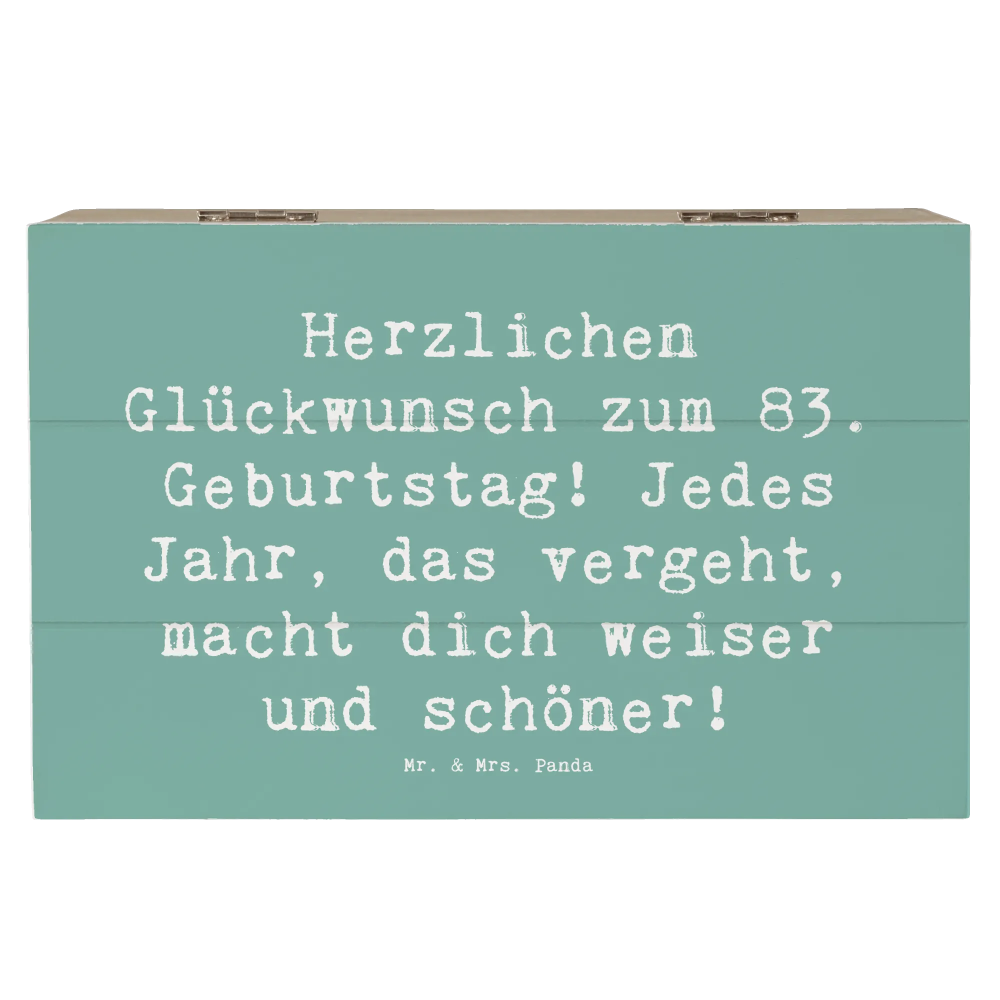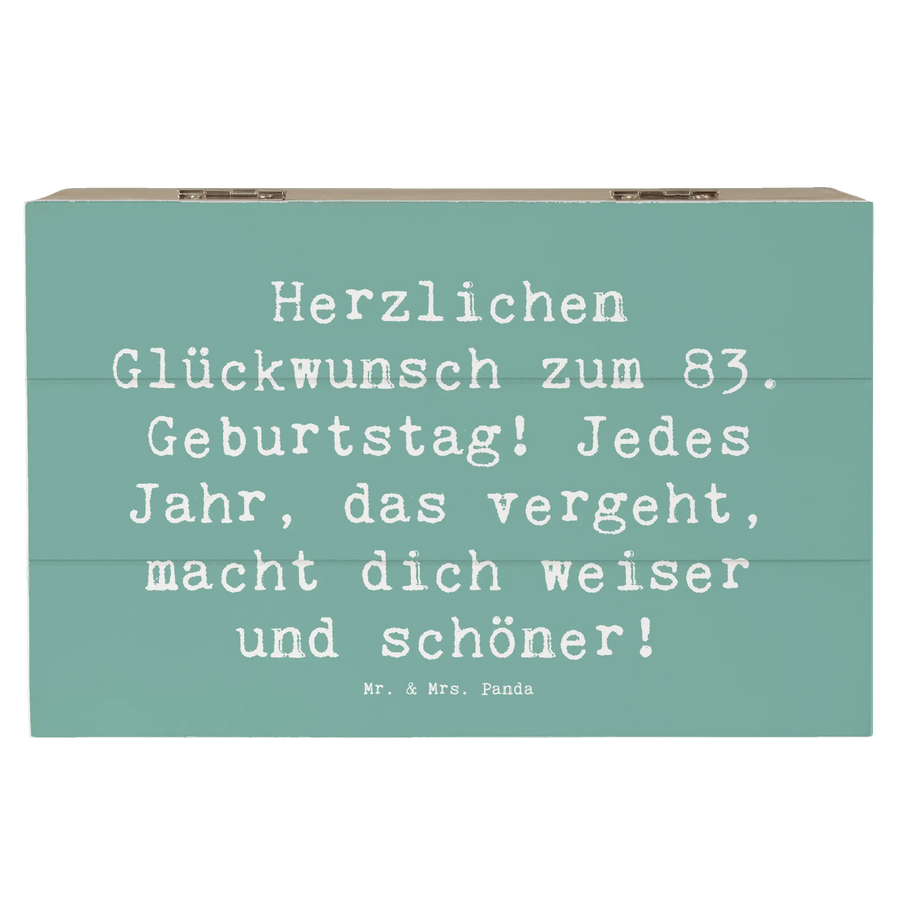 Entdecke die perfekt gestaltete Holzkiste zum 83. Geburtstag! Diese wunderschöne Erinnerungskiste von Mr. & Mrs. Panda ist mehr als nur eine Aufbewahrungsbox – sie ist ein Ort, an dem die kostbarsten Schätze aufbewahrt werden können. Ob du schöne Fotos, besondere Erinnerungsstücke oder Geschenke darin verstauen möchtest, diese Holzkiste ist der ideale Begleiter für alle, die das Leben lieben und schätzen. Mit dem charmanten Motiv und dem Spruch Herzlichen Glückwunsch zum 83. Geburtstag! Jedes Jahr, das vergeht, macht dich weiser und schöner! wird die Kiste zum Ausdruck der Zuneigung und Wertschätzung für einen ganz besonderen Menschen.