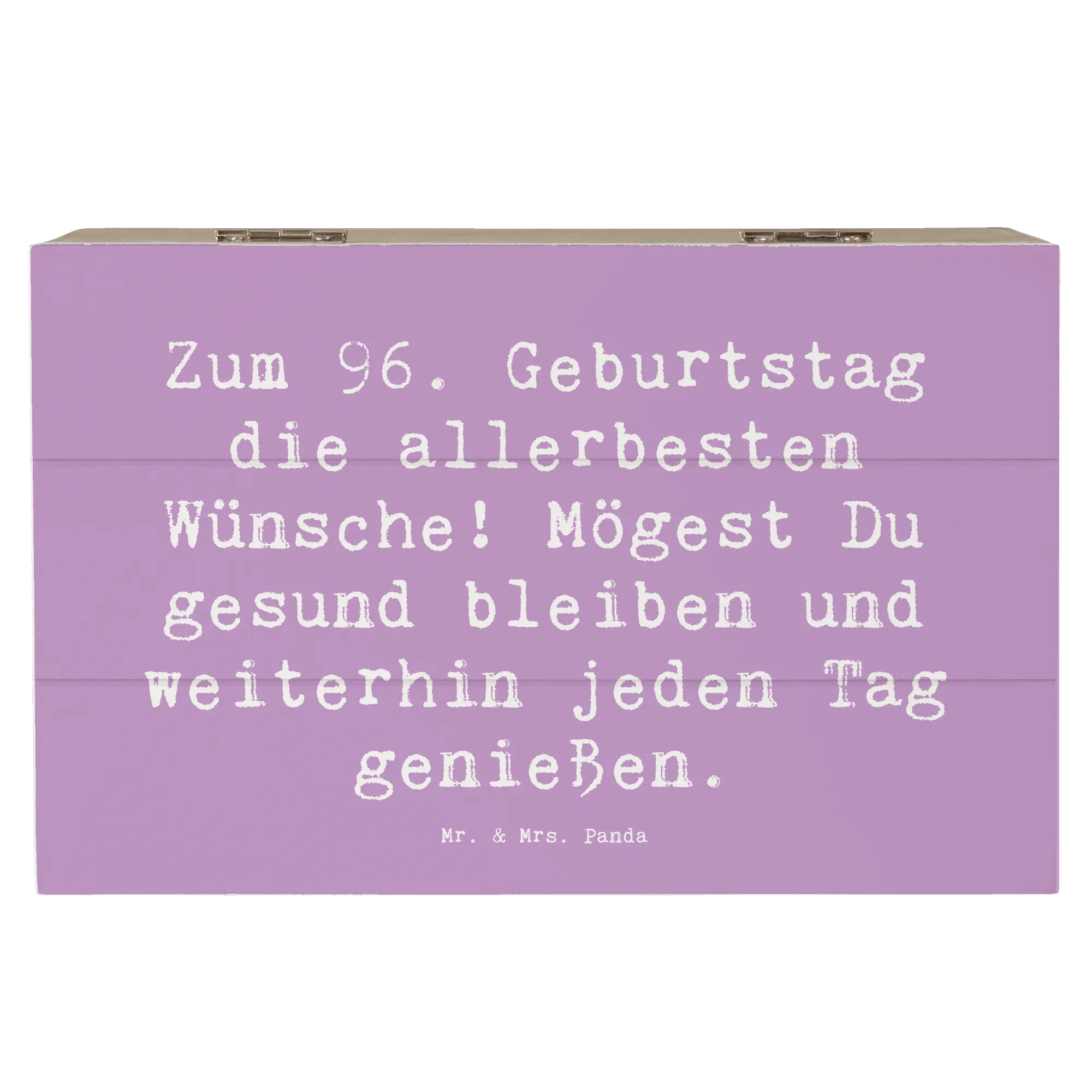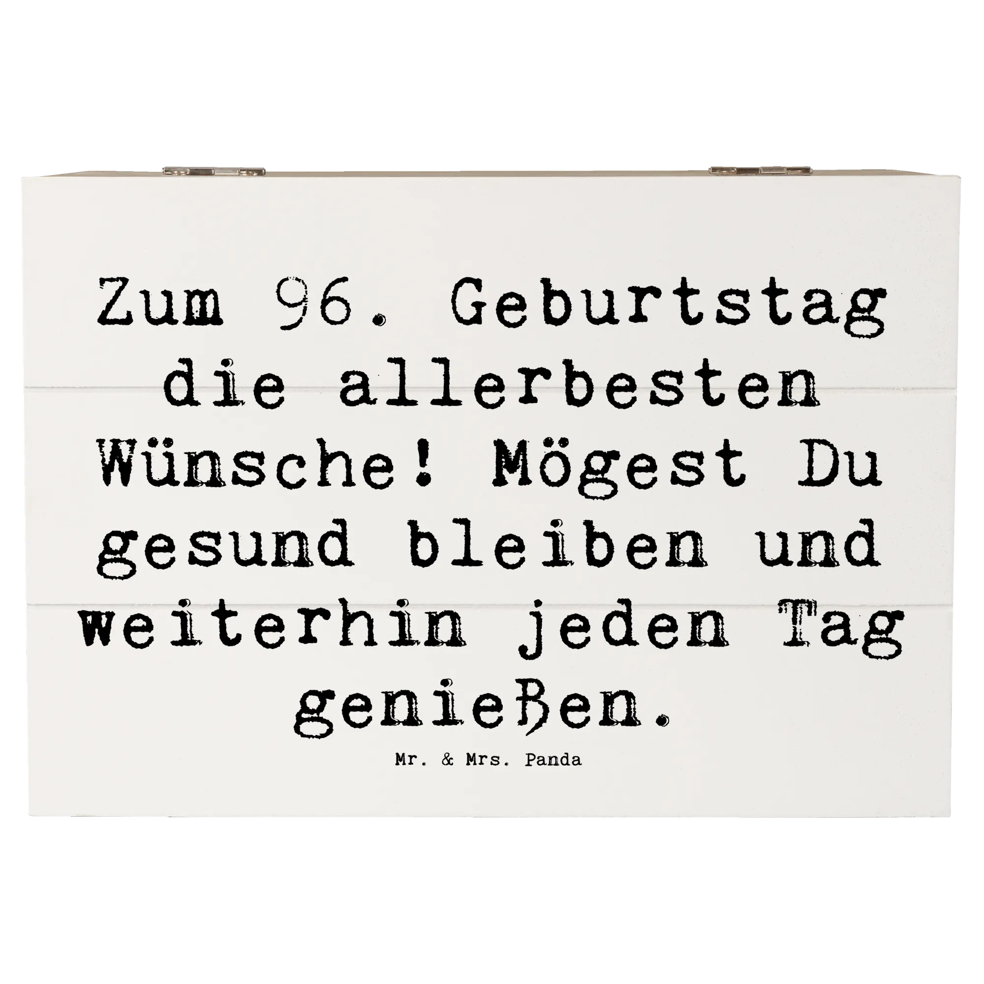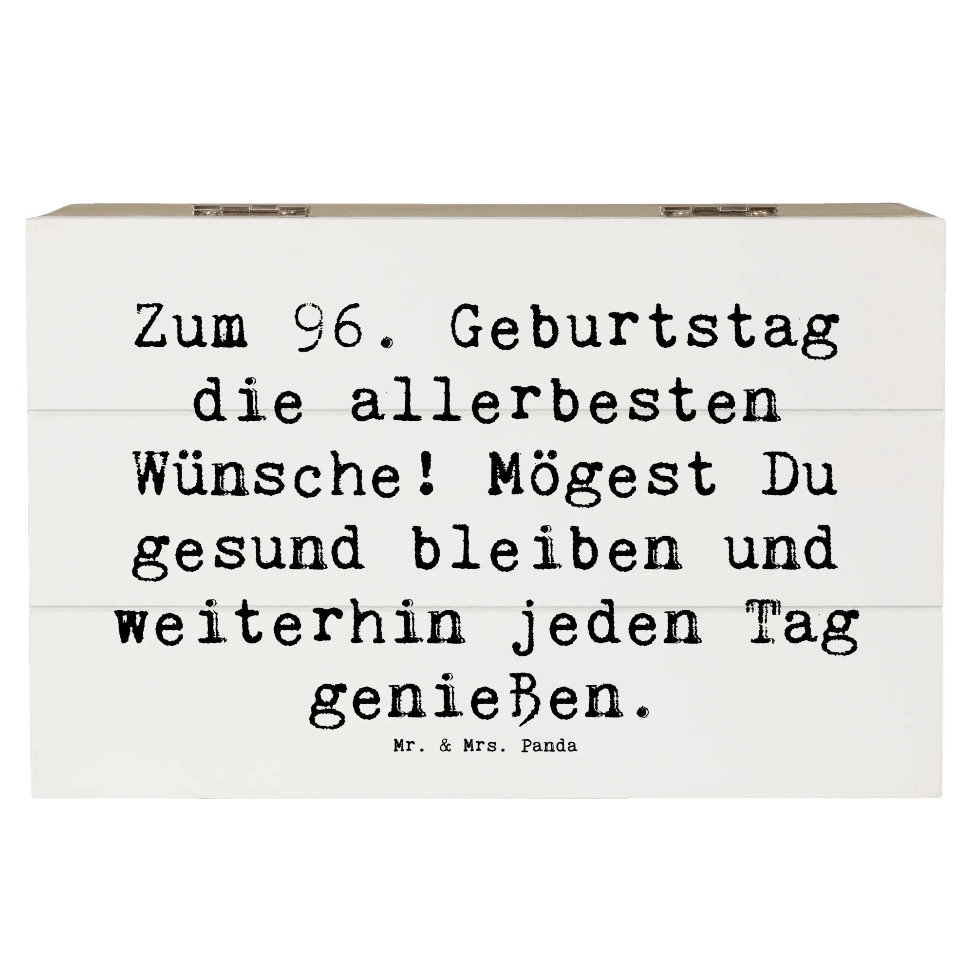 Die zauberhafte Holzkiste von Mr. & Mrs. Panda ist das perfekte Geschenk zum 96. Geburtstag! Mit ihrem liebevollen Design und dem Slogan "Zum 96. Geburtstag die allerbesten Wünsche! Mögest Du gesund bleiben und weiterhin jeden Tag genießen." wird diese Erinnerungskiste zu einem ganz besonderen Aufbewahrungsort für wundervolle Schätze.