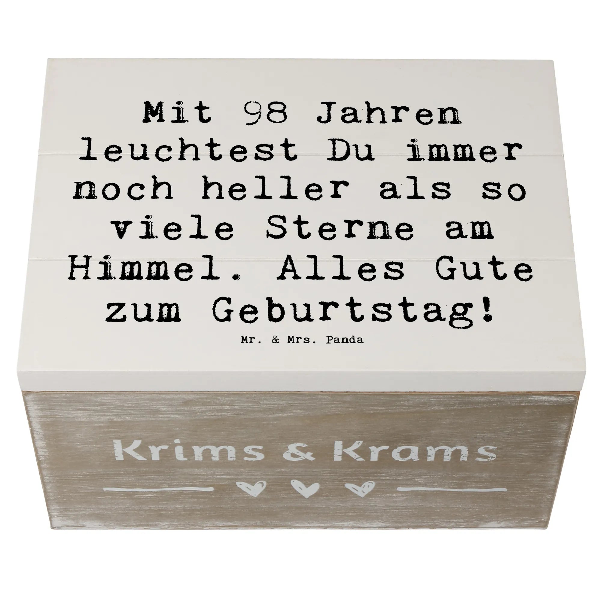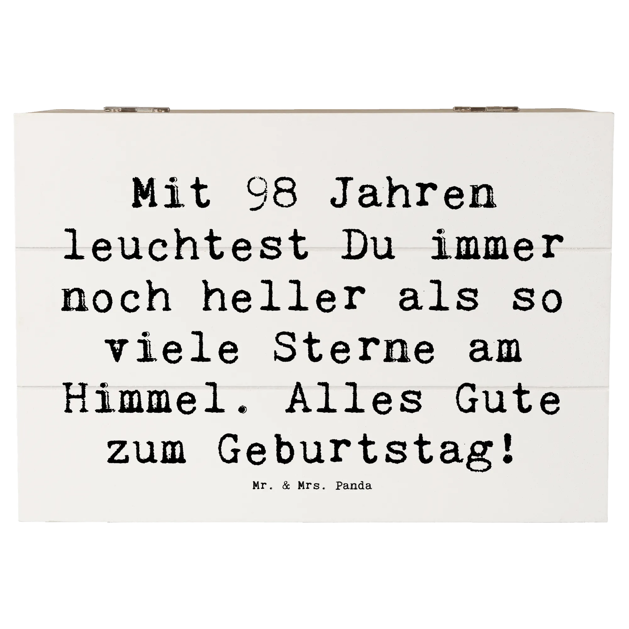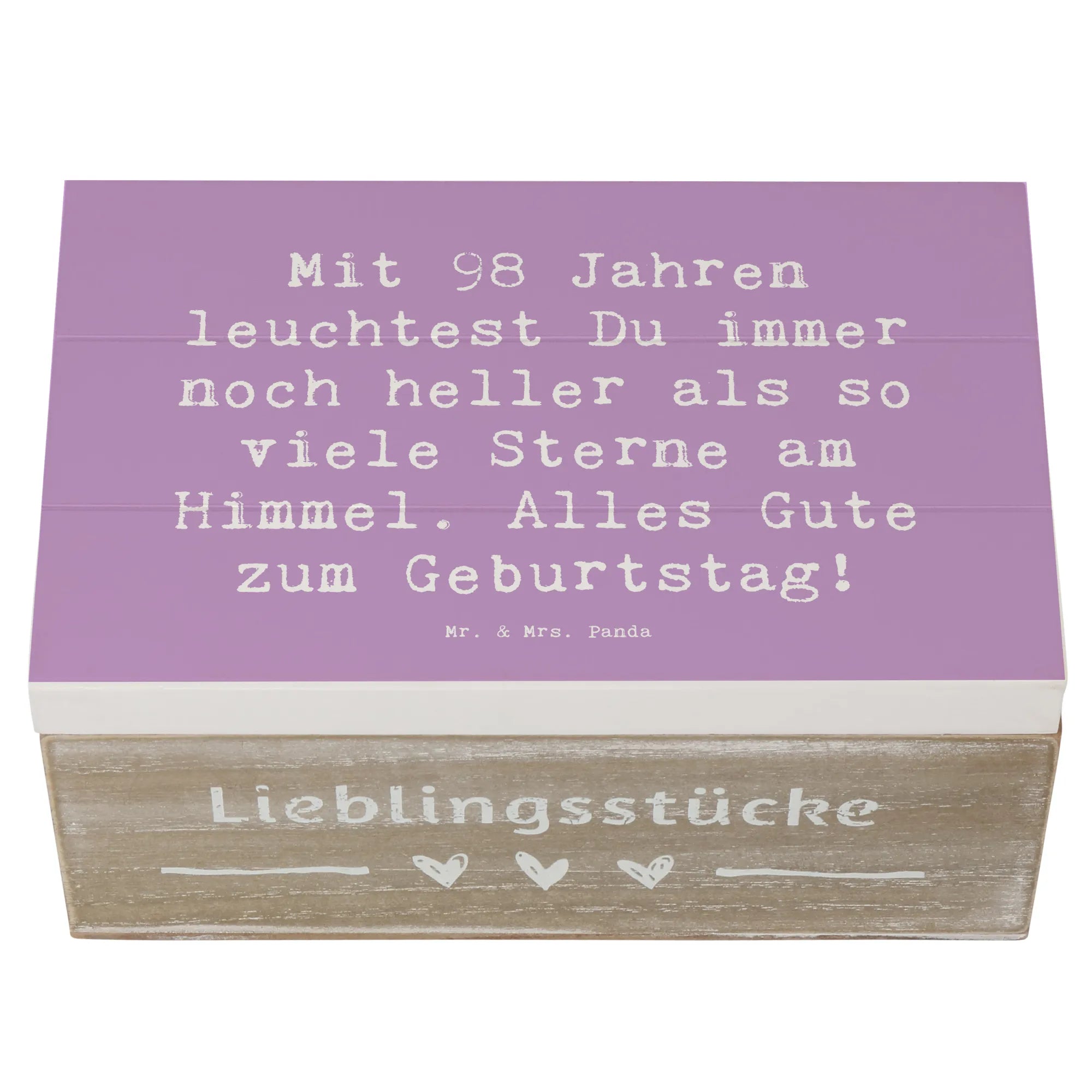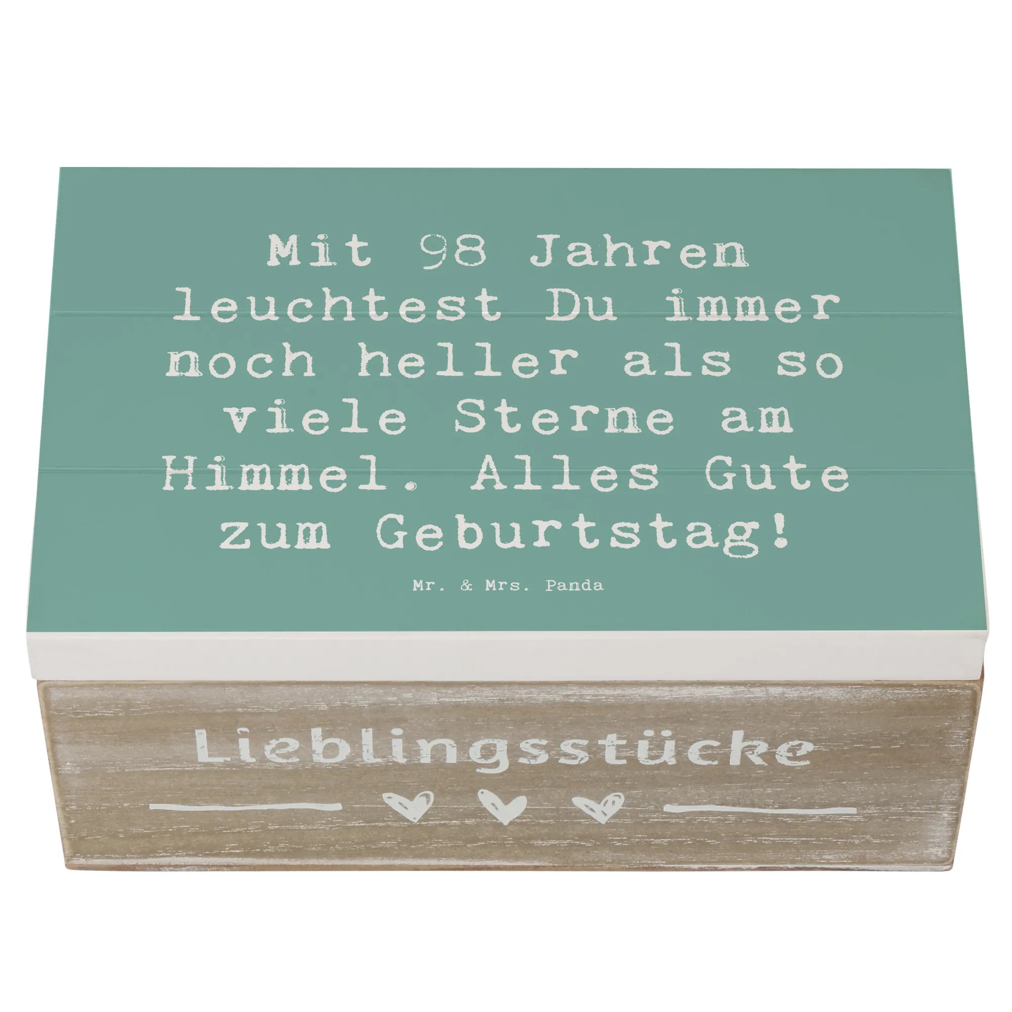 Entdecke die wunderschöne Holzkiste von Mr. & Mrs. Panda, die speziell für den 98. Geburtstag entworfen wurde! Mit dem liebevollen Spruch 'Mit 98 Jahren leuchtest Du immer noch heller als so viele Sterne am Himmel. Alles Gute zum Geburtstag!' wird diese Erinnerungskiste zu einem perfekten Geschenk für all jene, die das besondere Alter feiern.