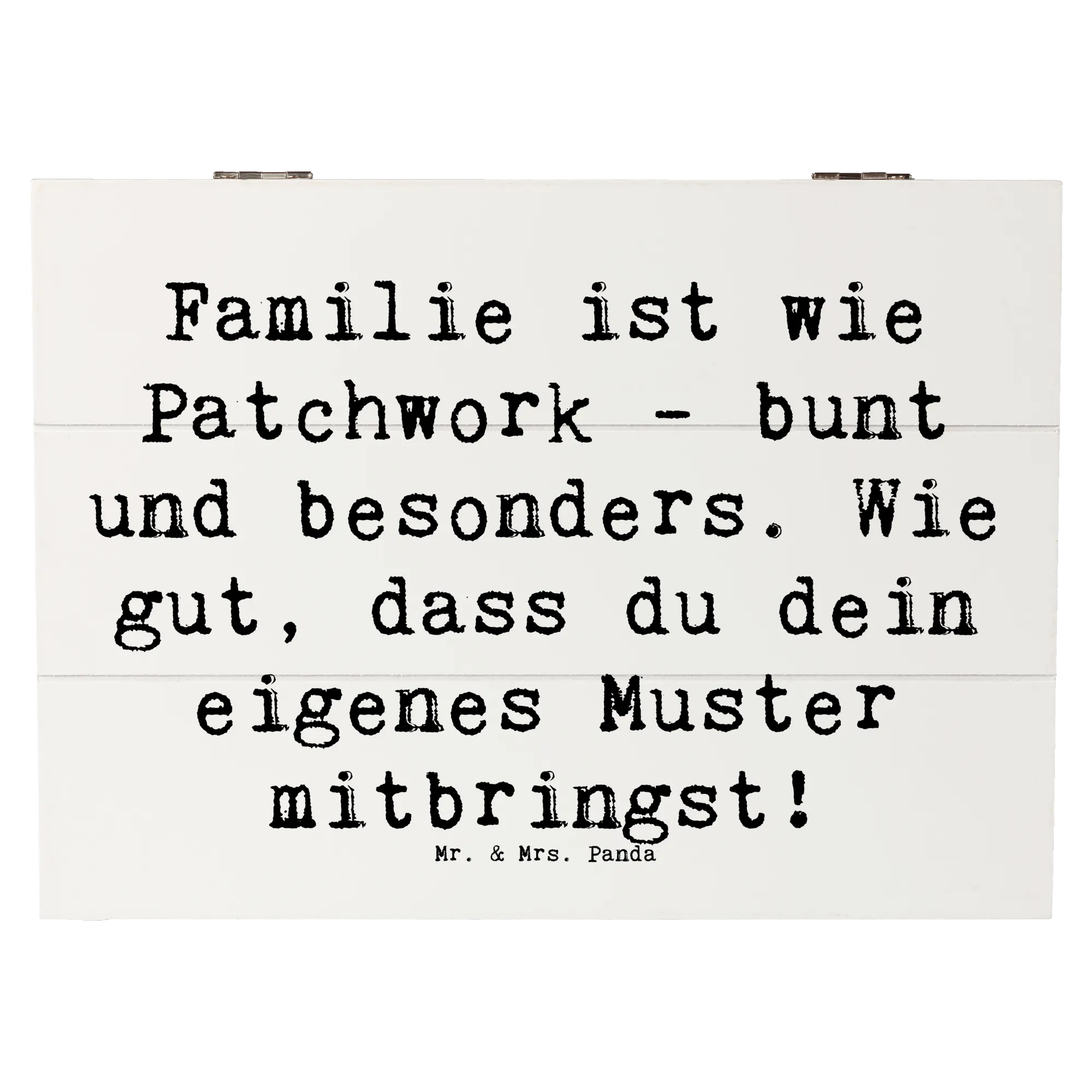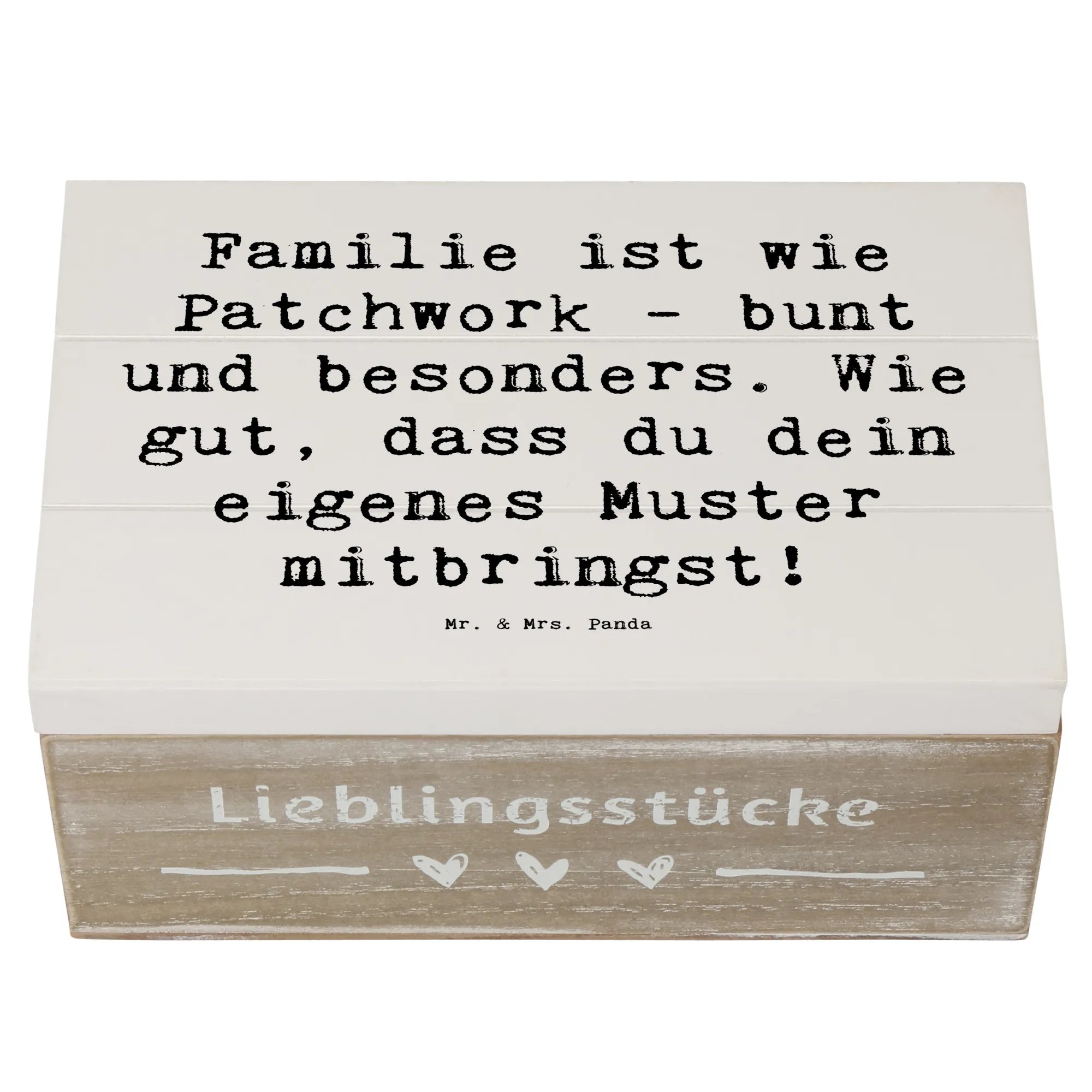 Der wunderbare Spruch "Familie ist wie Patchwork - bunt und besonders. Wie gut, dass du dein eigenes Muster mitbringst!" ziert den Deckel dieser Kiste und erinnert an die einzigartigen Familienbande, die durch Adoption entstehen. Dieses Motto ist nicht nur ein schöner Gedanke, sondern unterstreicht auch die Liebe und den Zusammenhalt, die in einer Patchworkfamilie bestehen.