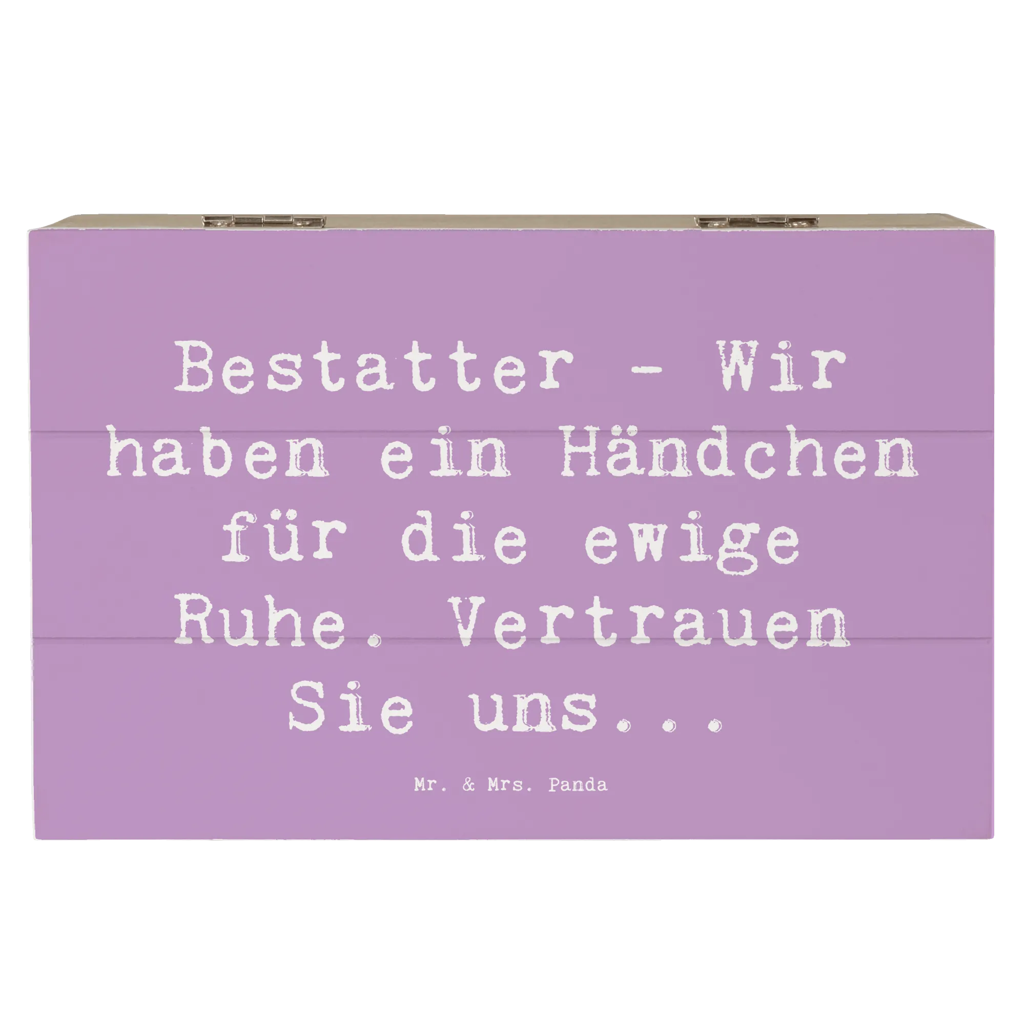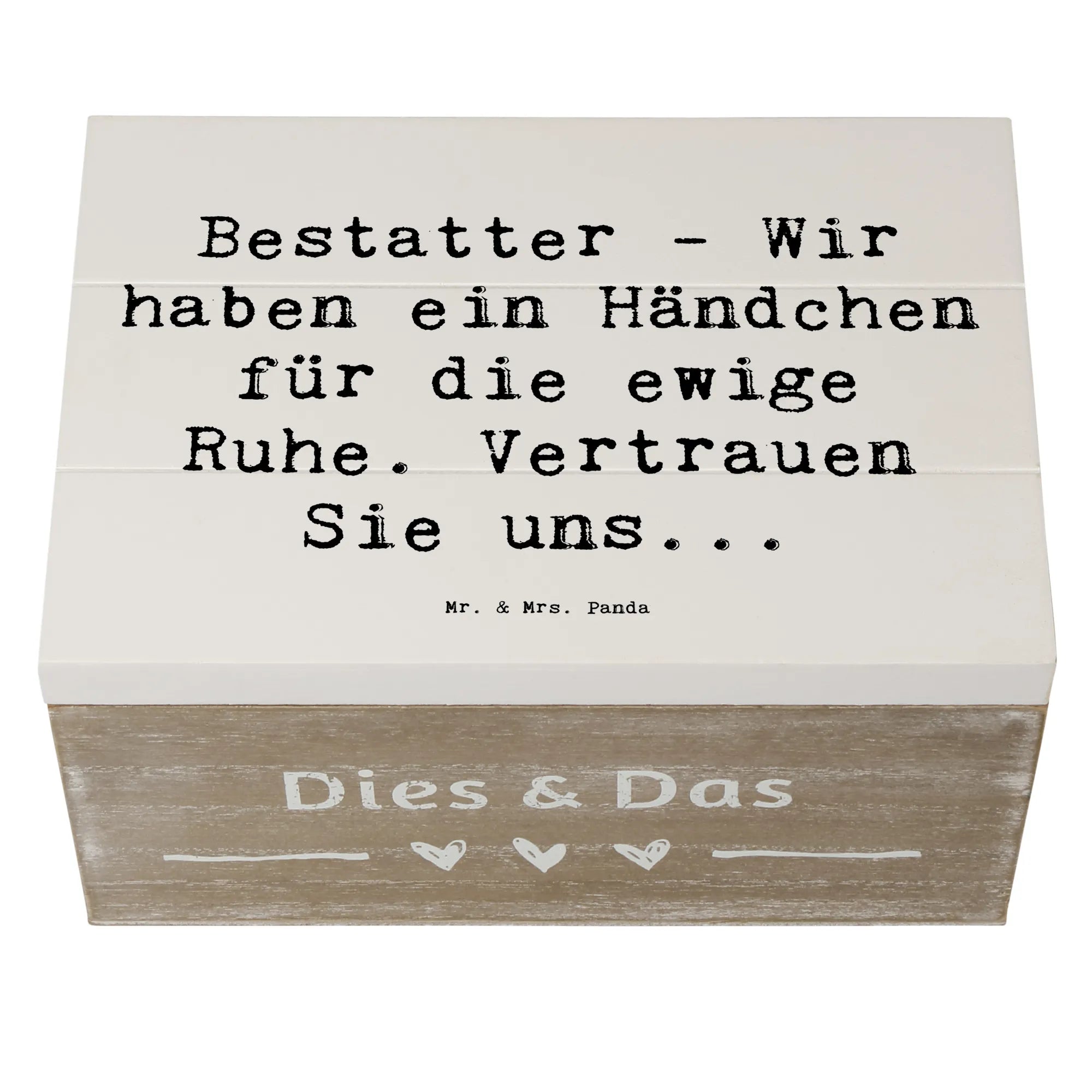 Entdecke die zauberhafte Holzkiste von Mr. & Mrs. Panda! Dieser liebevoll gestaltete Aufbewahrungsort ist nicht nur eine praktische Geschenkbox, sondern auch eine wunderschöne Erinnerungskiste, die mit einem einzigartigen Motiv für Bestatter bedruckt ist: "Bestatter - Wir haben ein Händchen für die ewige Ruhe. Vertrauen Sie uns...". Ob als Erinnerungskiste für besondere Momente wie die Kommunion, Konfirmation oder als Aufbewahrung für wertvolle Fotos – diese Kiste ist ein perfekter Begleiter für all deine Schätze.