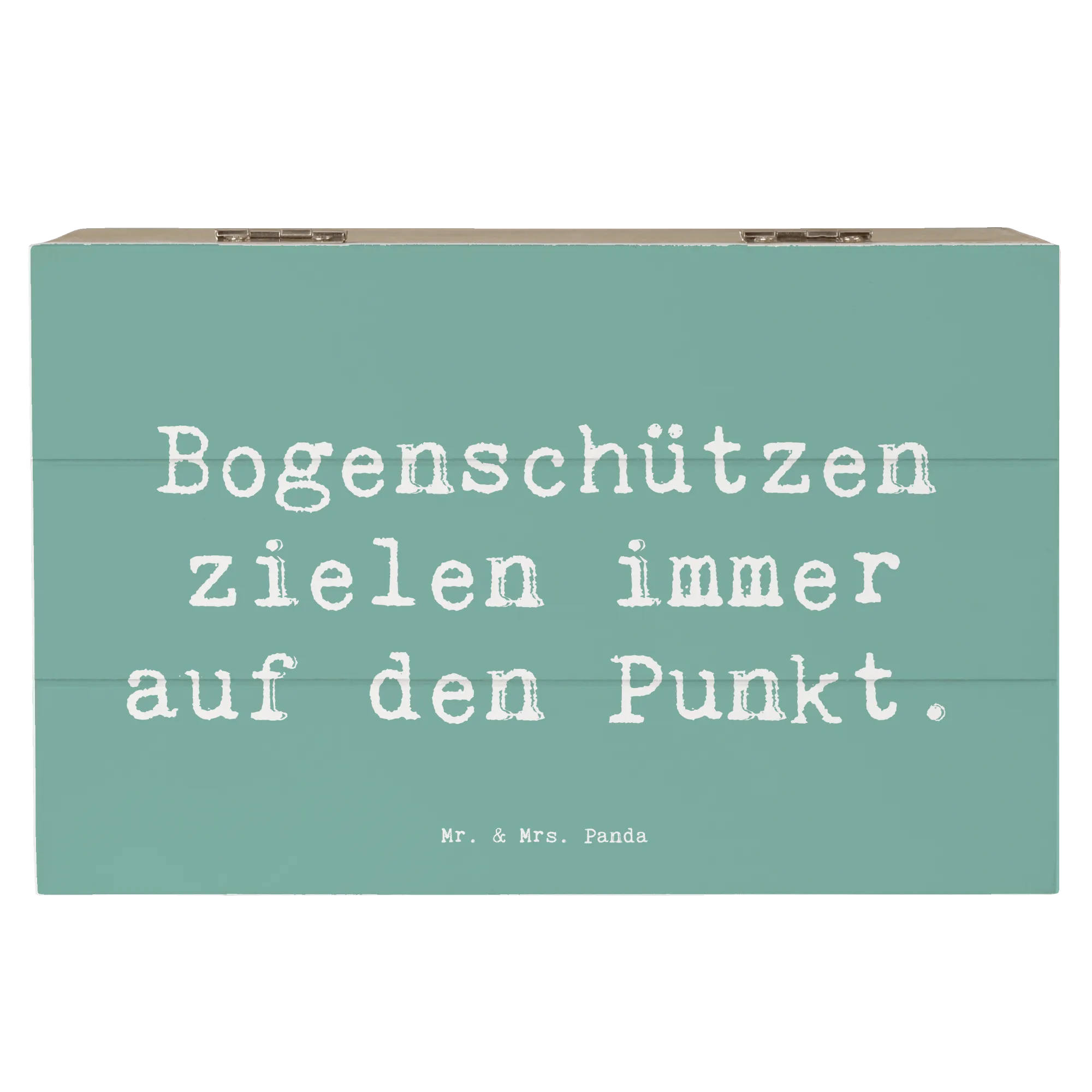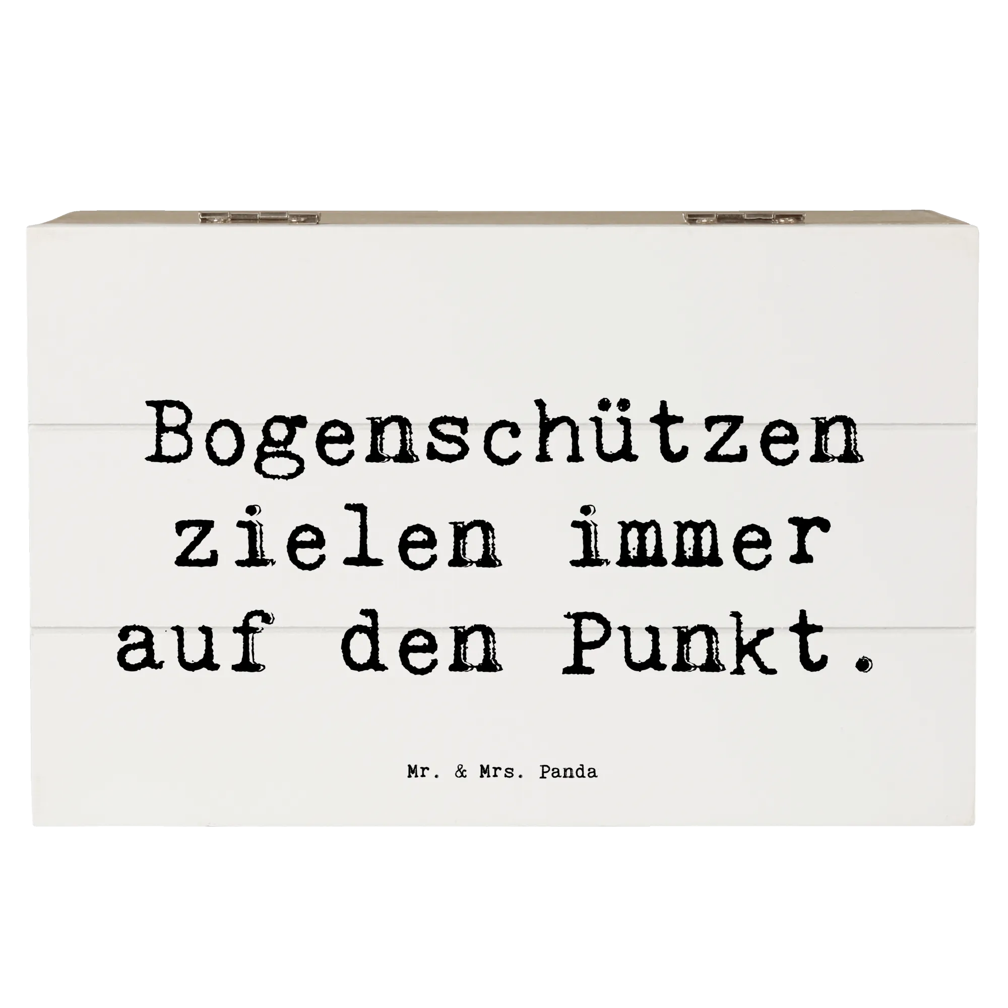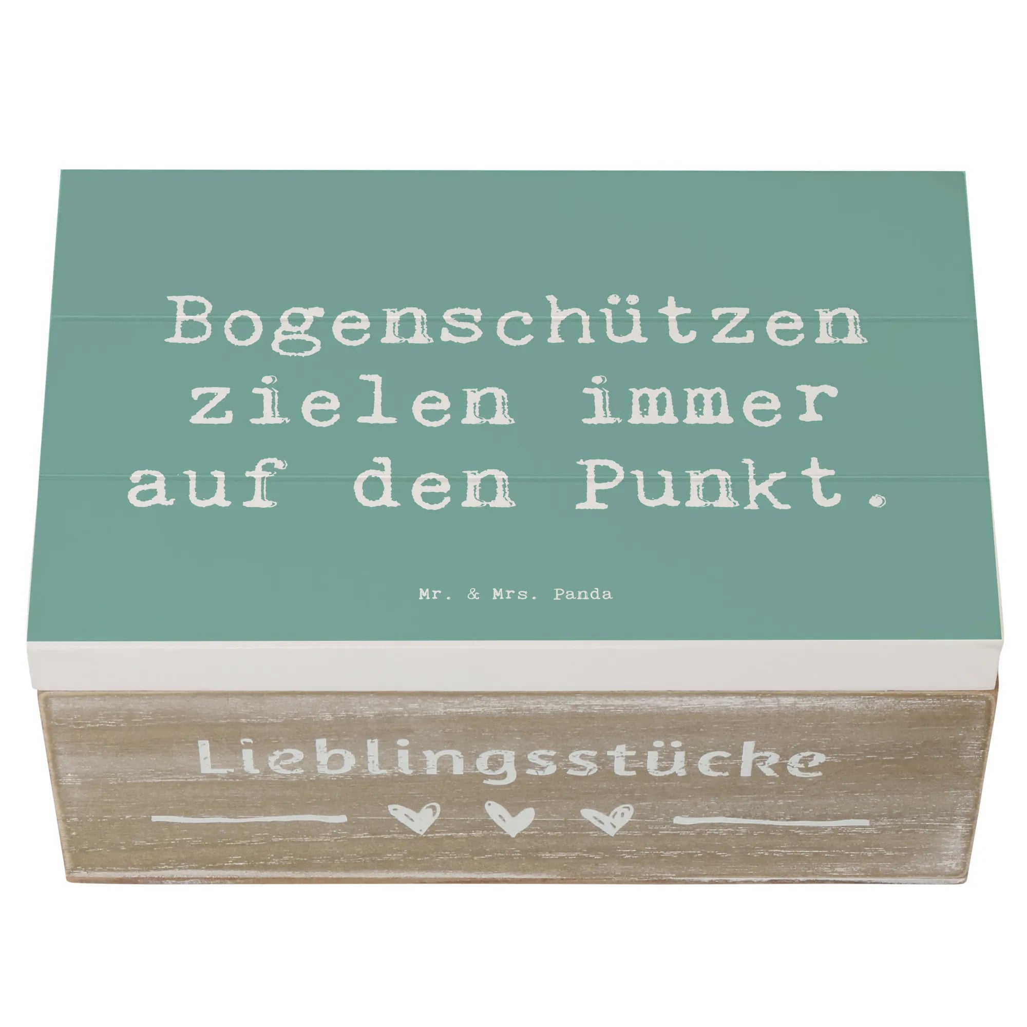 "Bogenschützen zielen immer auf den Punkt" – dieser Spruch ziert die Kiste und macht sie zu einem liebenswerten und charaktervollen Geschenk für jeden Bogensport-Enthusiasten.